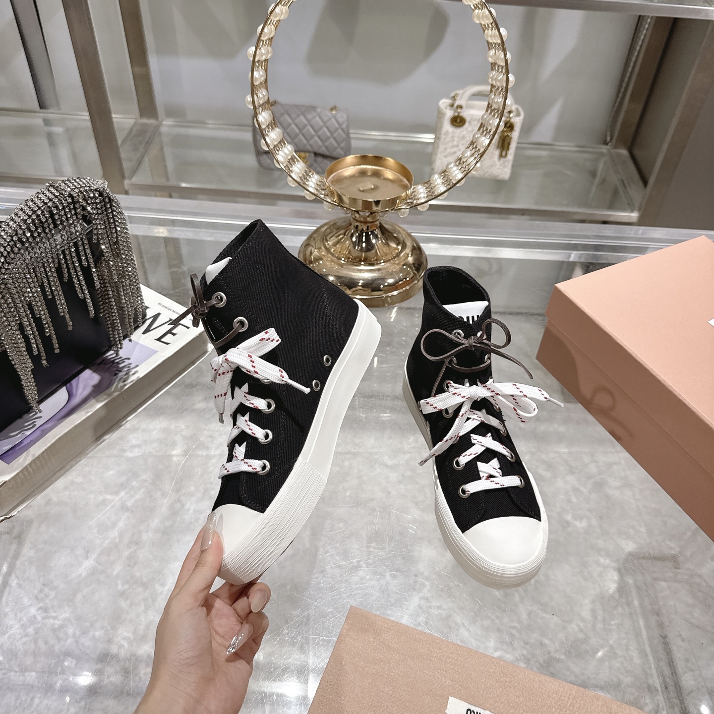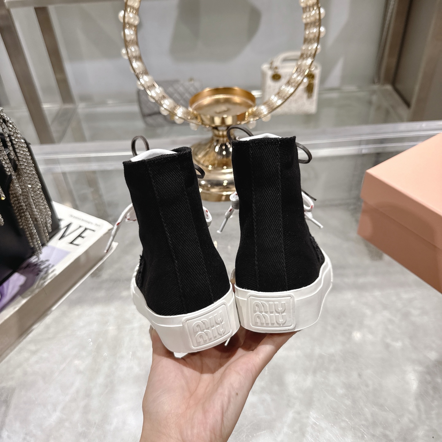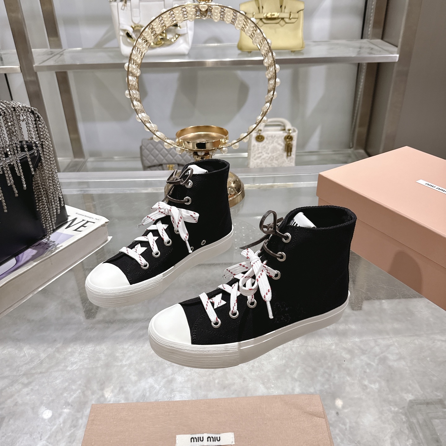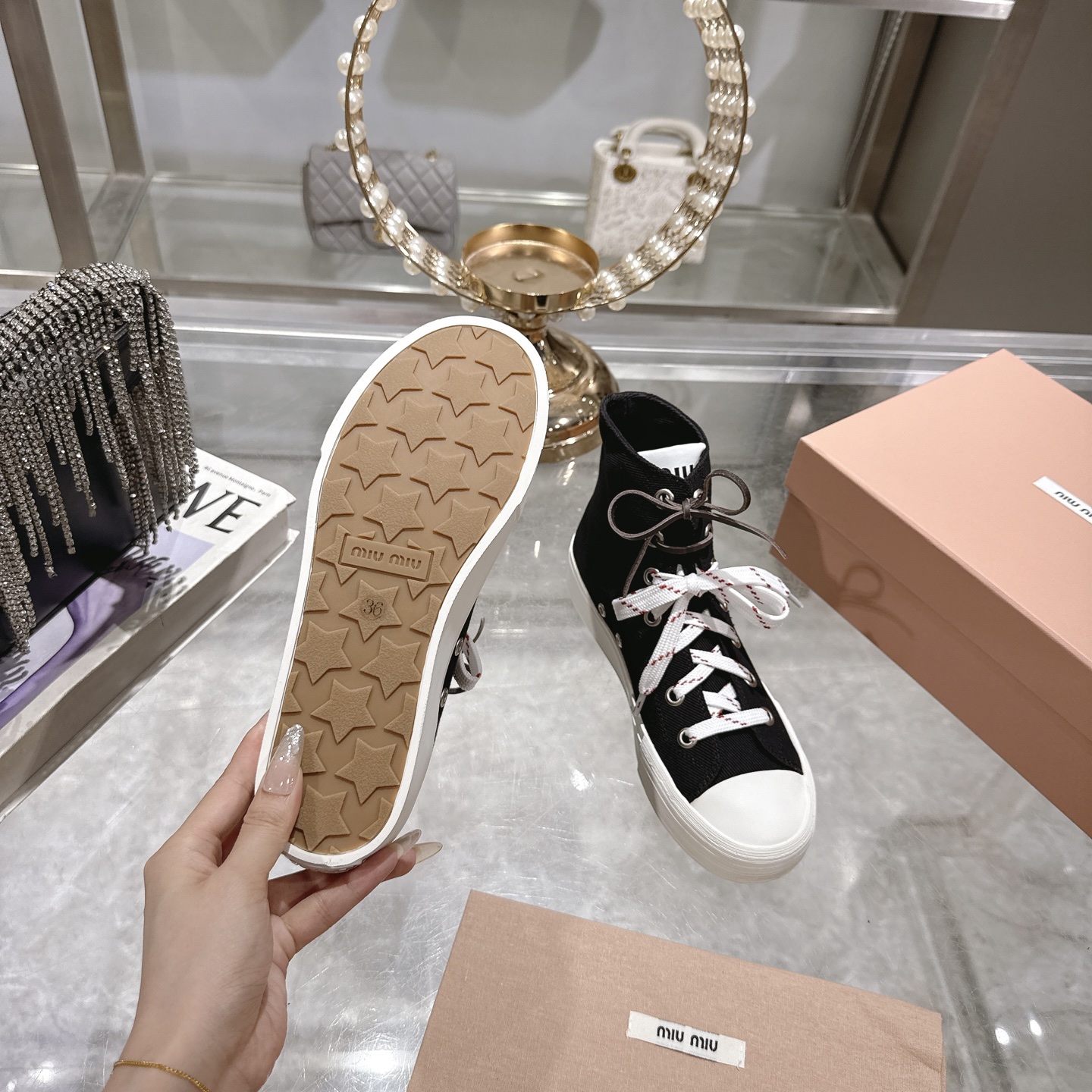 这款鞋子是AAAAA 1:1 质量 (非常棒). 使用了和原版一模一样的材料. 商标部分也保持了和缪缪/Miu Miu一样. 图片拍摄是实物鞋子拍摄, 您所收到的实物保证和我们图片一模一样.