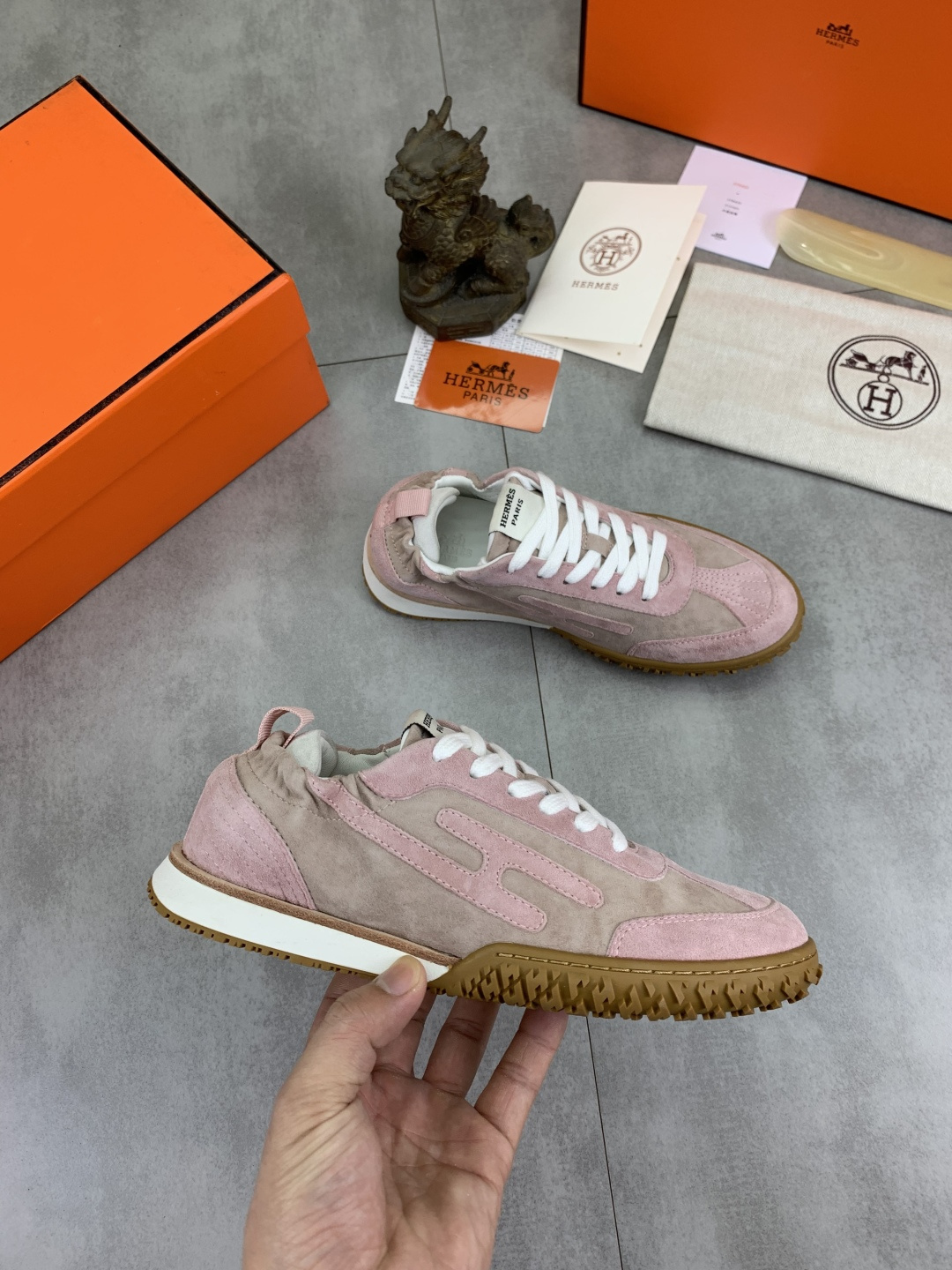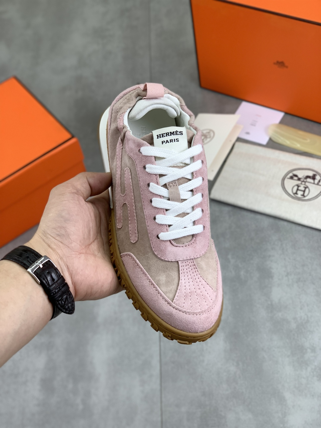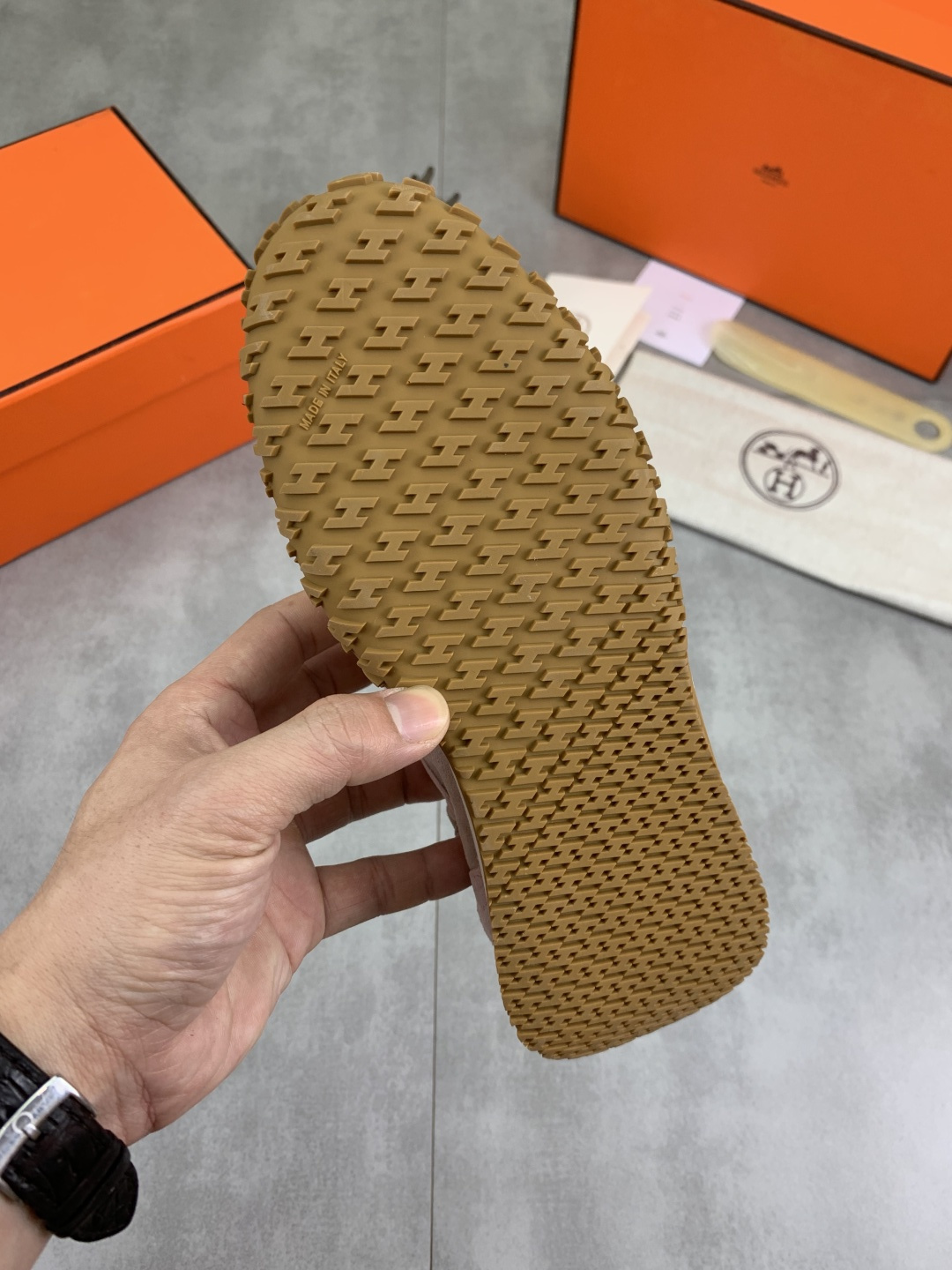 这款鞋子是AAAAA 1:1 质量 (非常棒). 使用了和原版一模一样的材料. 商标部分也保持了和爱马仕/Hermes一样. 图片拍摄是实物鞋子拍摄, 您所收到的实物保证和我们图片一模一样.