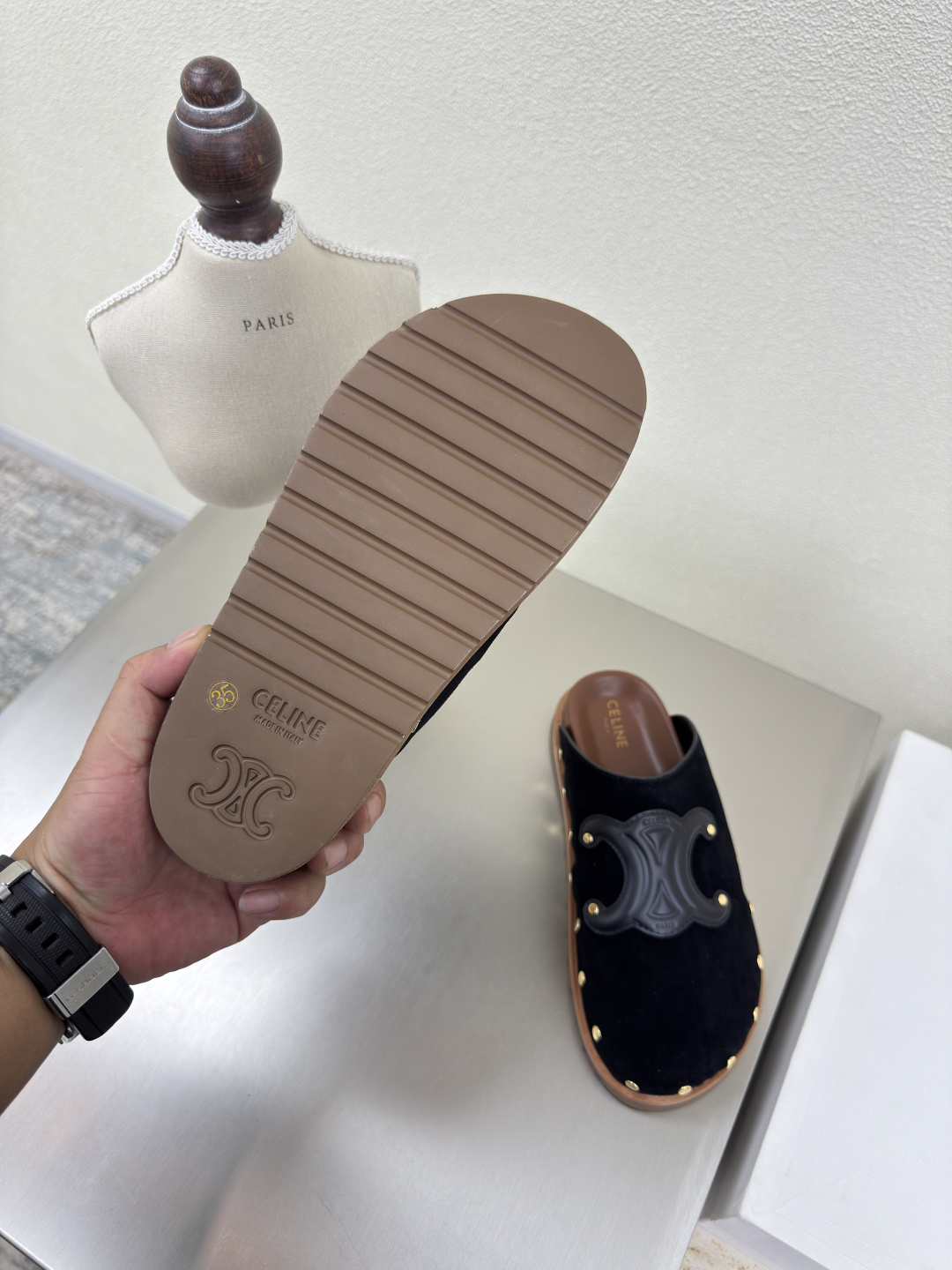 这款鞋子是AAAAA 1:1 质量 (非常棒). 使用了和原版一模一样的材料. 商标部分也保持了和思琳/Celine一样. 图片拍摄是实物鞋子拍摄, 您所收到的实物保证和我们图片一模一样.