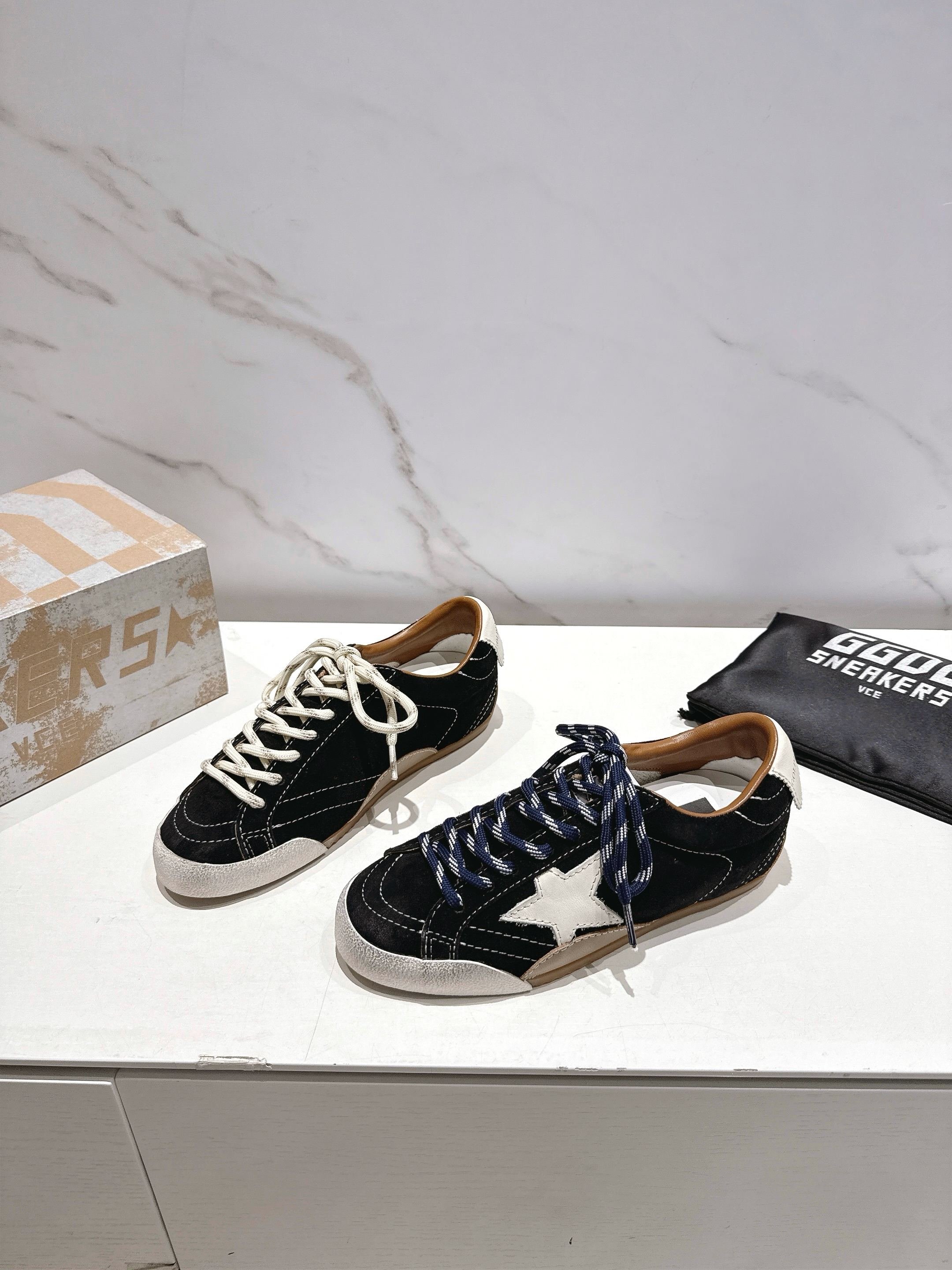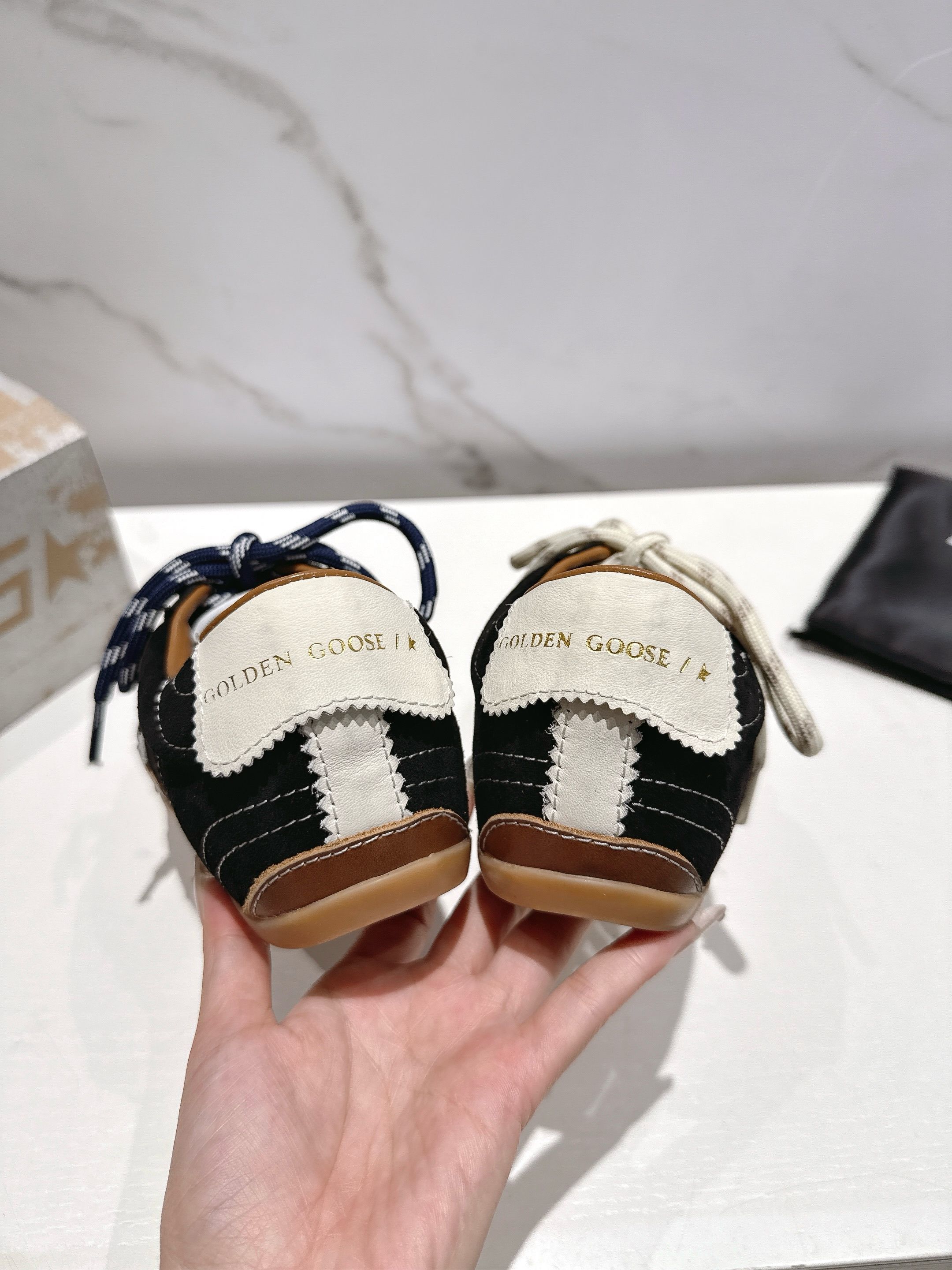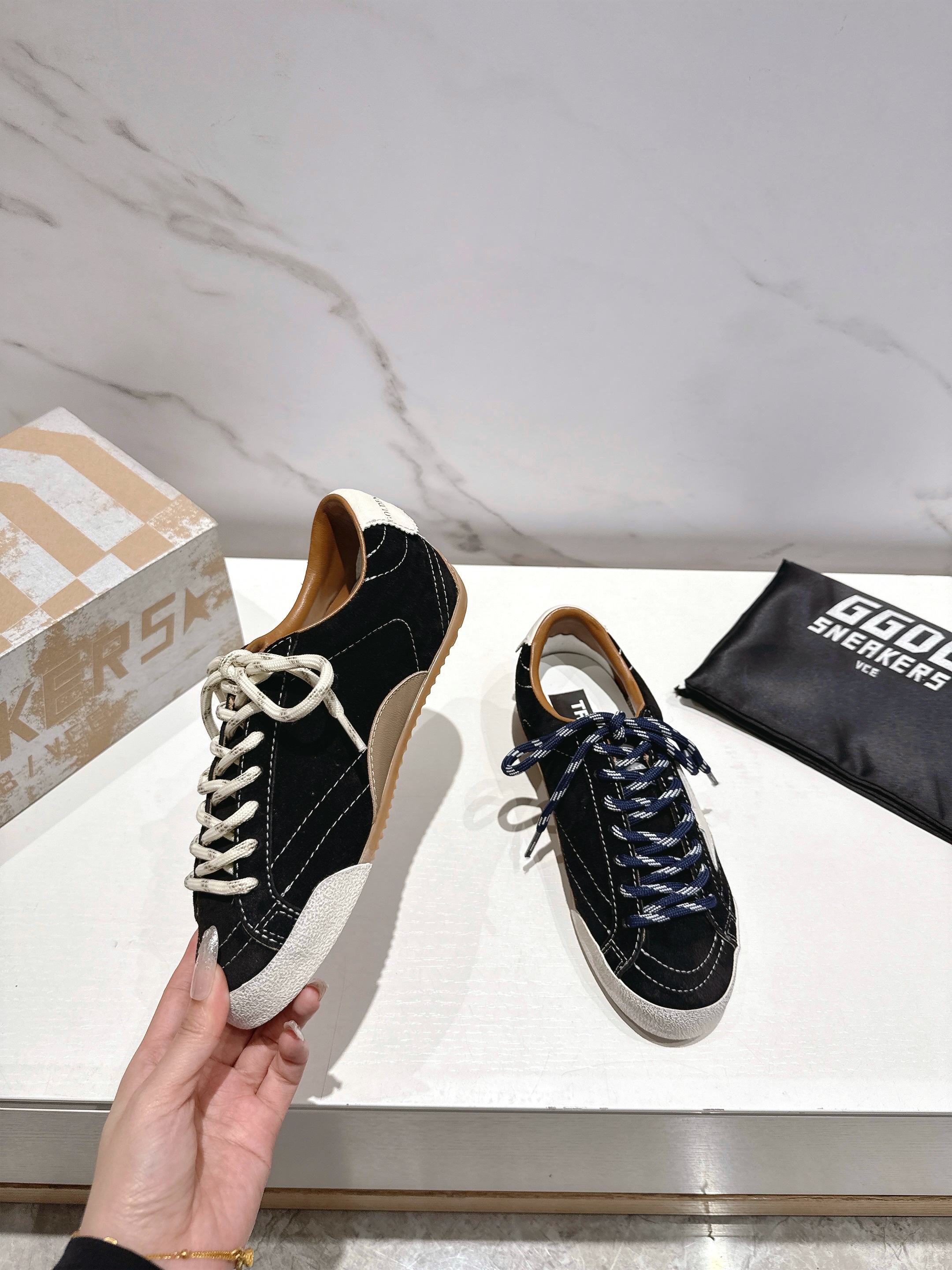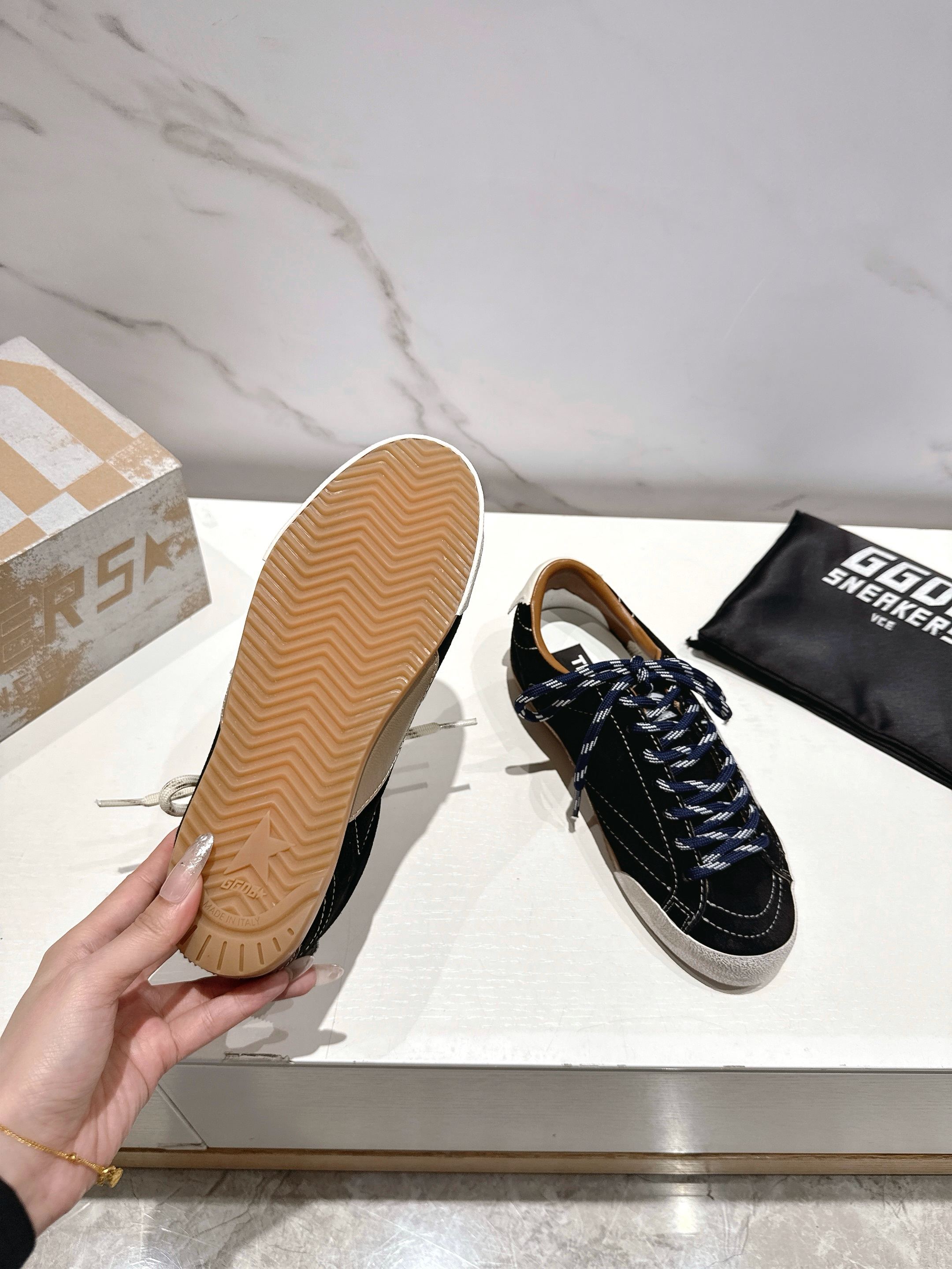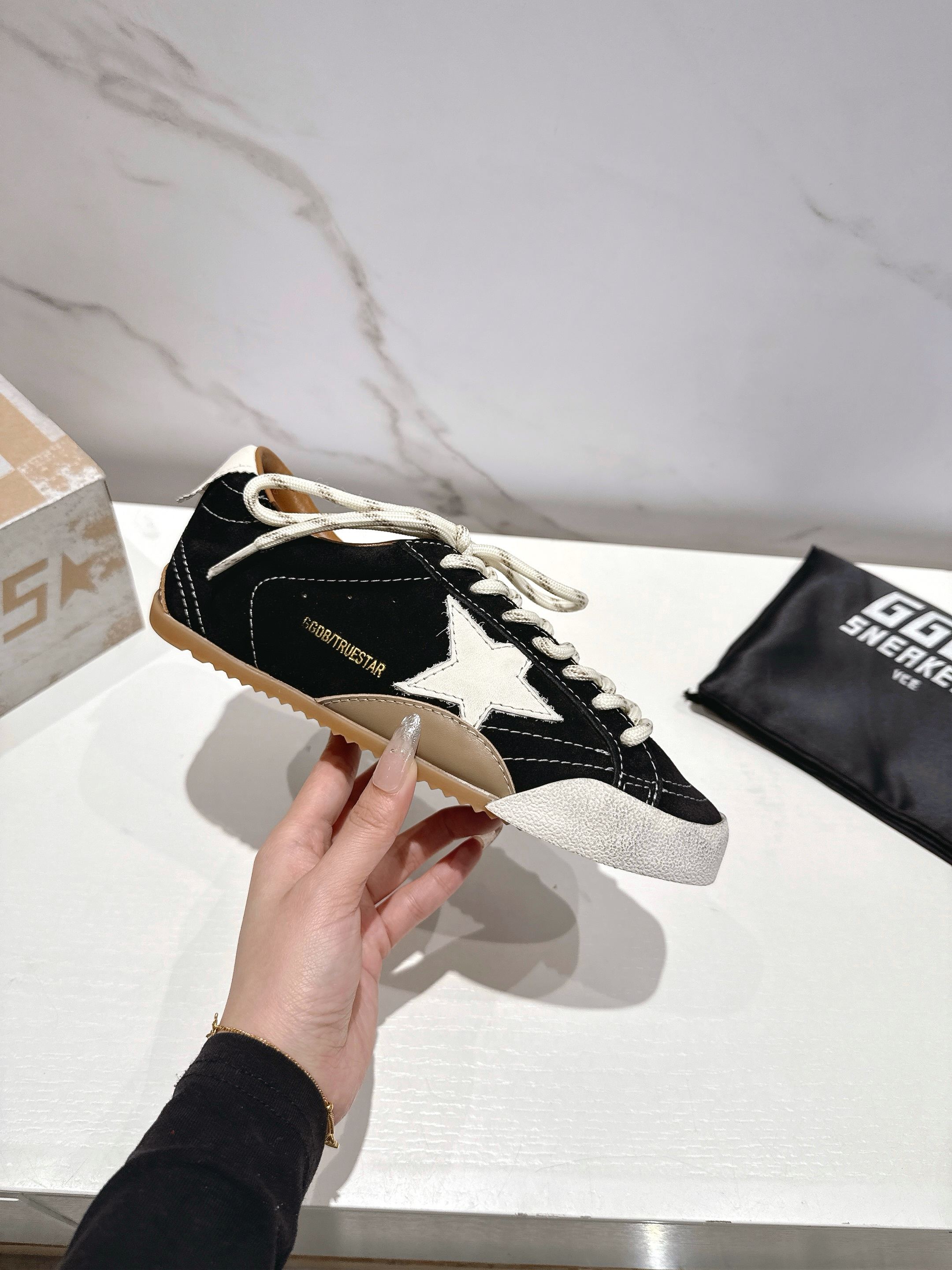 这款鞋子是AAAAA 1:1 质量 (非常棒). 使用了和原版一模一样的材料. 商标部分也保持了和Golden Goose一样. 图片拍摄是实物鞋子拍摄, 您所收到的实物保证和我们图片一模一样.