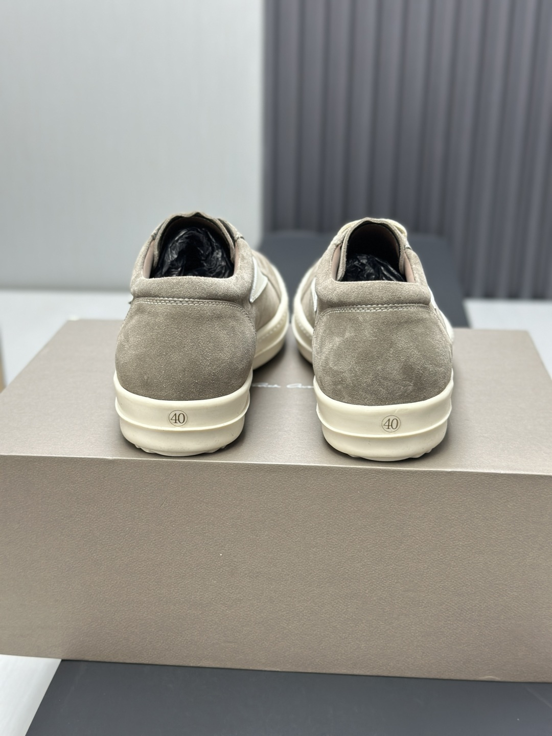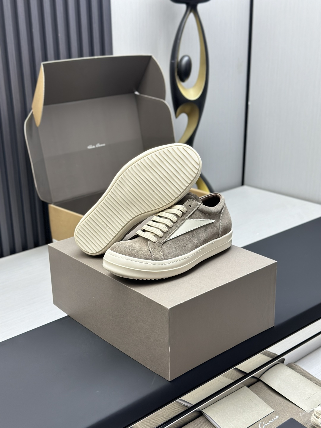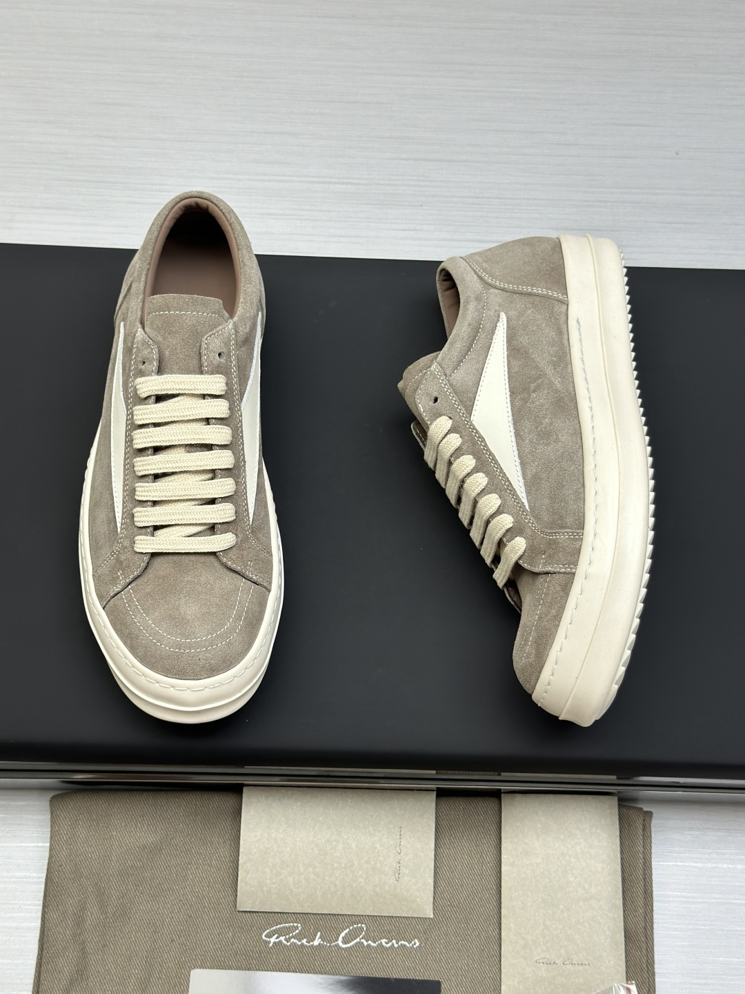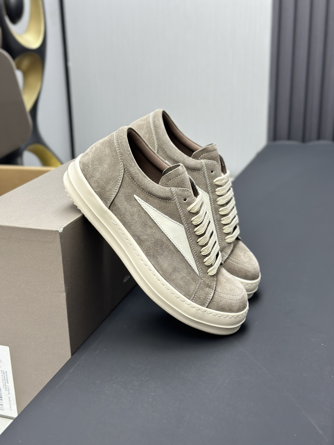 这款鞋子是AAAAA 1:1 质量 (非常棒). 使用了和原版一模一样的材料. 商标部分也保持了和里克·欧文斯/Rick Owens一样. 图片拍摄是实物鞋子拍摄, 您所收到的实物保证和我们图片一模一样.