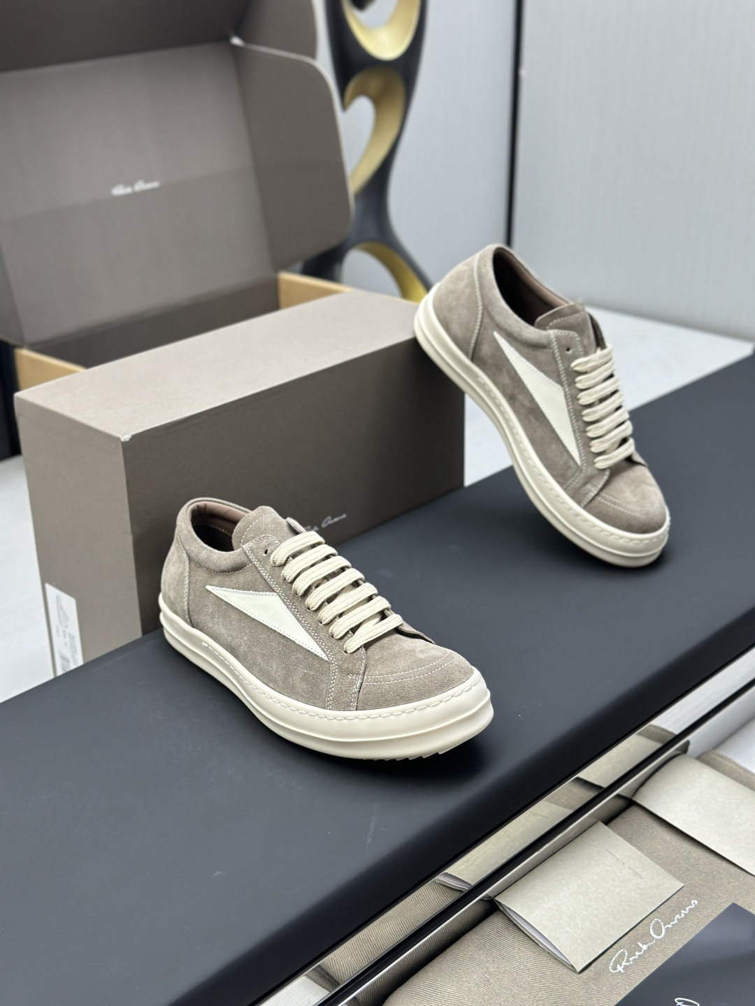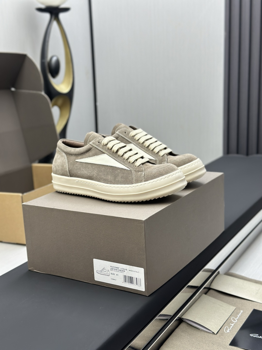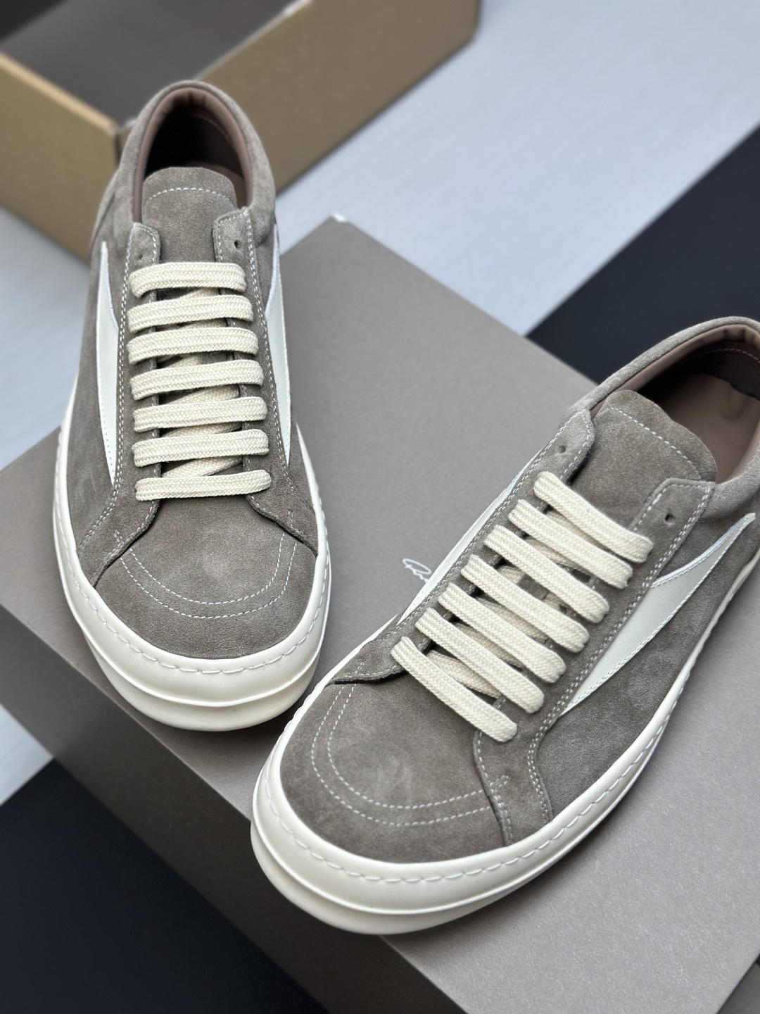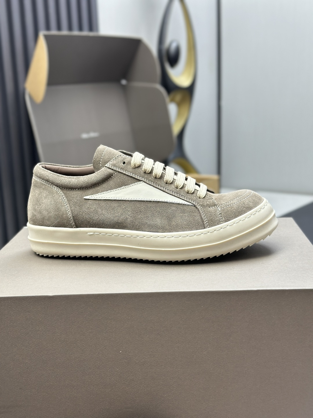 这款鞋子是AAAAA 1:1 质量 (非常棒). 使用了和原版一模一样的材料. 商标部分也保持了和里克·欧文斯/Rick Owens一样. 图片拍摄是实物鞋子拍摄, 您所收到的实物保证和我们图片一模一样.