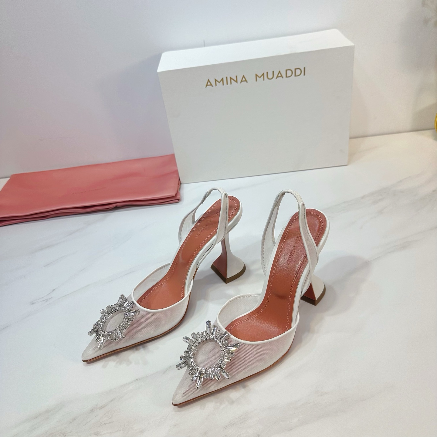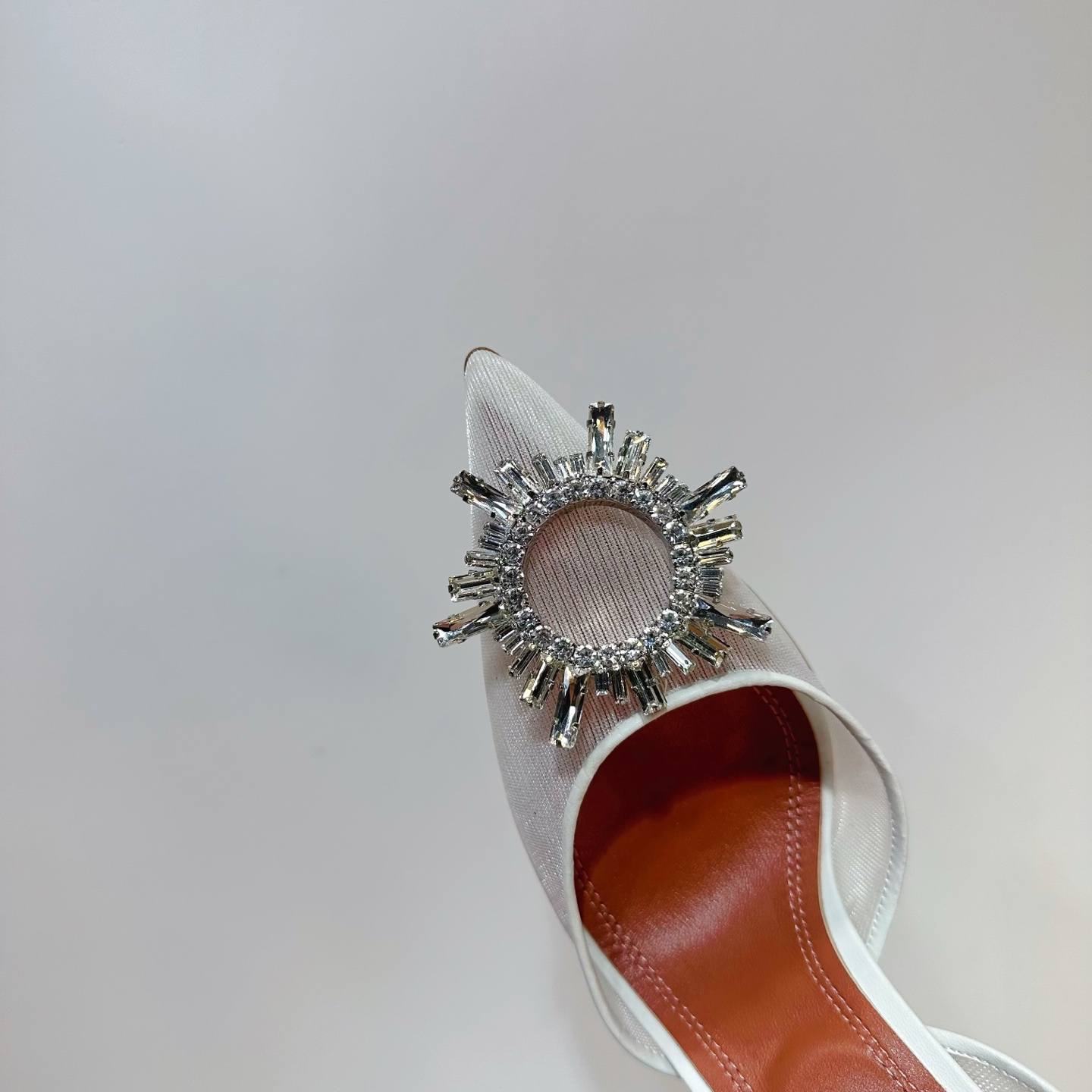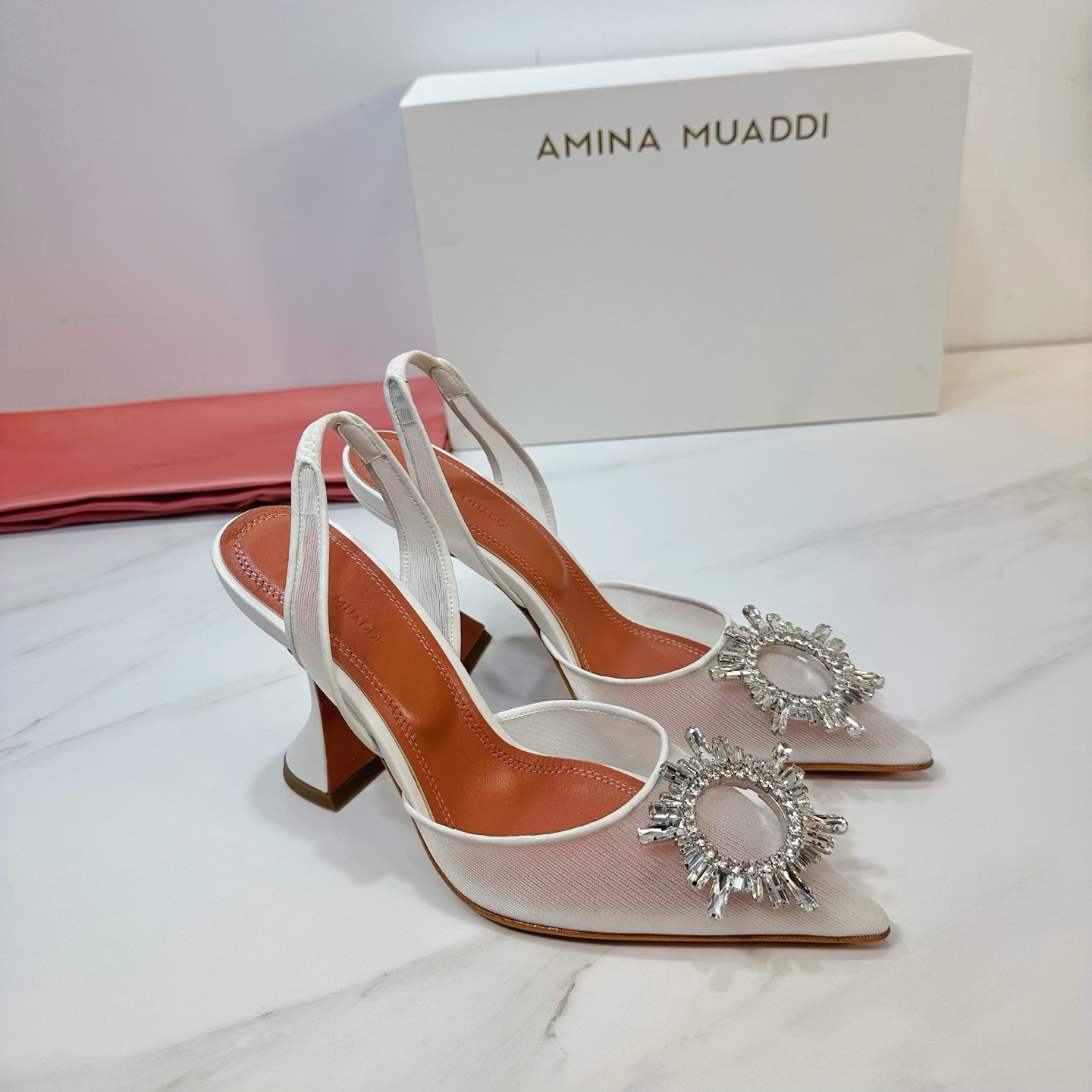 这款鞋子是AAAAA 1:1 质量 (非常棒). 使用了和原版一模一样的材料. 商标部分也保持了和Amina Muaddi一样. 图片拍摄是实物鞋子拍摄, 您所收到的实物保证和我们图片一模一样.