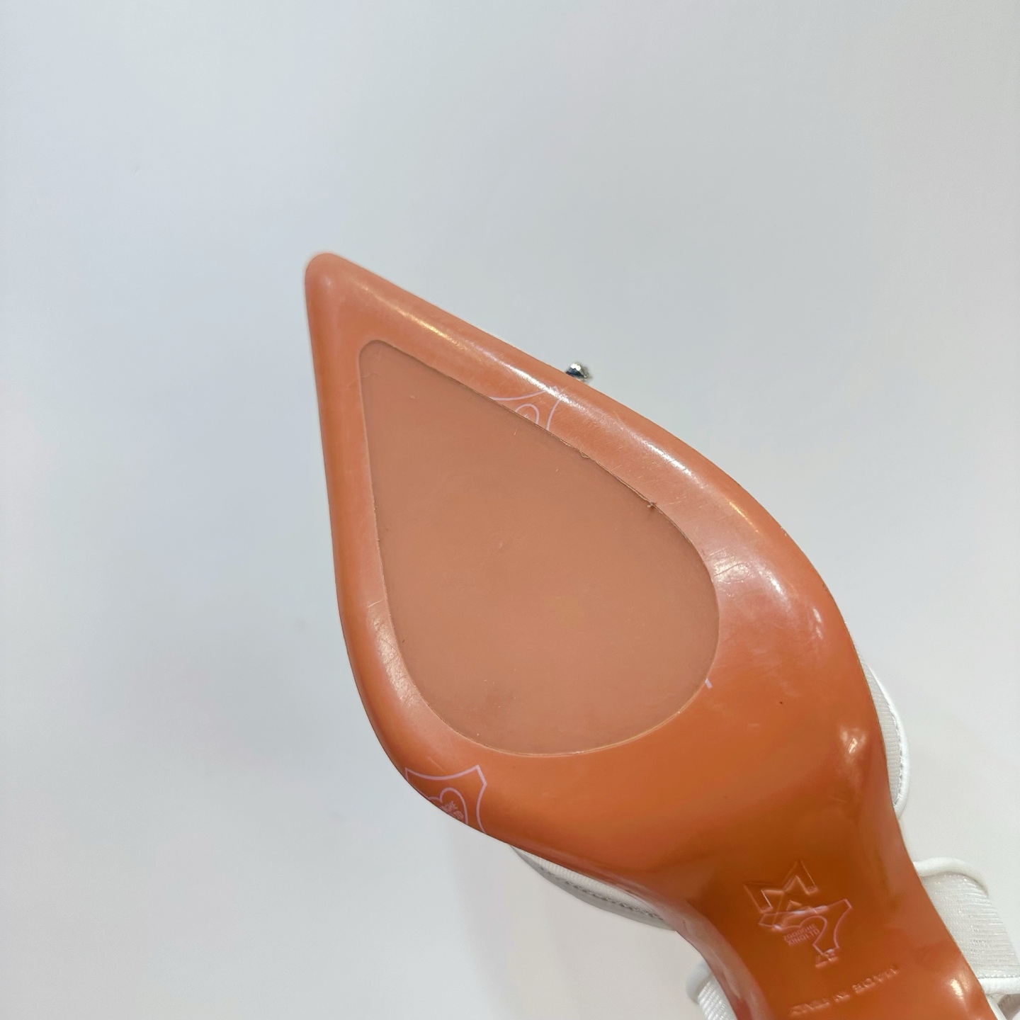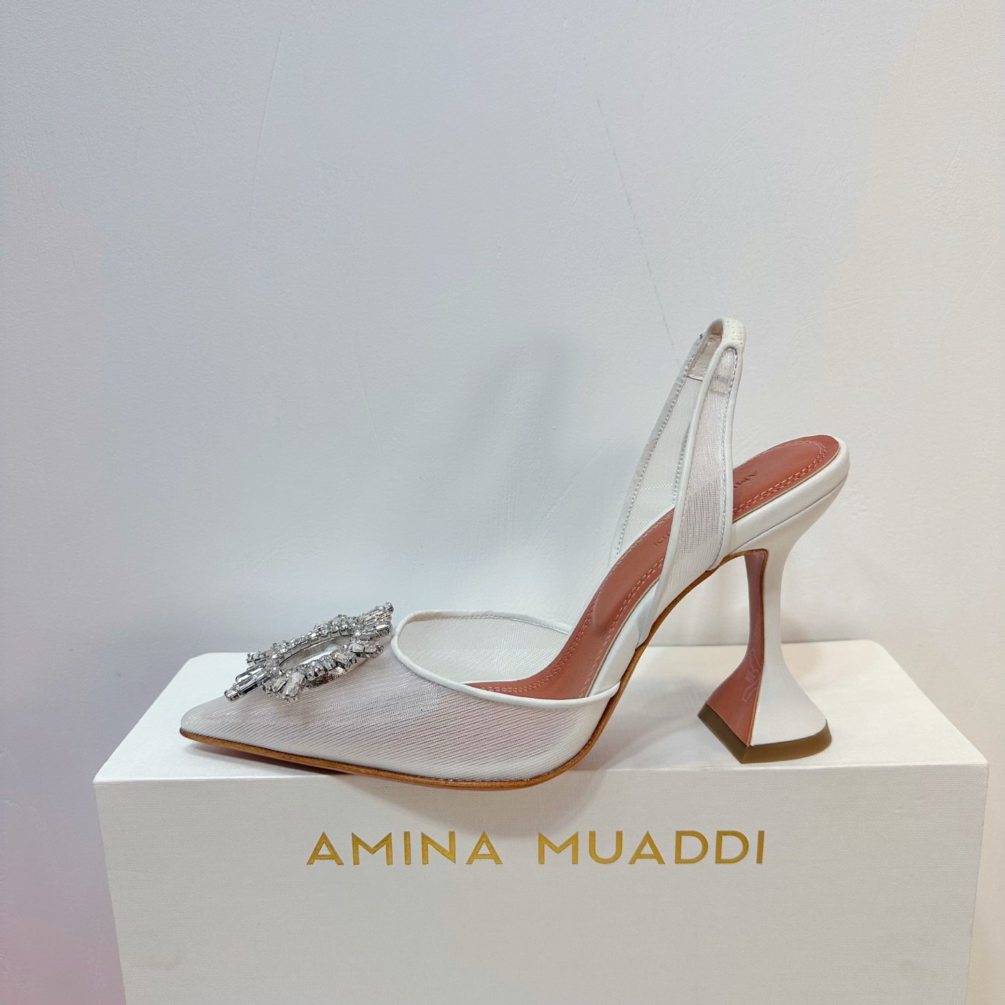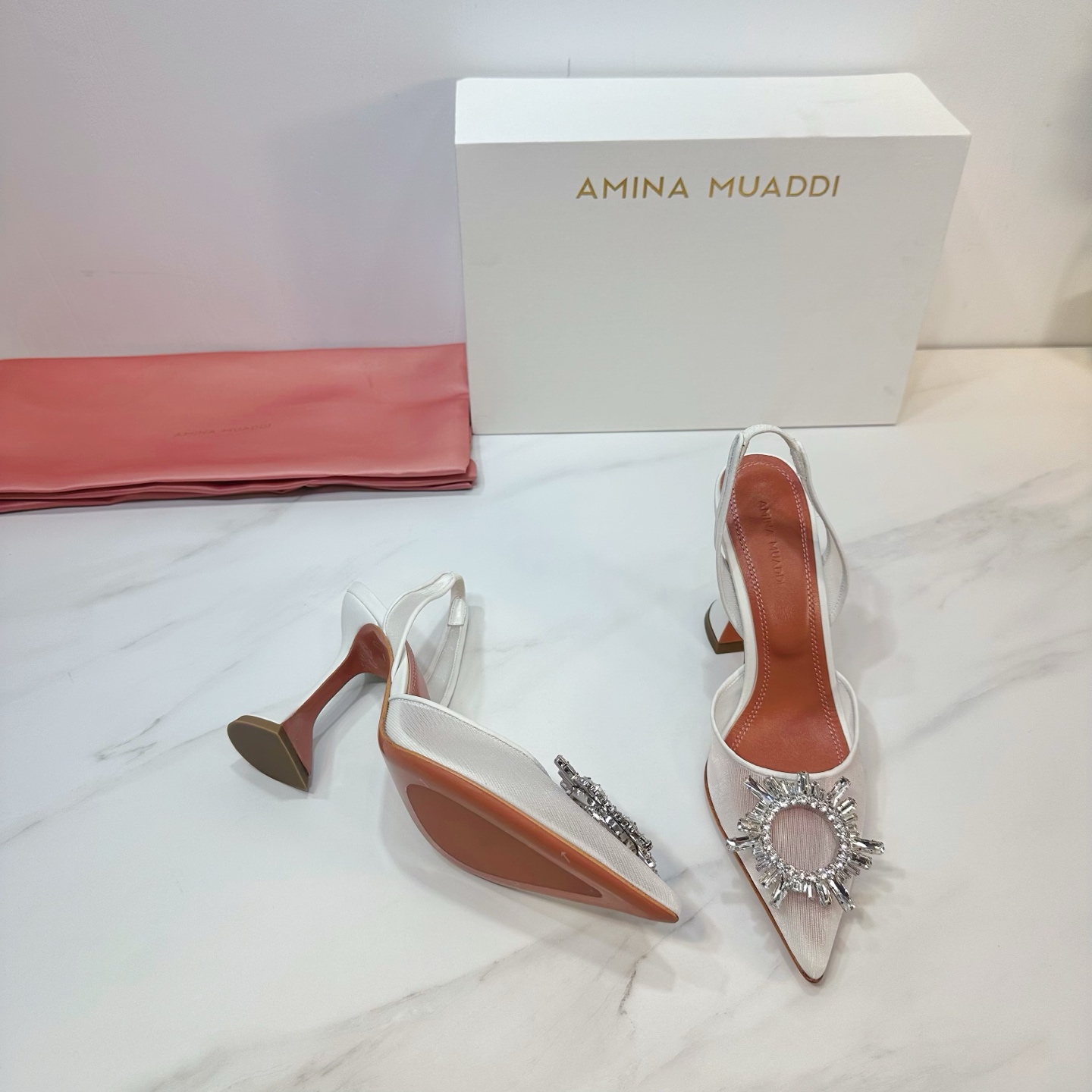 这款鞋子是AAAAA 1:1 质量 (非常棒). 使用了和原版一模一样的材料. 商标部分也保持了和Amina Muaddi一样. 图片拍摄是实物鞋子拍摄, 您所收到的实物保证和我们图片一模一样.