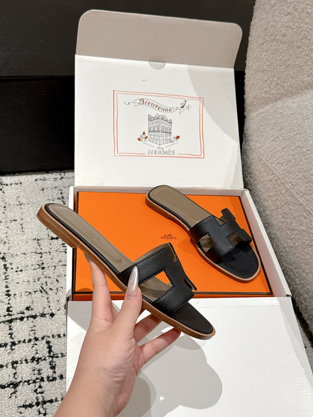 这款鞋子是AAAAA 1:1 质量 (非常棒). 使用了和原版一模一样的材料. 商标部分也保持了和爱马仕/Hermes一样. 图片拍摄是实物鞋子拍摄, 您所收到的实物保证和我们图片一模一样.