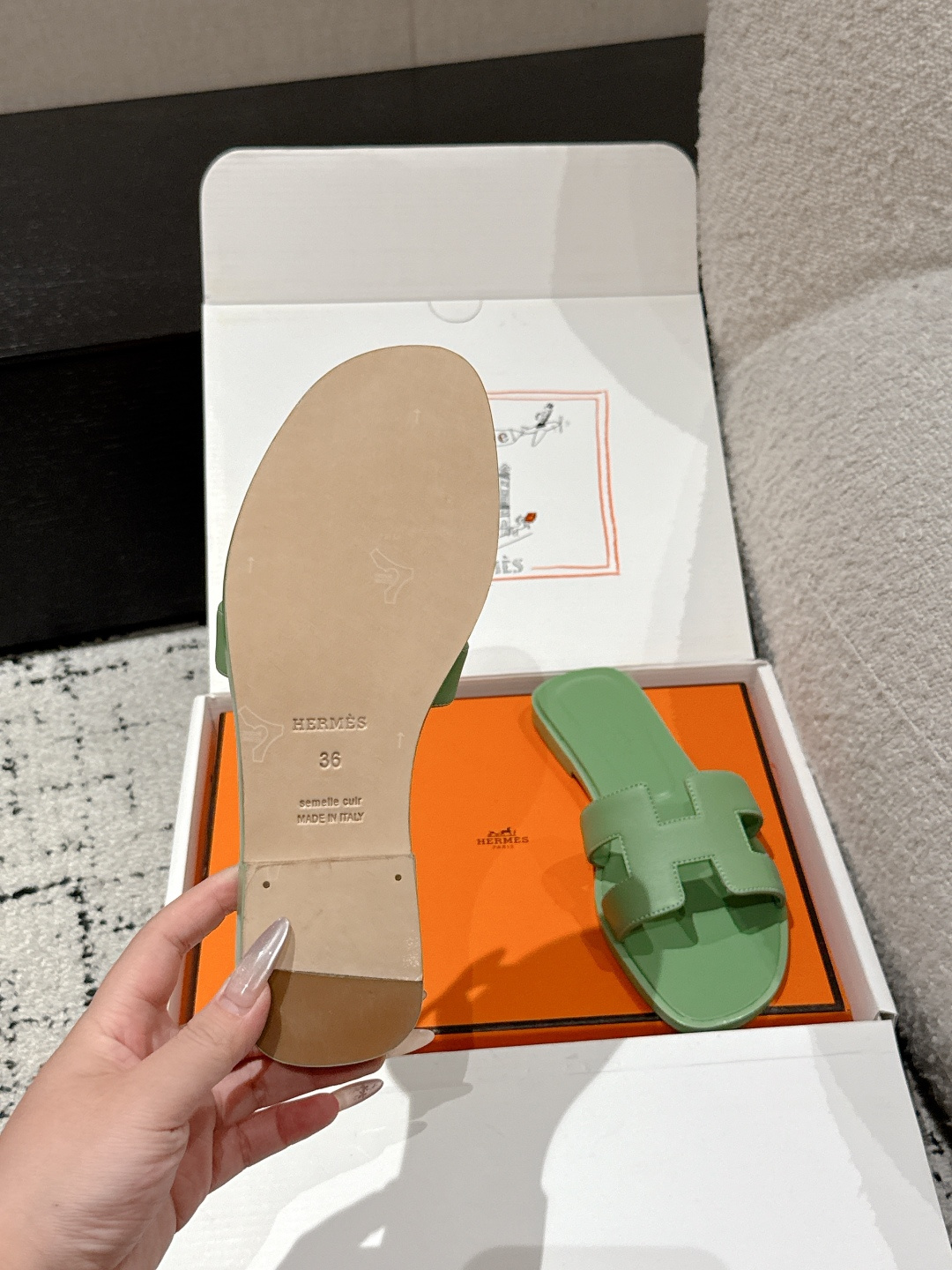 这款鞋子是AAAAA 1:1 质量 (非常棒). 使用了和原版一模一样的材料. 商标部分也保持了和爱马仕/Hermes一样. 图片拍摄是实物鞋子拍摄, 您所收到的实物保证和我们图片一模一样.