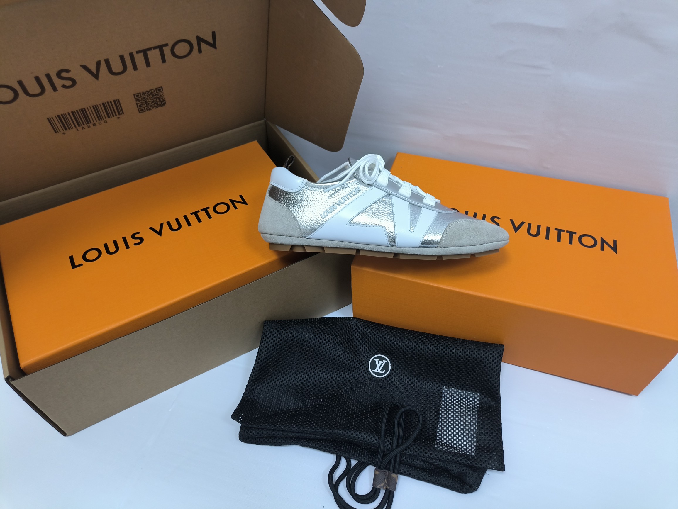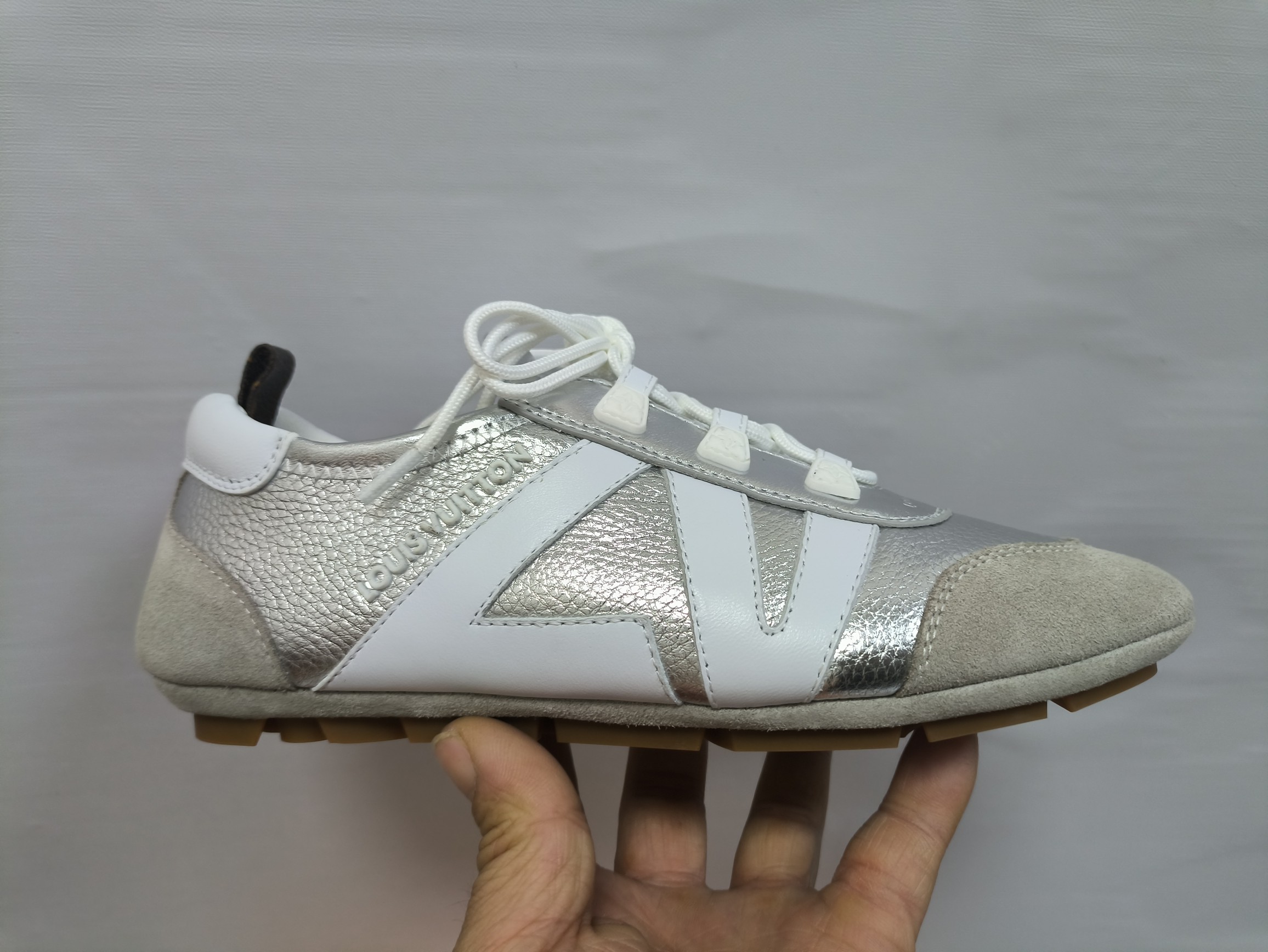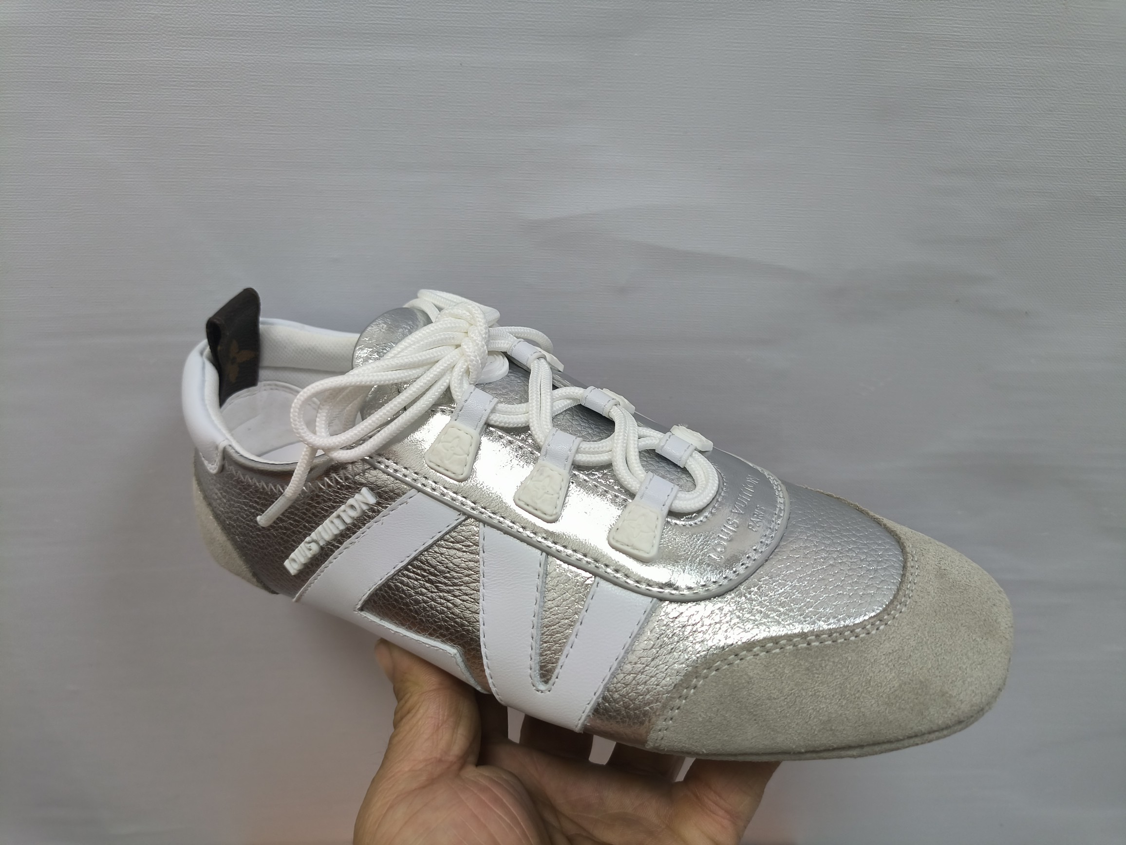 这款鞋子是AAAAA 1:1 质量 (非常棒). 使用了和原版一模一样的材料. 商标部分也保持了和路易威登/Louis Vuitton一样. 图片拍摄是实物鞋子拍摄, 您所收到的实物保证和我们图片一模一样.