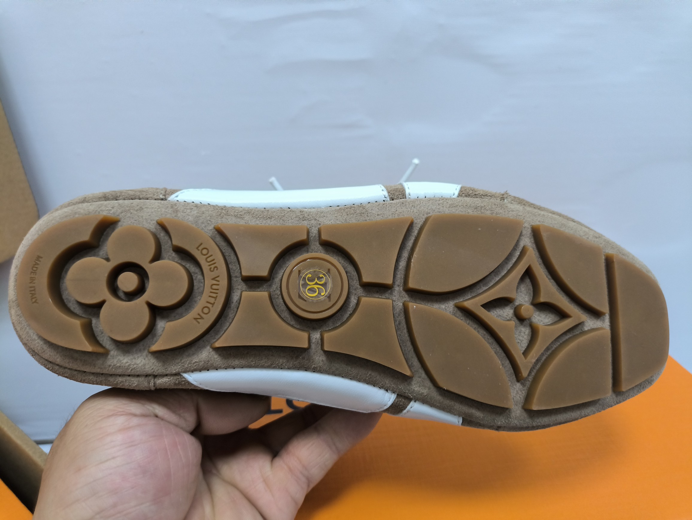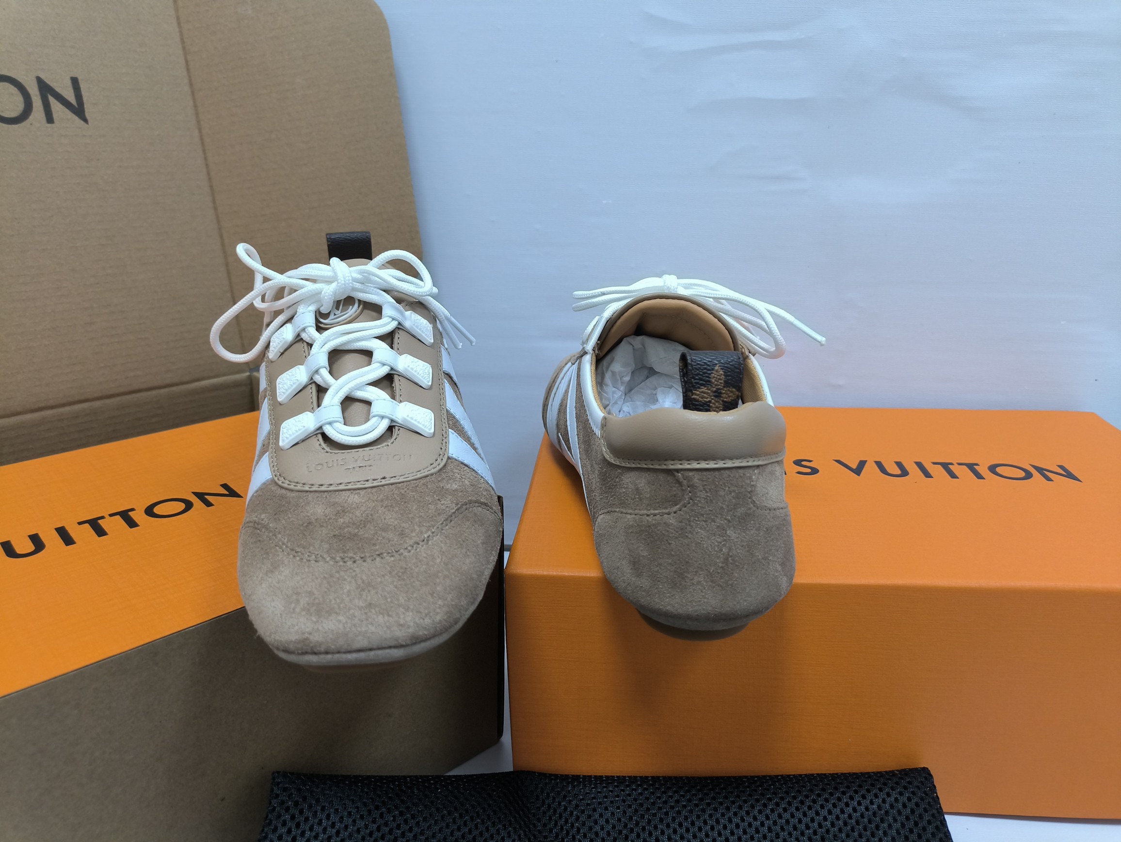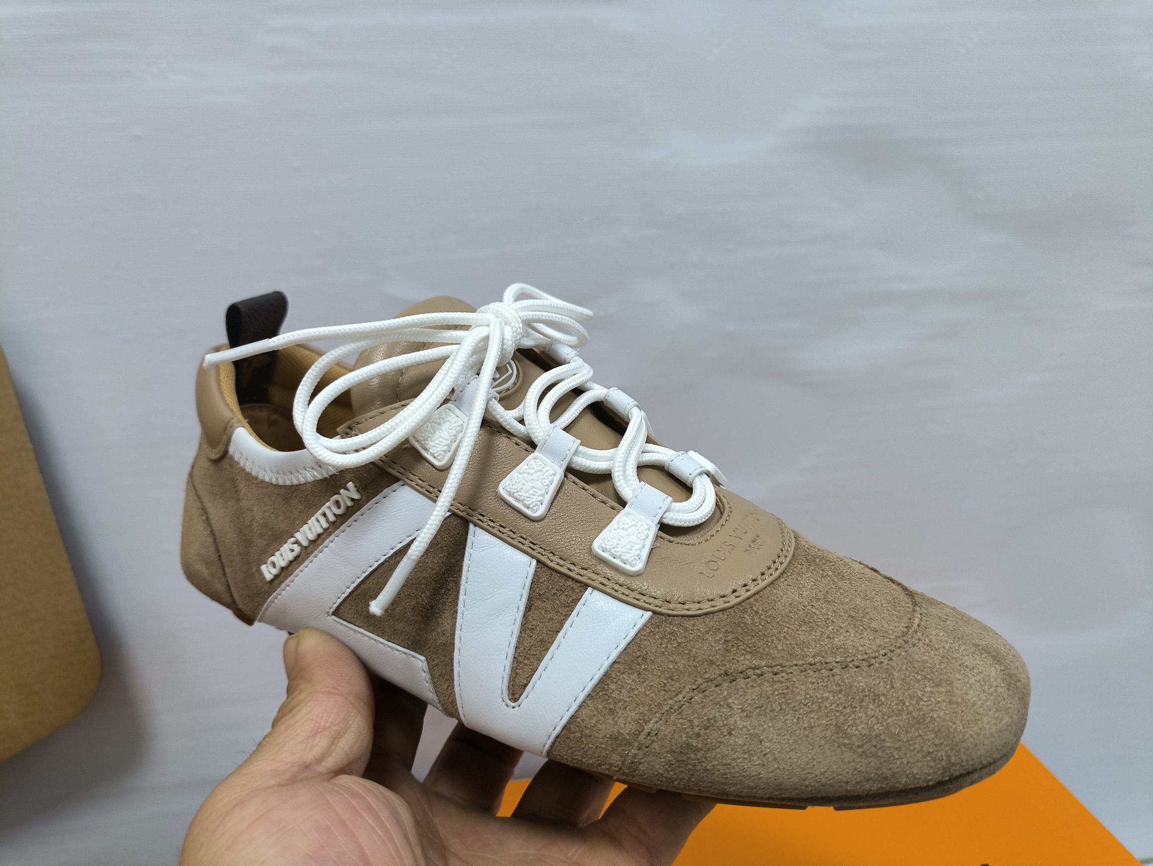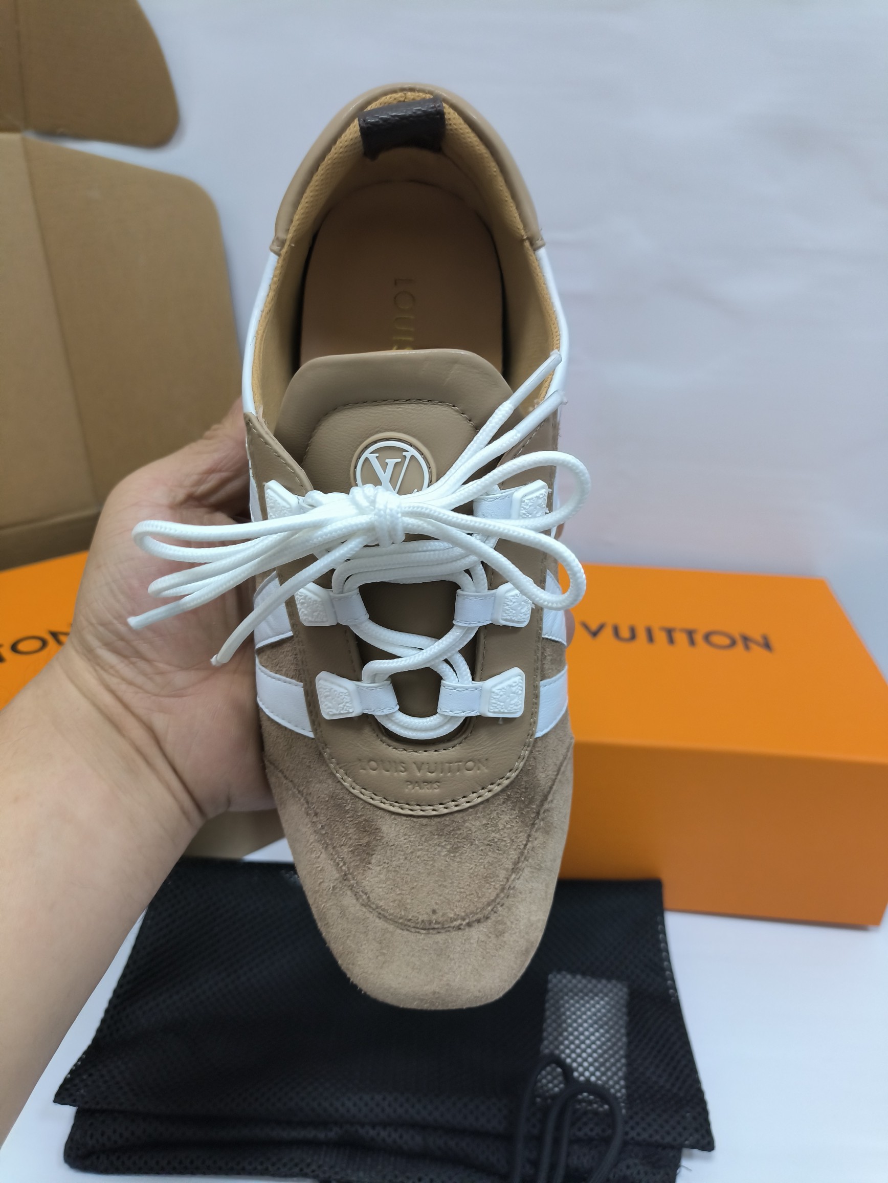 这款鞋子是AAAAA 1:1 质量 (非常棒). 使用了和原版一模一样的材料. 商标部分也保持了和路易威登/Louis Vuitton一样. 图片拍摄是实物鞋子拍摄, 您所收到的实物保证和我们图片一模一样.