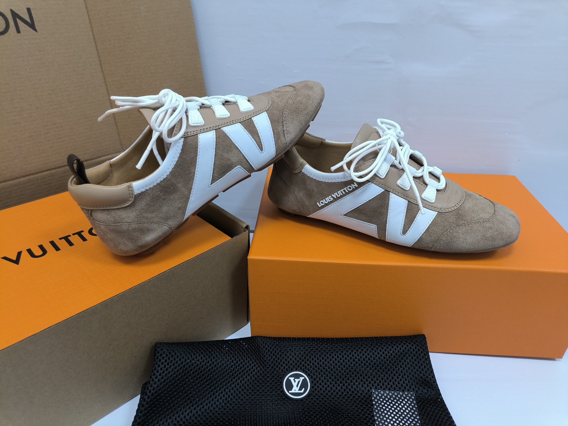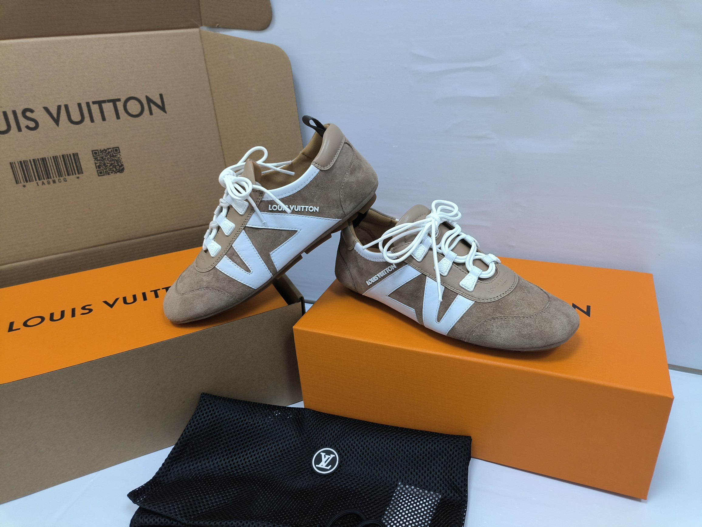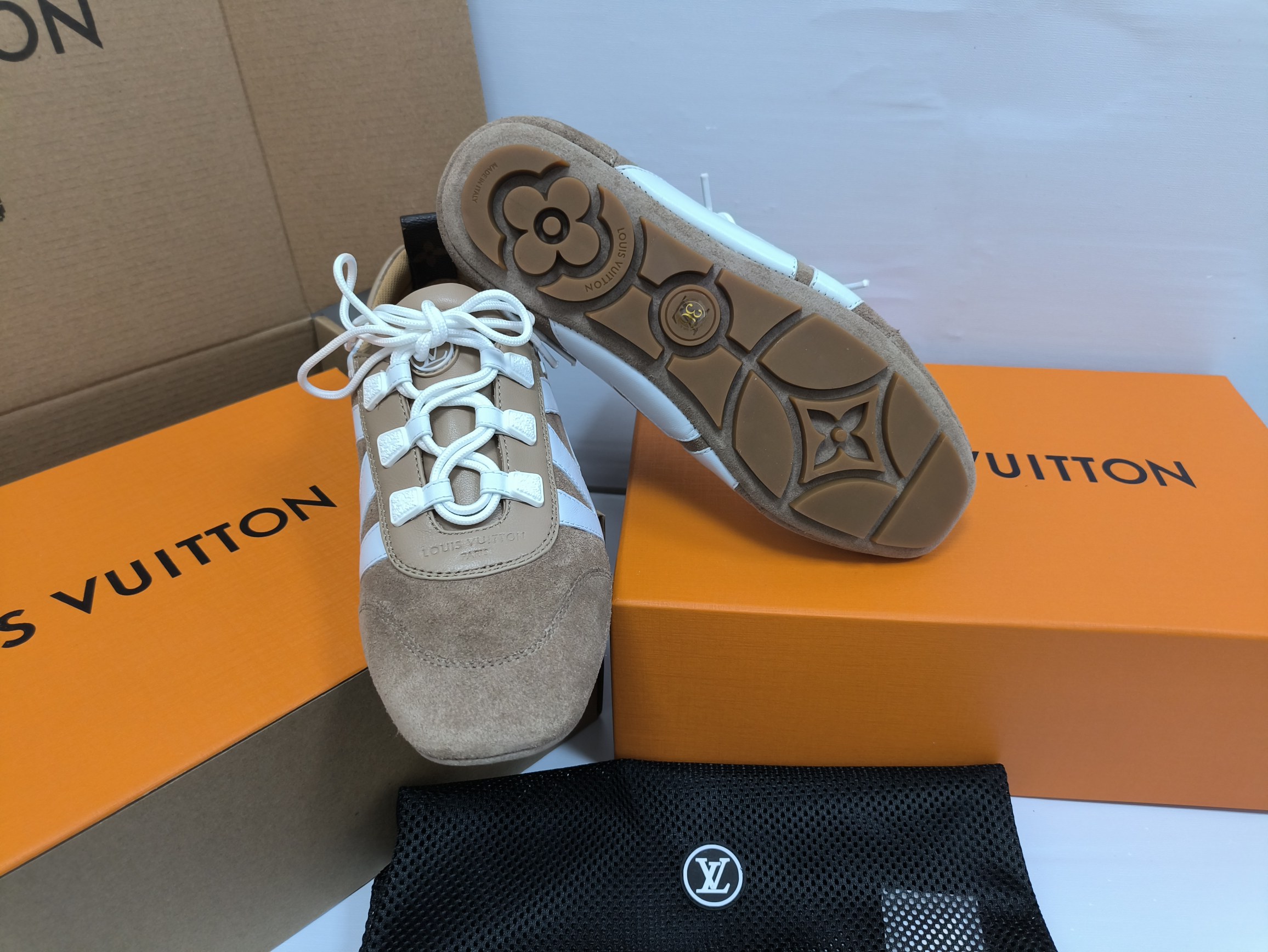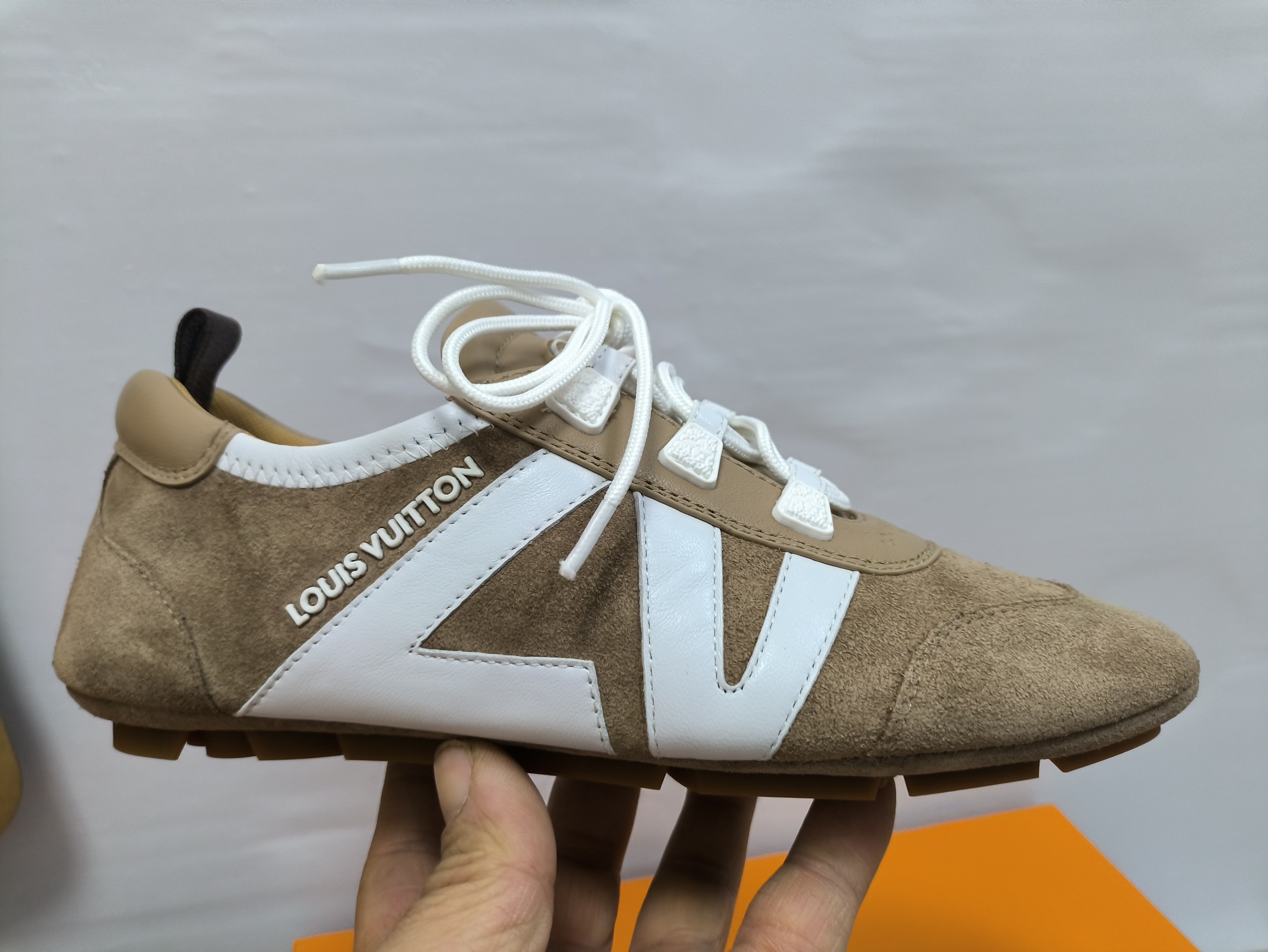 这款鞋子是AAAAA 1:1 质量 (非常棒). 使用了和原版一模一样的材料. 商标部分也保持了和路易威登/Louis Vuitton一样. 图片拍摄是实物鞋子拍摄, 您所收到的实物保证和我们图片一模一样.