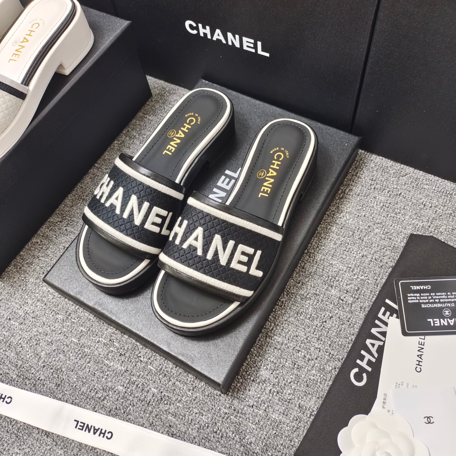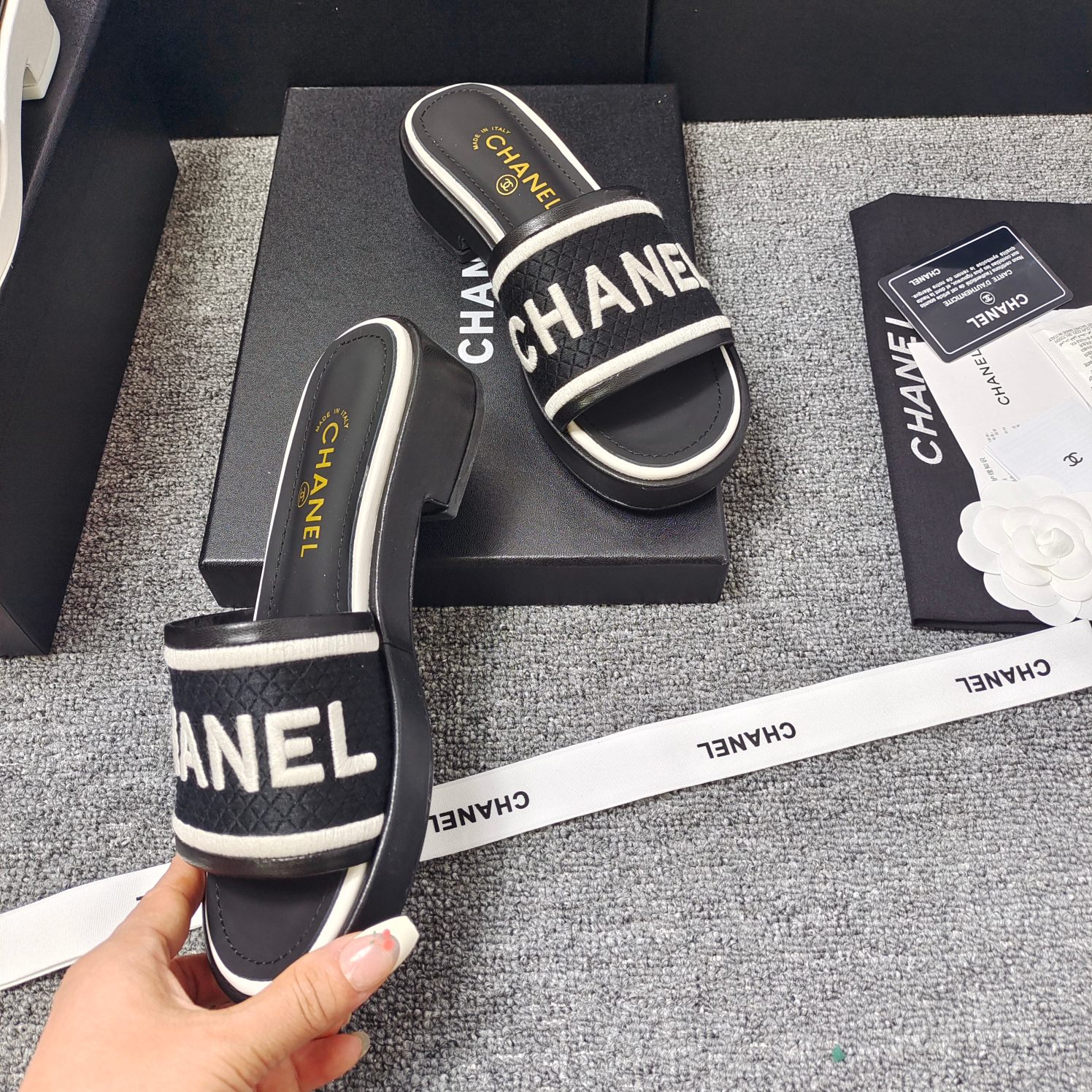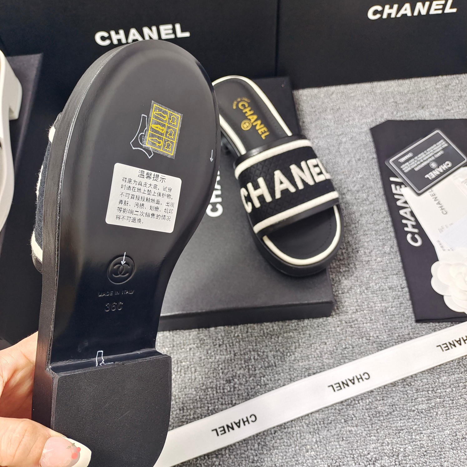 这款鞋子是AAAAA 1:1 质量 (非常棒). 使用了和原版一模一样的材料. 商标部分也保持了和香奈儿/Chanel一样. 图片拍摄是实物鞋子拍摄, 您所收到的实物保证和我们图片一模一样.
