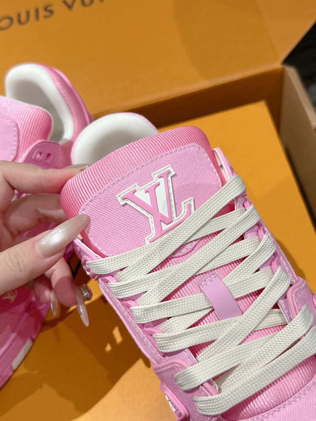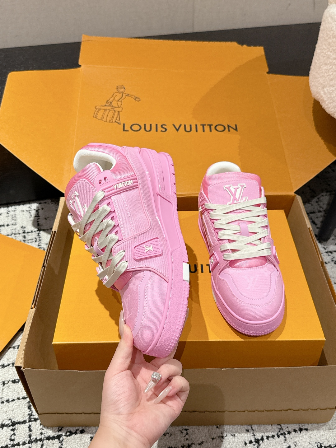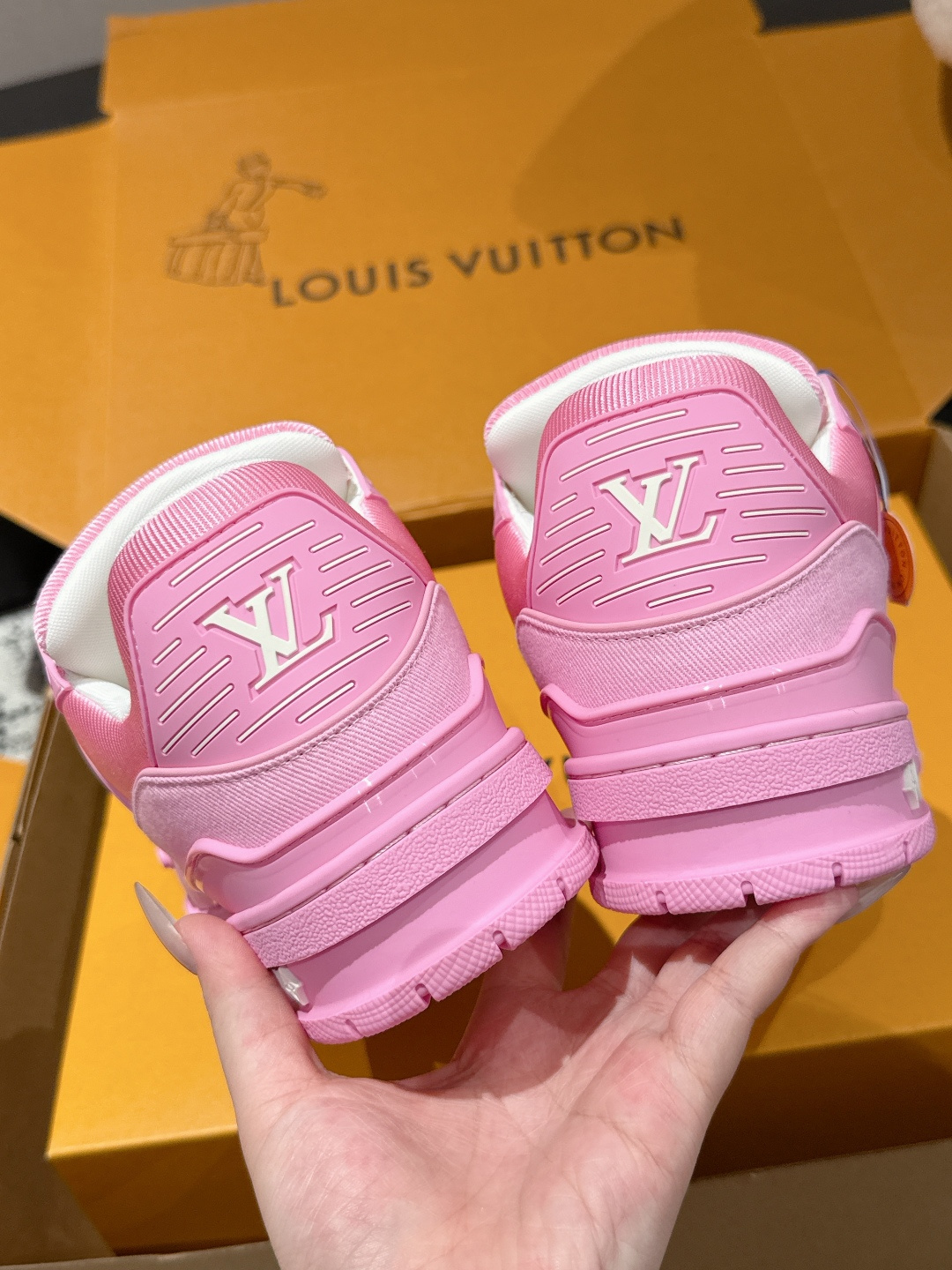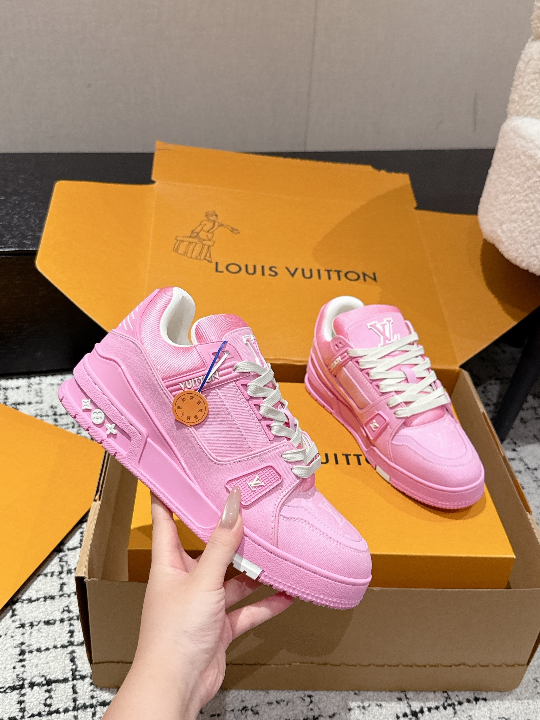 这款鞋子是AAAAA 1:1 质量 (非常棒). 使用了和原版一模一样的材料. 商标部分也保持了和路易威登/Louis Vuitton一样. 图片拍摄是实物鞋子拍摄, 您所收到的实物保证和我们图片一模一样.