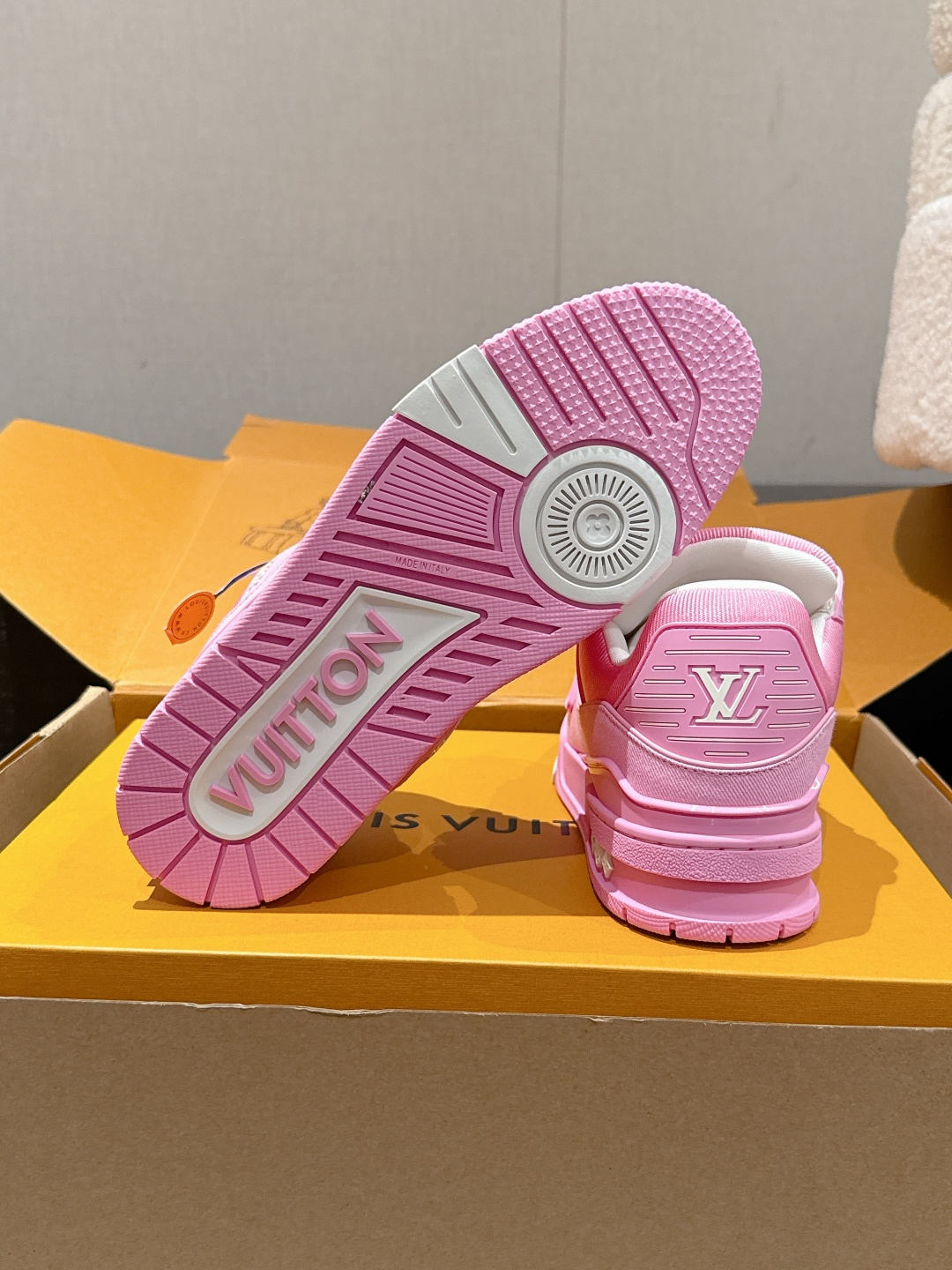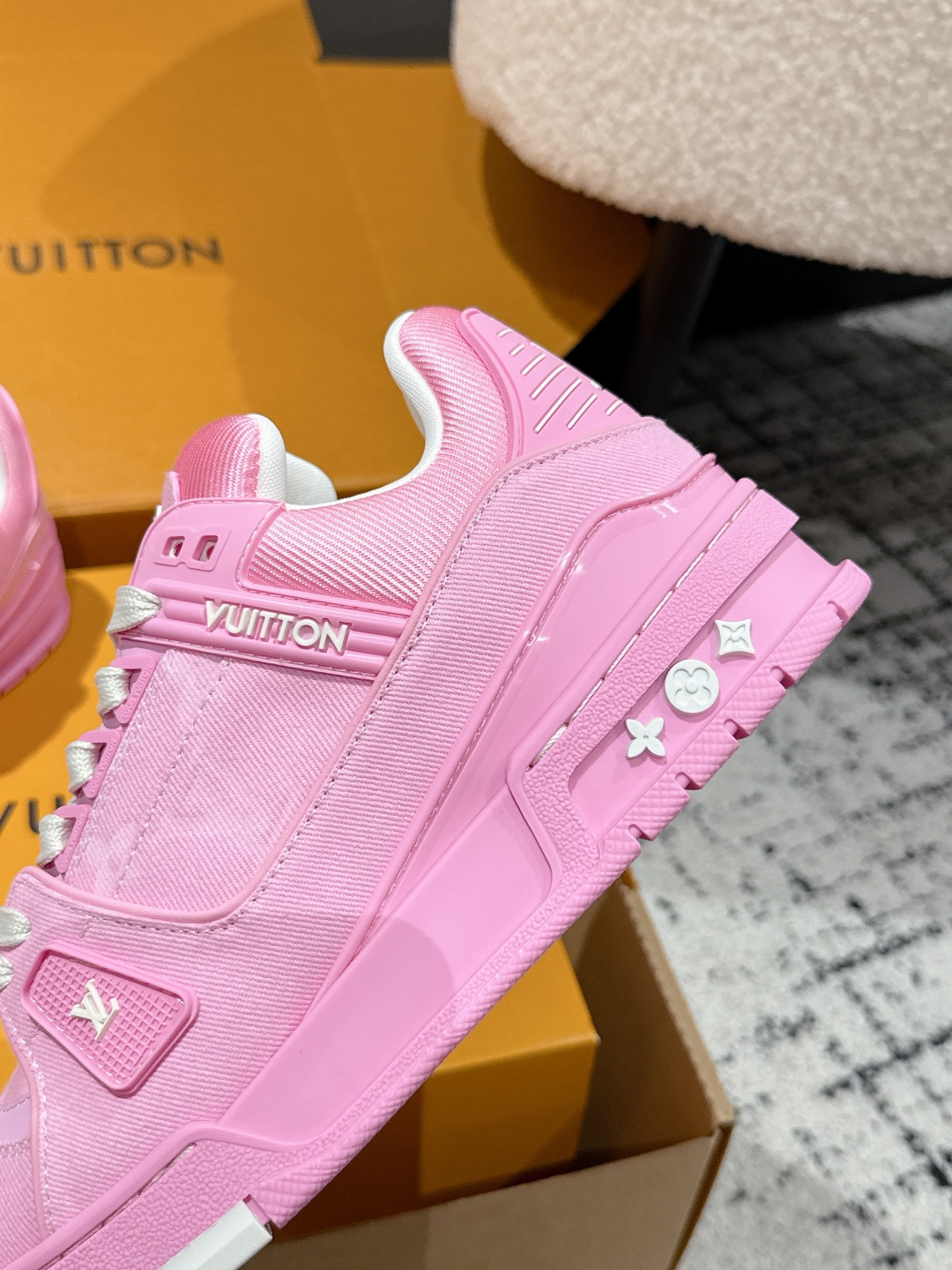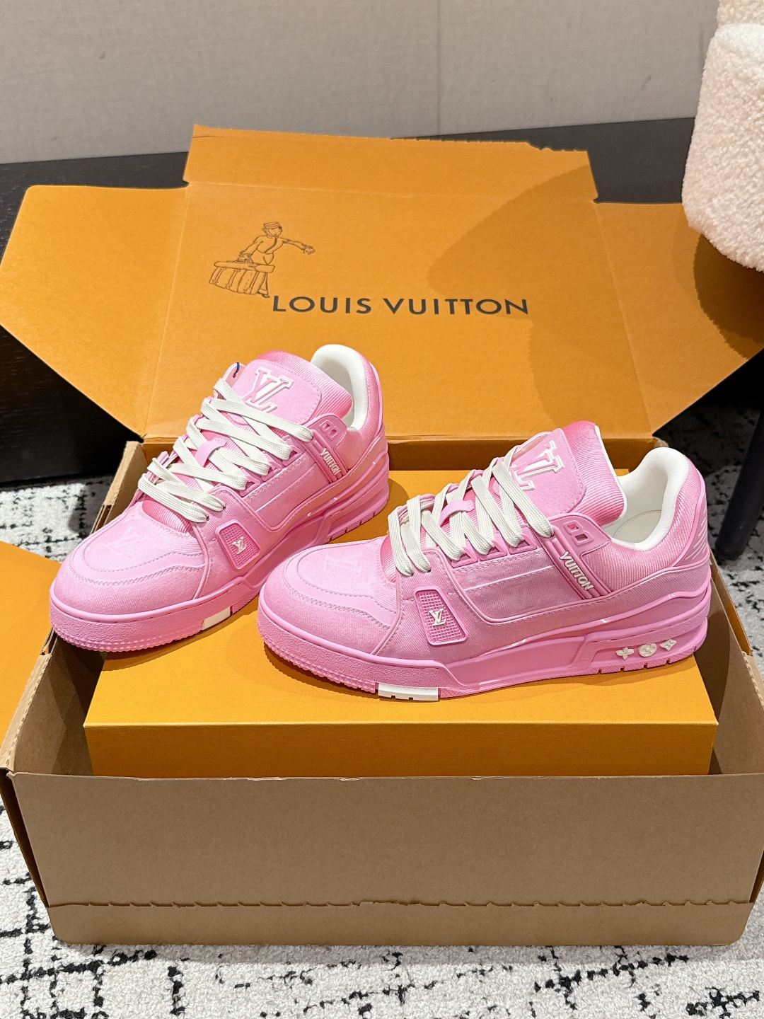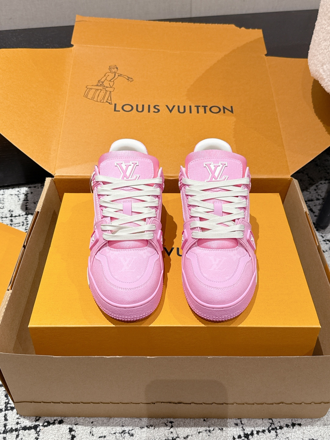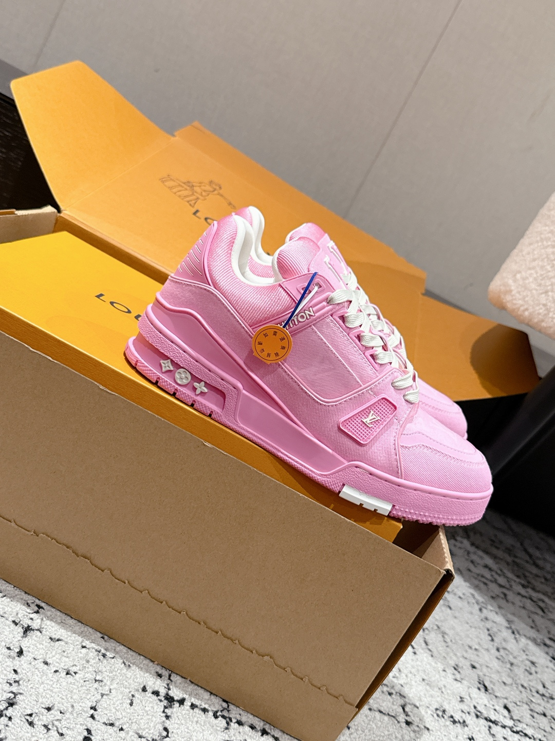 这款鞋子是AAAAA 1:1 质量 (非常棒). 使用了和原版一模一样的材料. 商标部分也保持了和路易威登/Louis Vuitton一样. 图片拍摄是实物鞋子拍摄, 您所收到的实物保证和我们图片一模一样.