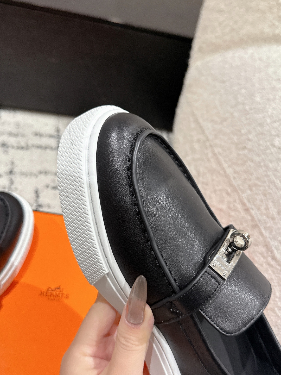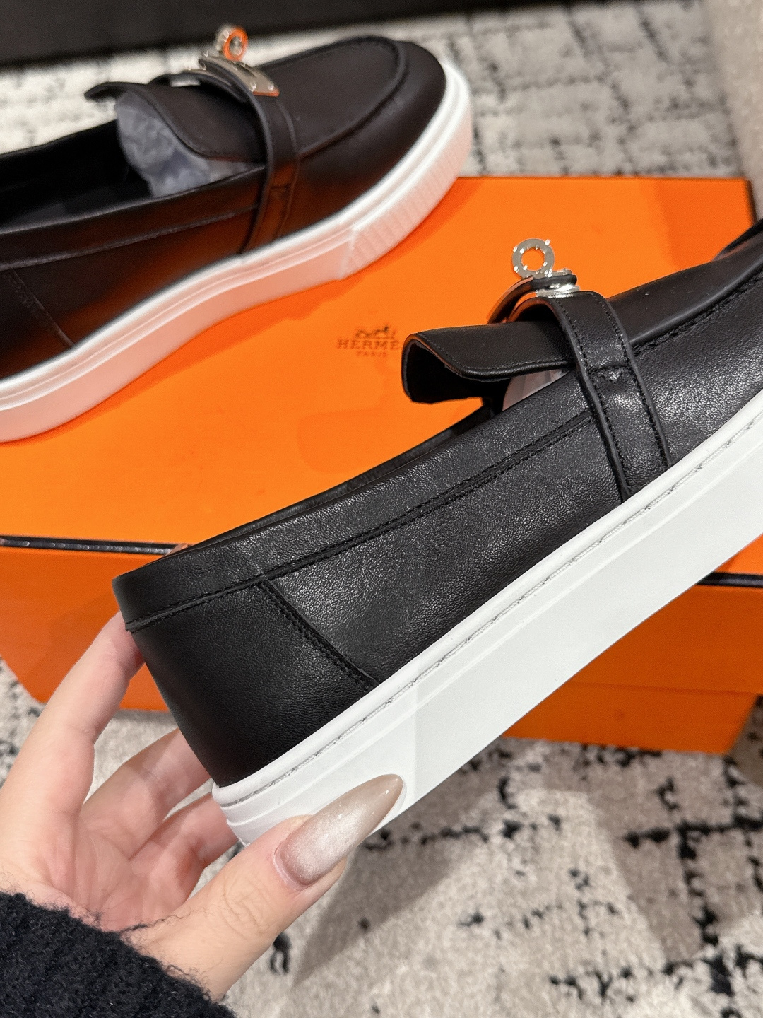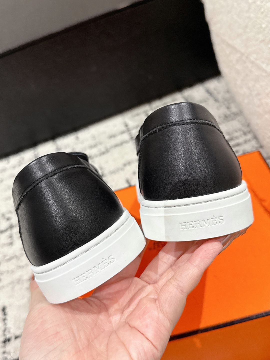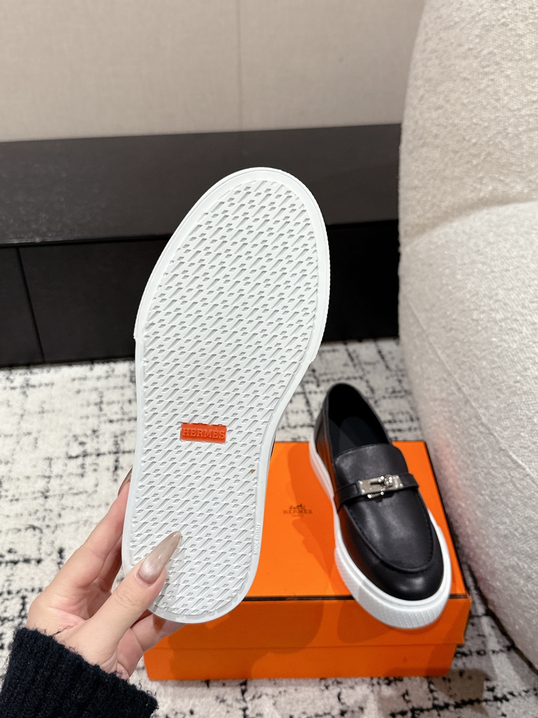 这款鞋子是AAAAA 1:1 质量 (非常棒). 使用了和原版一模一样的材料. 商标部分也保持了和爱马仕/Hermes一样. 图片拍摄是实物鞋子拍摄, 您所收到的实物保证和我们图片一模一样.