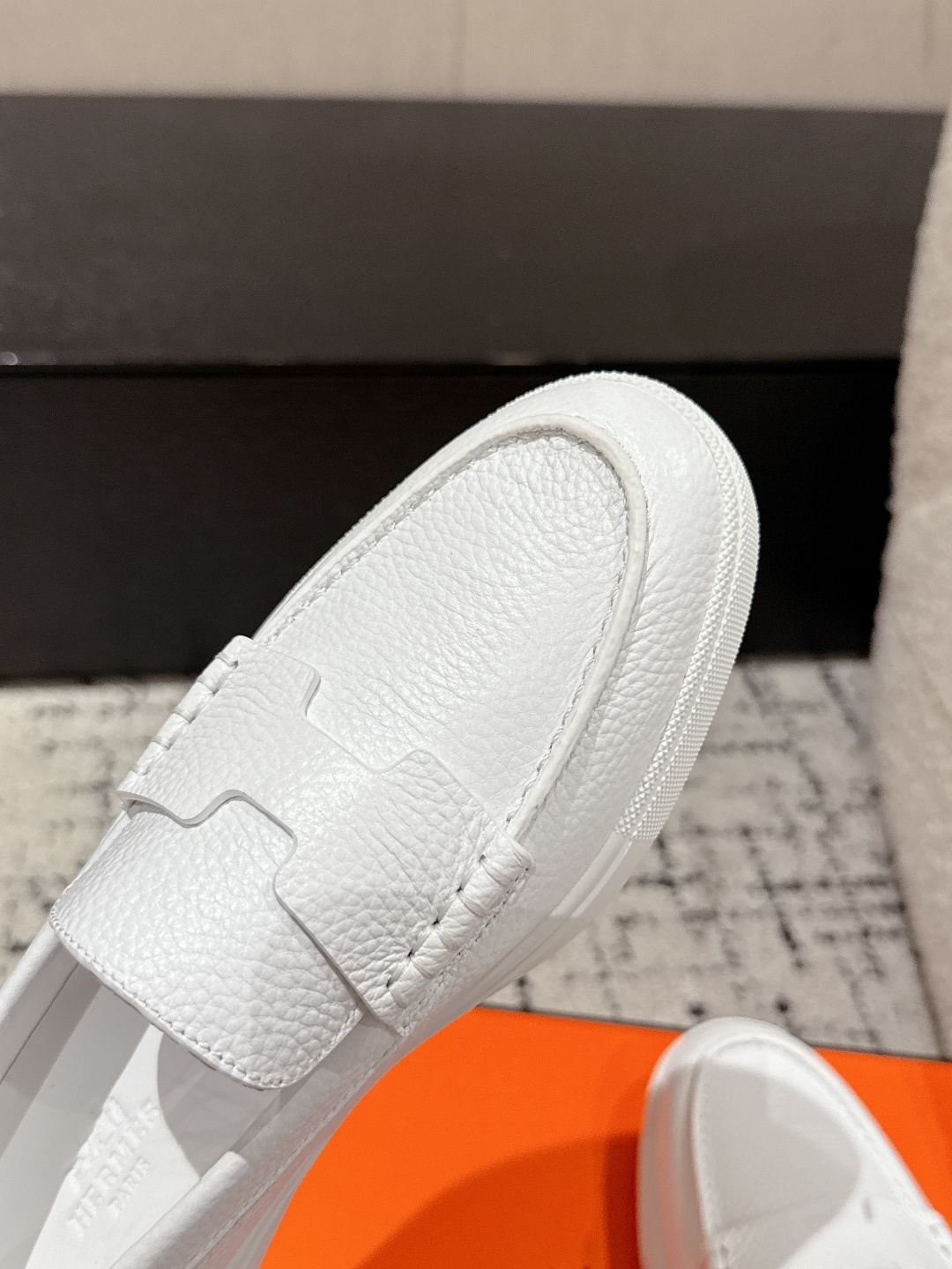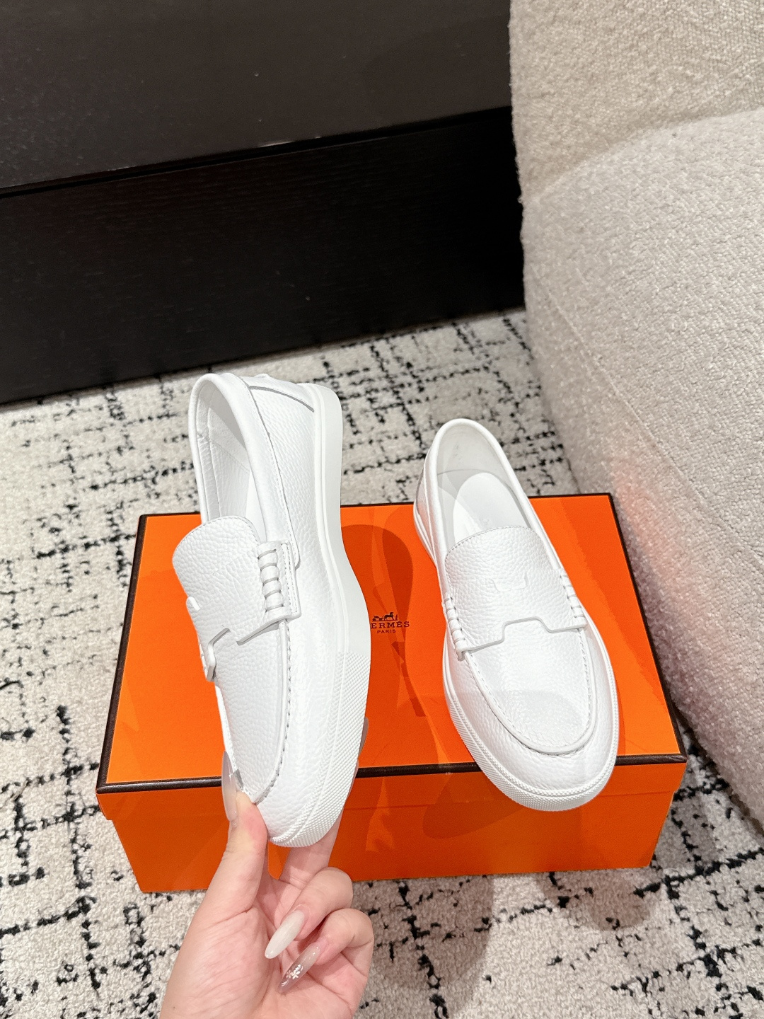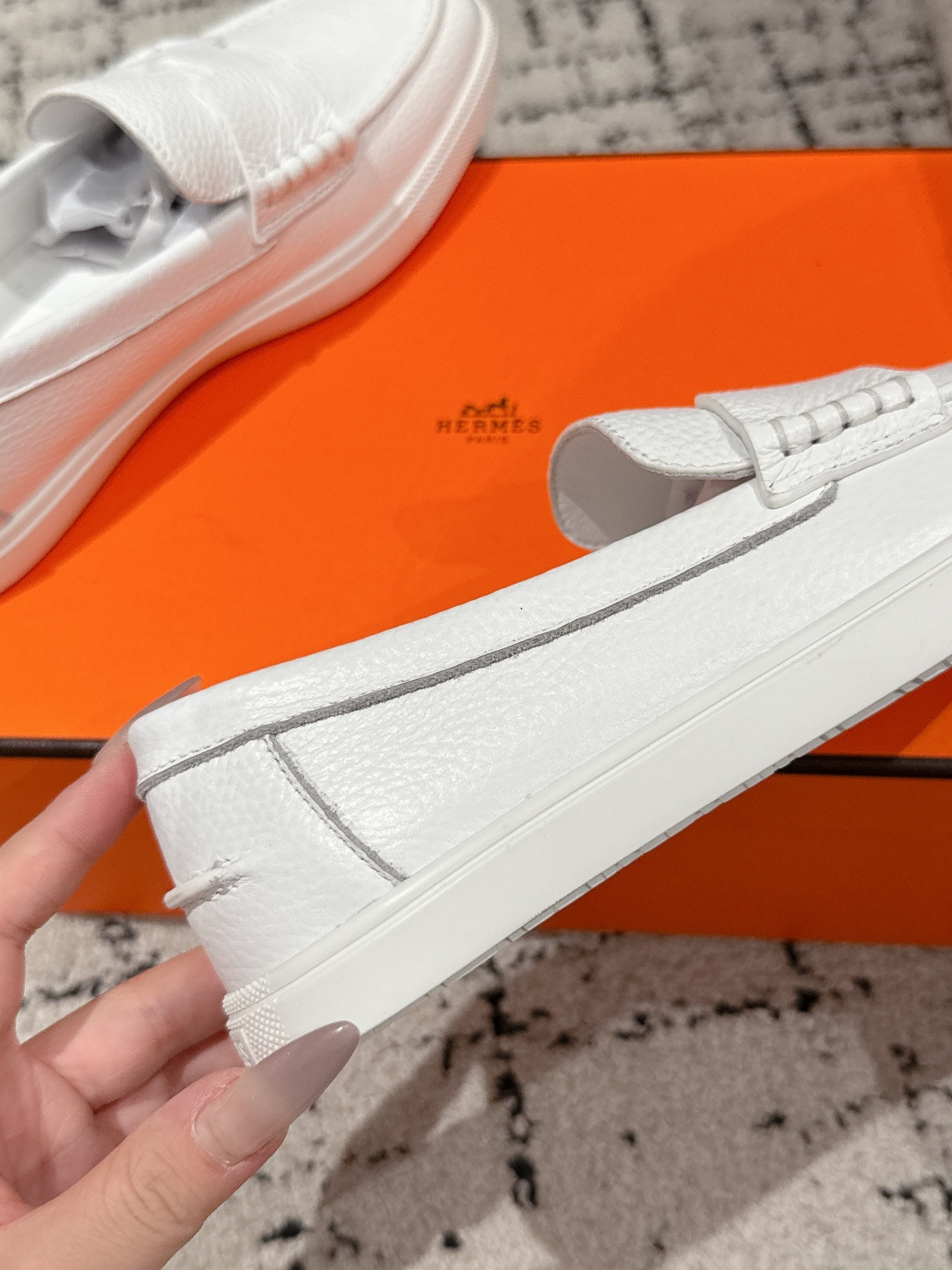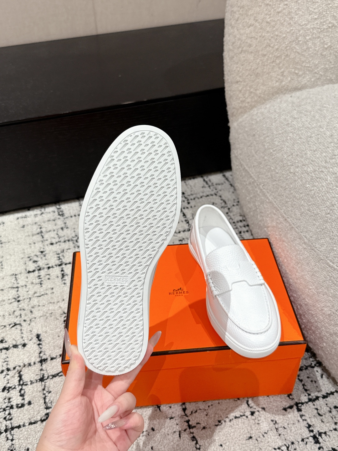 这款鞋子是AAAAA 1:1 质量 (非常棒). 使用了和原版一模一样的材料. 商标部分也保持了和爱马仕/Hermes一样. 图片拍摄是实物鞋子拍摄, 您所收到的实物保证和我们图片一模一样.