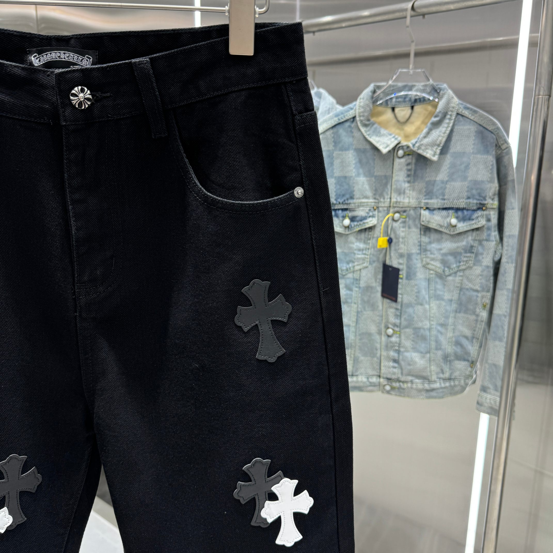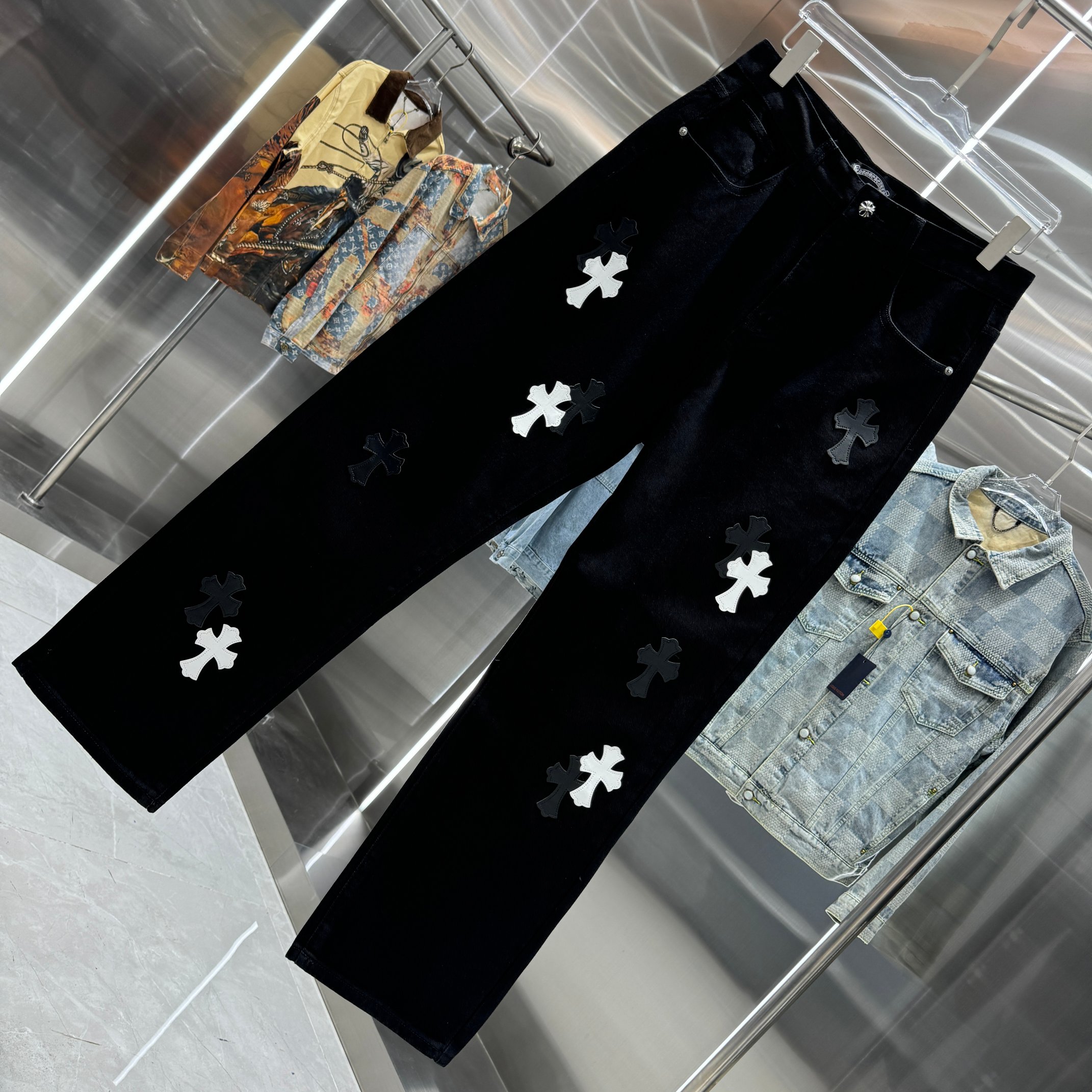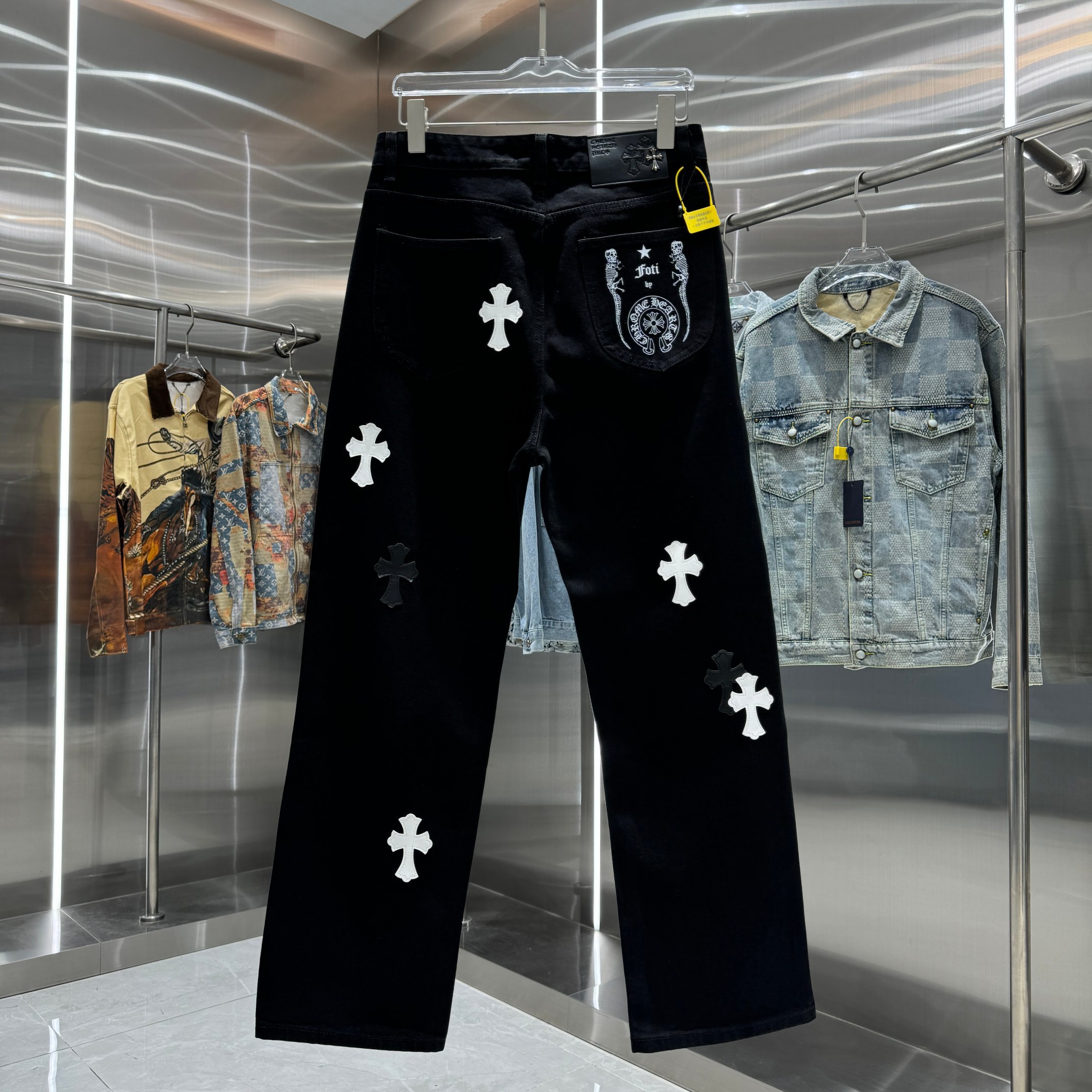 这款衣服是AAAAA 1:1 质量 (非常棒). 使用了和原版一模一样的材料. 商标部分也保持了和克罗心/Chrome Hearts一样. 图片拍摄是实物衣服拍摄, 您所收到的实物保证和我们图片一模一样.