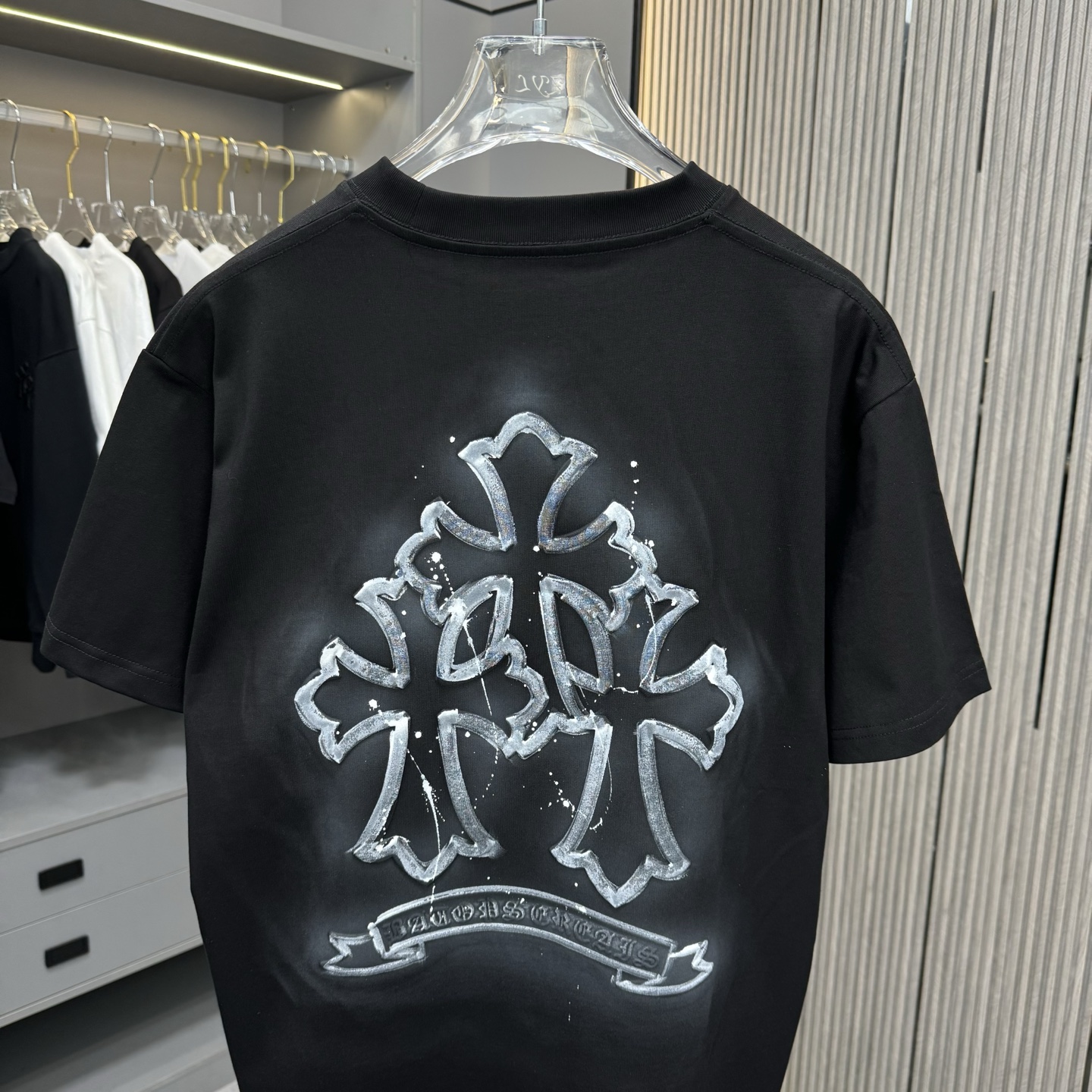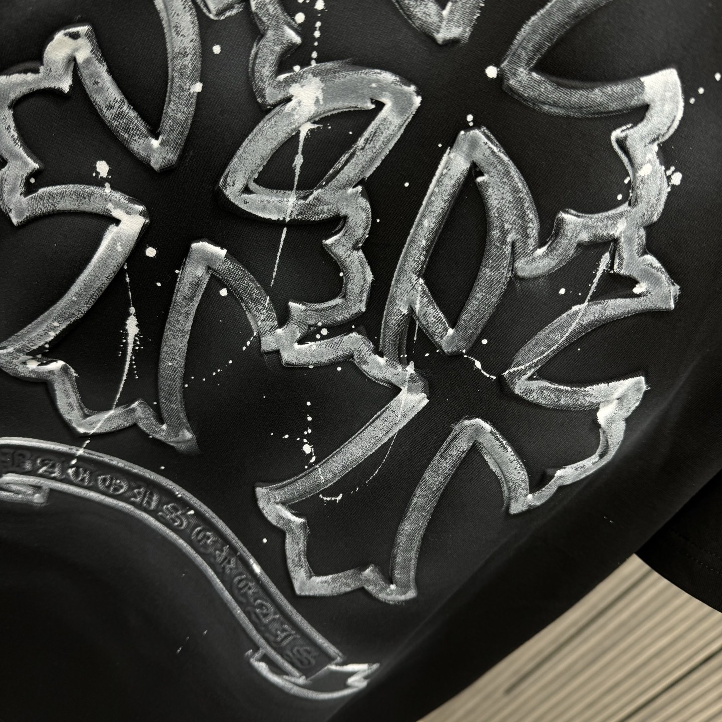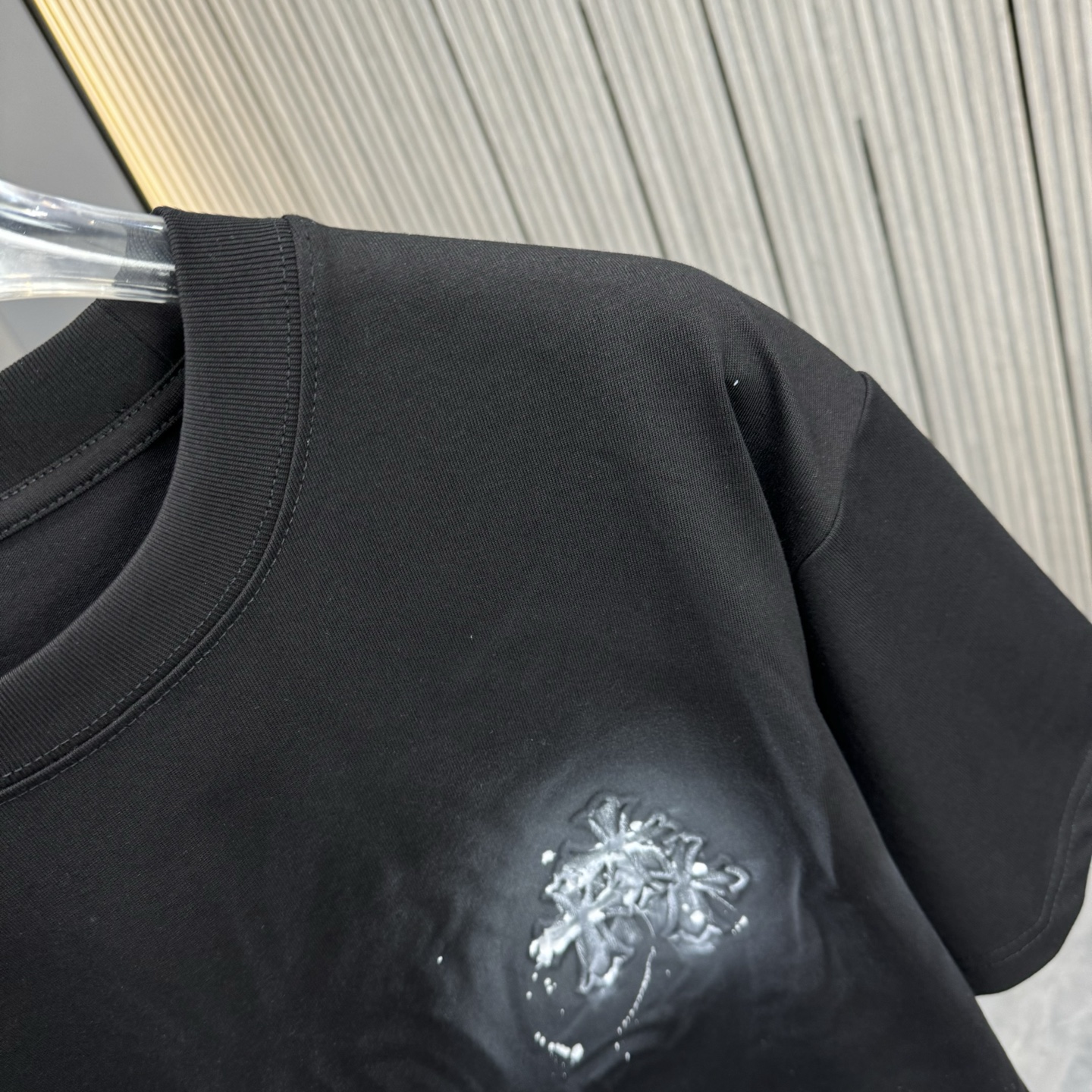 这款衣服是AAAAA 1:1 质量 (非常棒). 使用了和原版一模一样的材料. 商标部分也保持了和克罗心/Chrome Hearts一样. 图片拍摄是实物衣服拍摄, 您所收到的实物保证和我们图片一模一样.