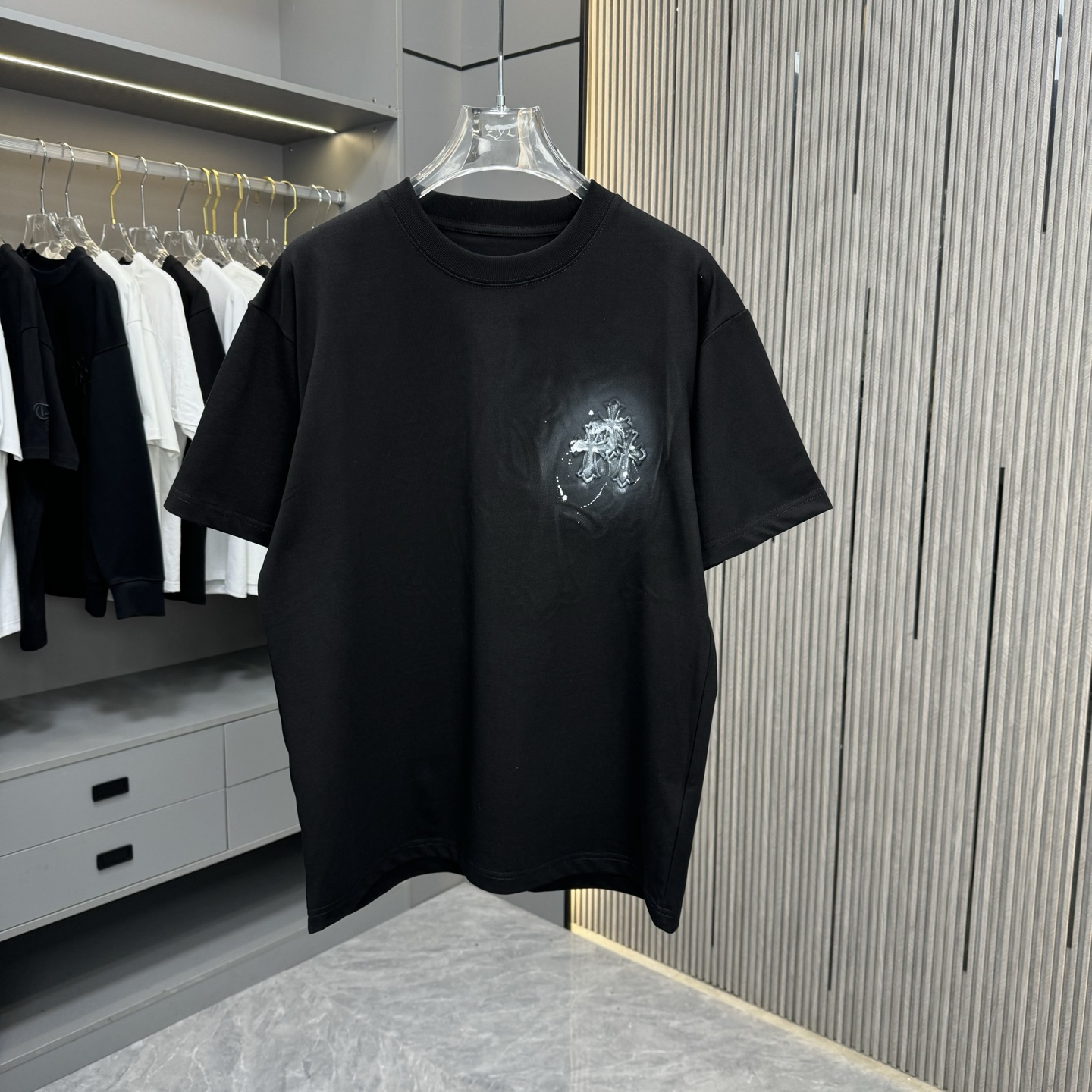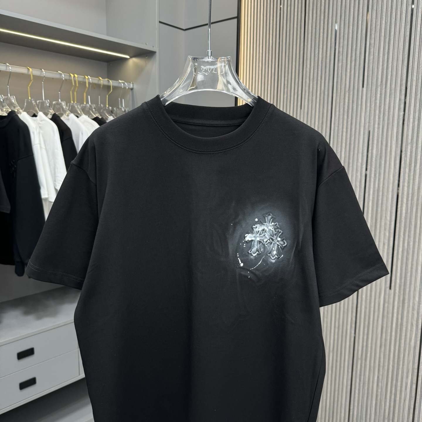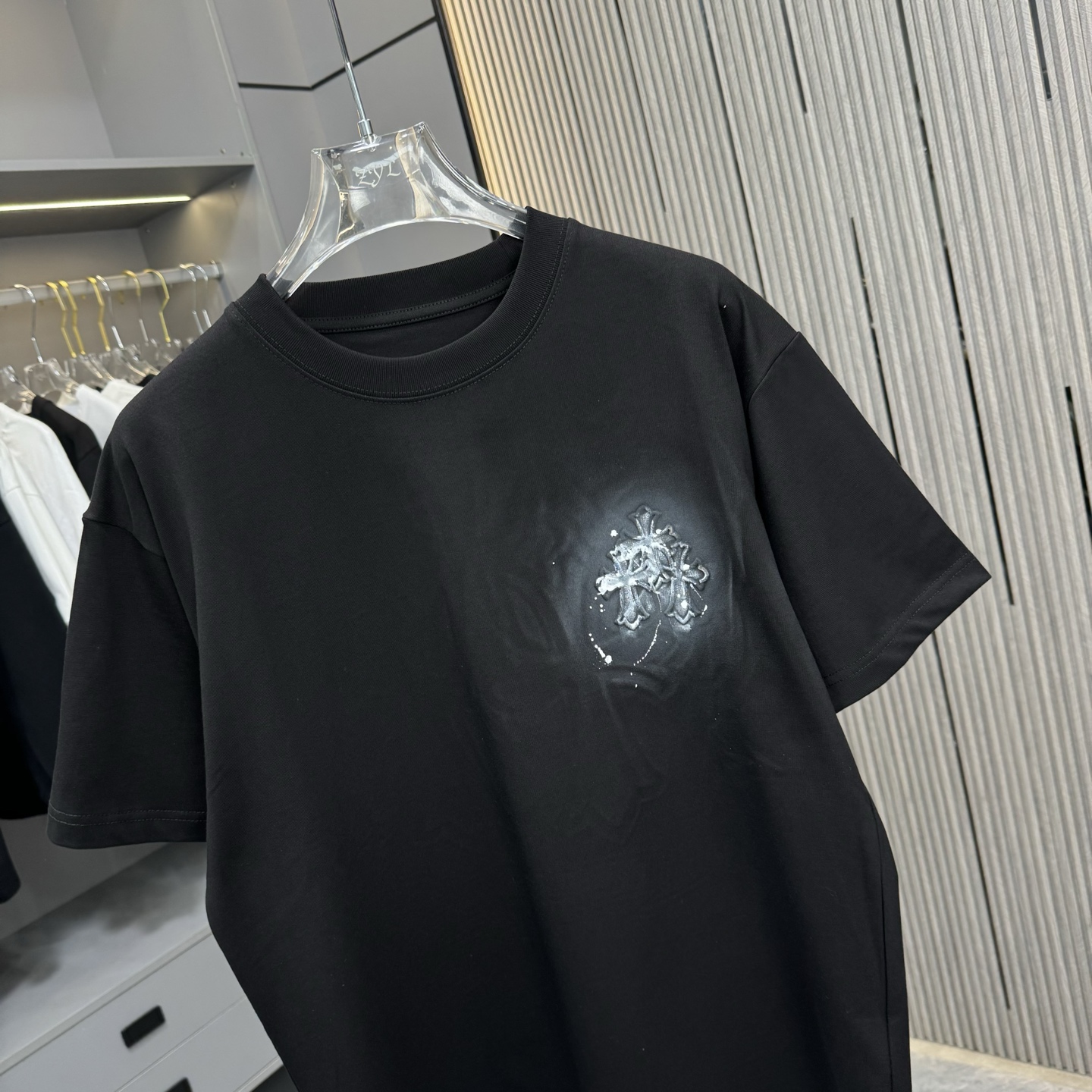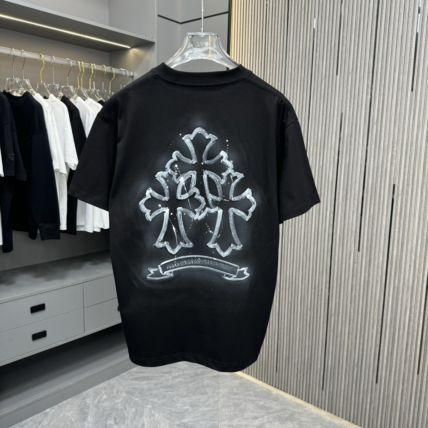 这款衣服是AAAAA 1:1 质量 (非常棒). 使用了和原版一模一样的材料. 商标部分也保持了和克罗心/Chrome Hearts一样. 图片拍摄是实物衣服拍摄, 您所收到的实物保证和我们图片一模一样.