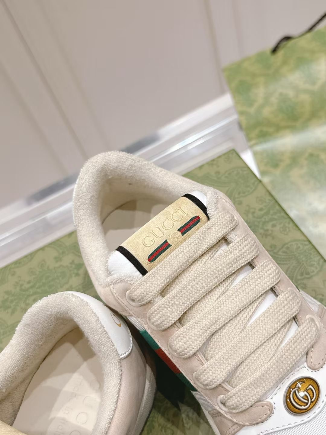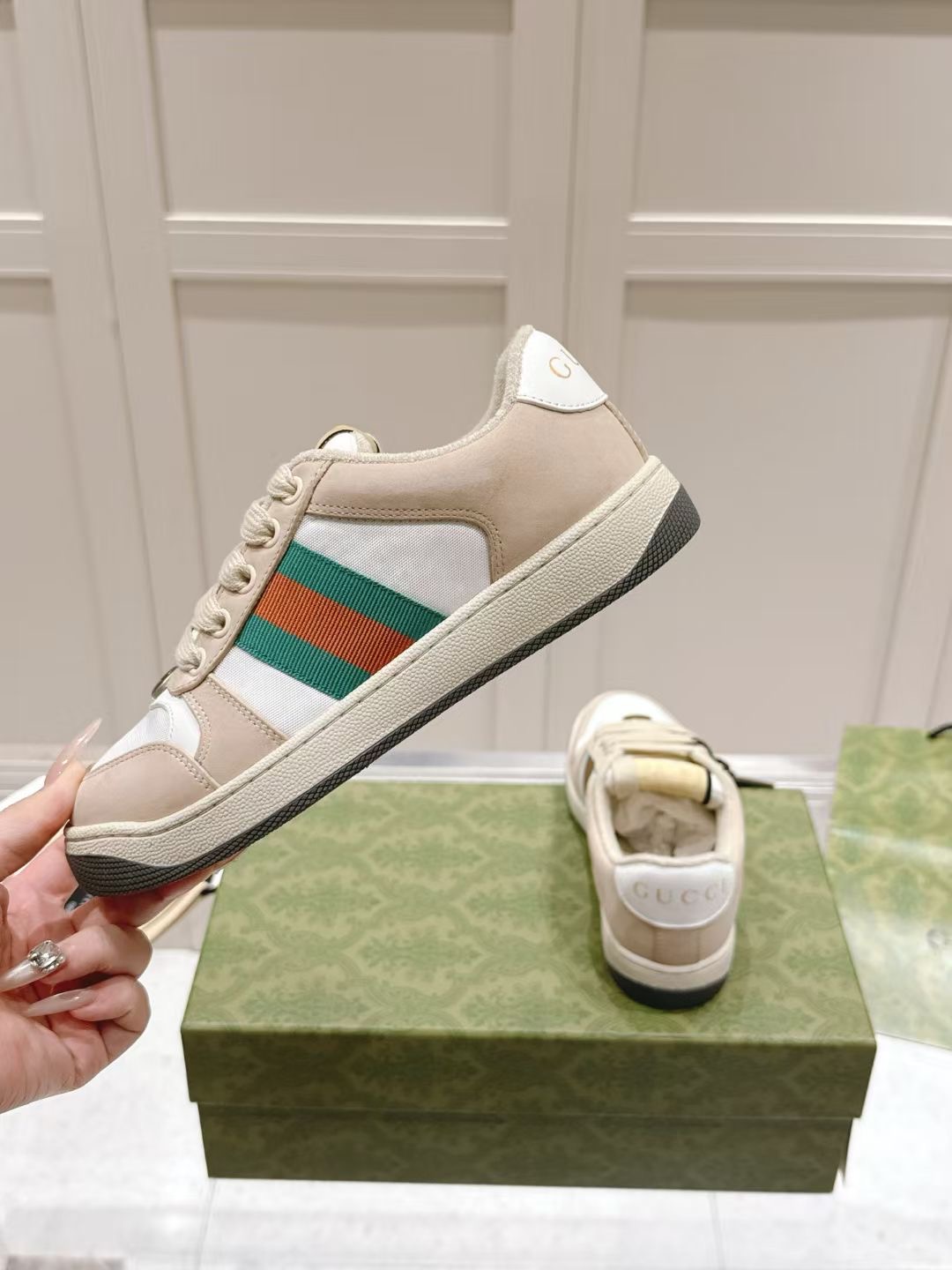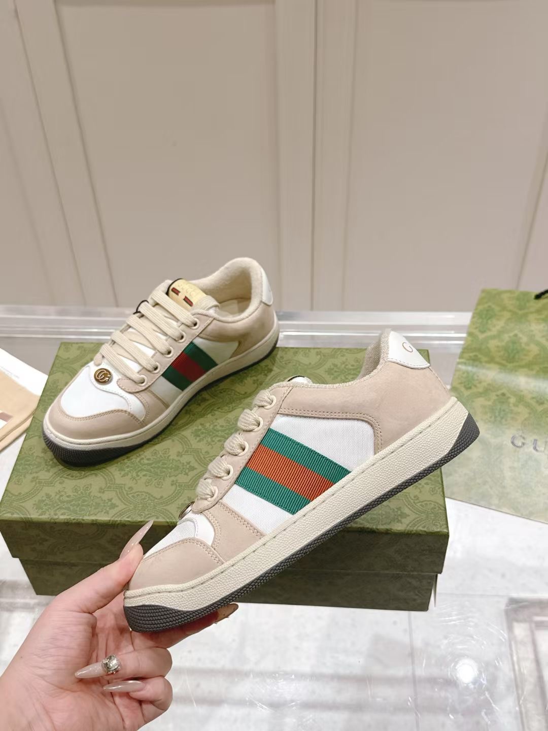 这款鞋子是AAAAA 1:1 质量 (非常棒). 使用了和原版一模一样的材料. 商标部分也保持了和古奇/Gucci一样. 图片拍摄是实物鞋子拍摄, 您所收到的实物保证和我们图片一模一样.