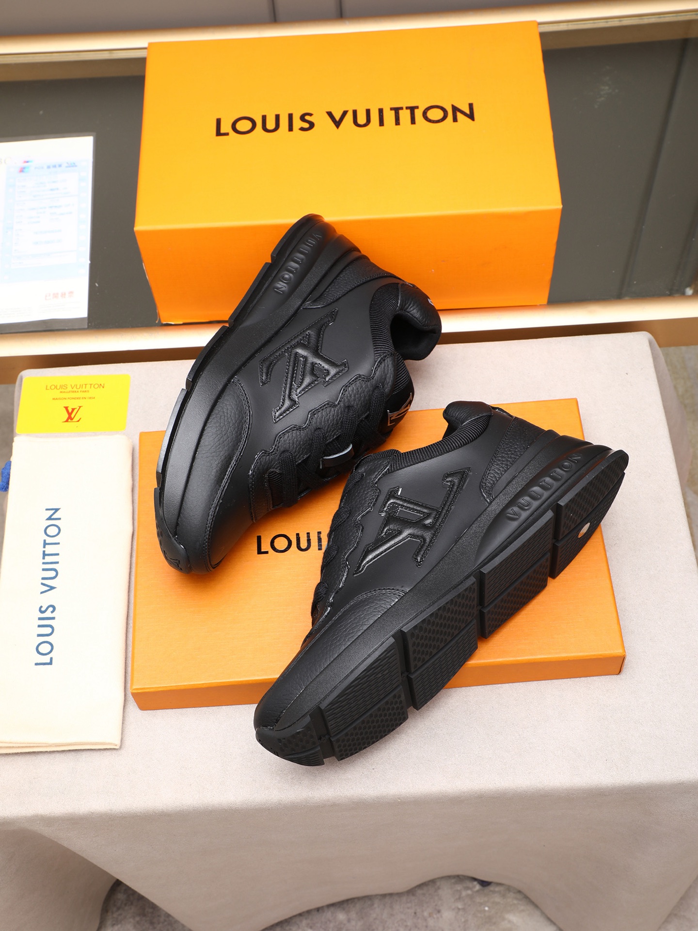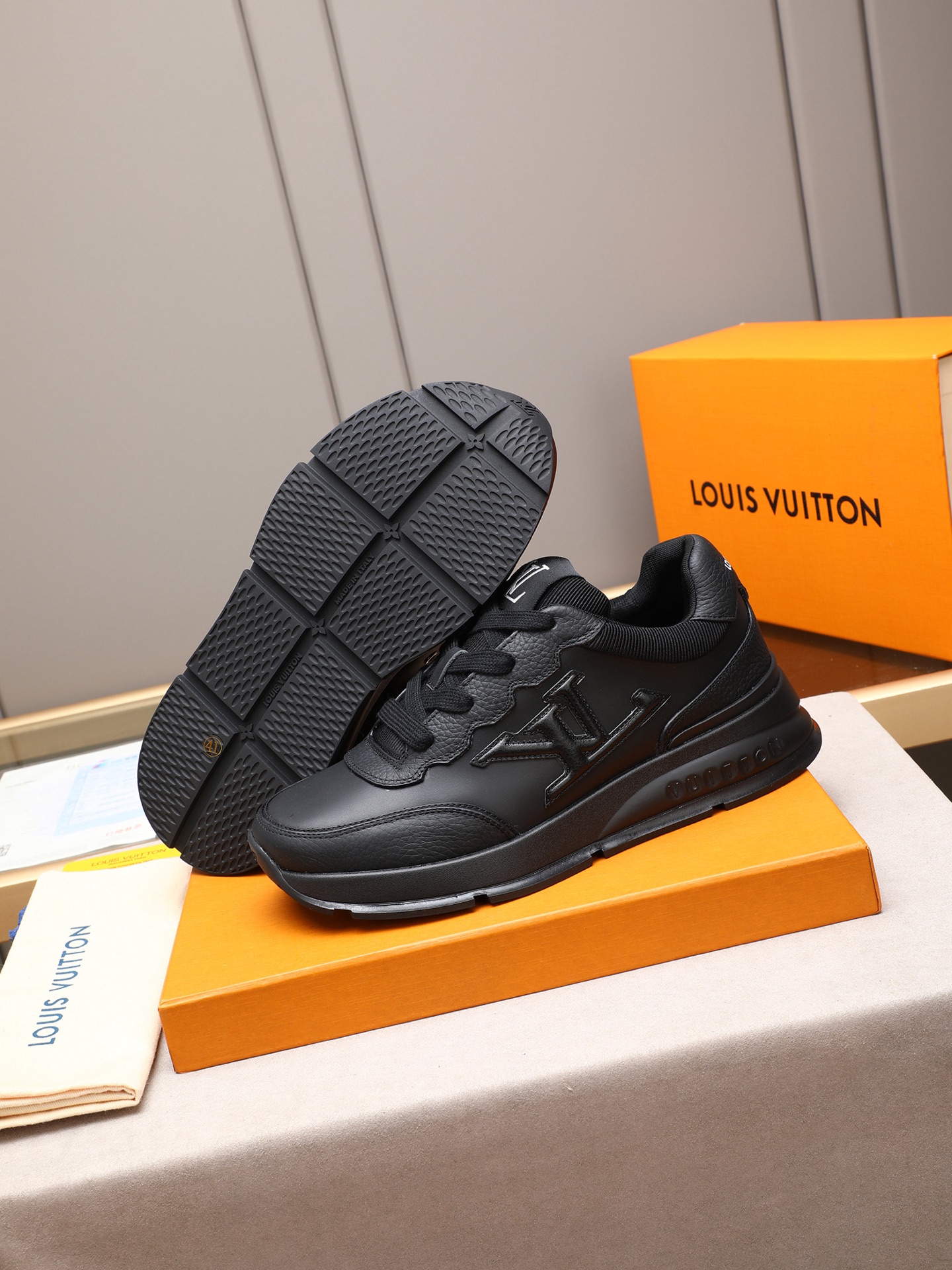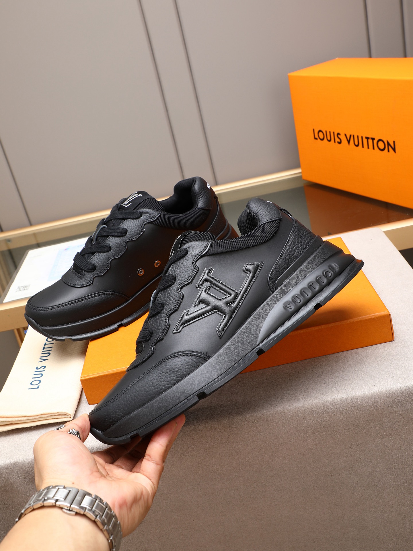 这款鞋子是AAAAA 1:1 质量 (非常棒). 使用了和原版一模一样的材料. 商标部分也保持了和路易威登/Louis Vuitton一样. 图片拍摄是实物鞋子拍摄, 您所收到的实物保证和我们图片一模一样.