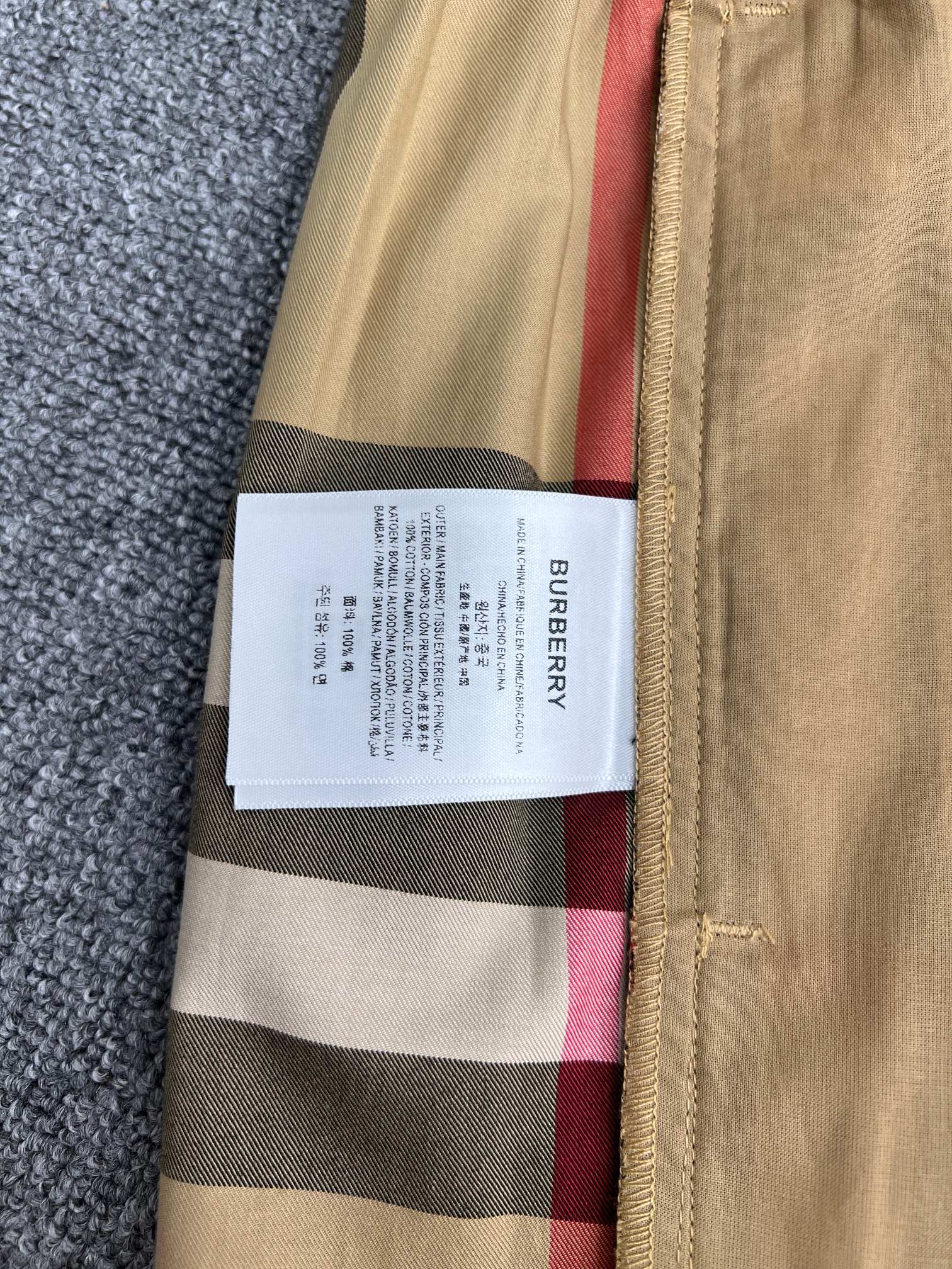 这款衣服是AAAAA 1:1 质量 (非常棒). 使用了和原版一模一样的材料. 商标部分也保持了和巴宝莉/Burberry一样. 图片拍摄是实物衣服拍摄, 您所收到的实物保证和我们图片一模一样.