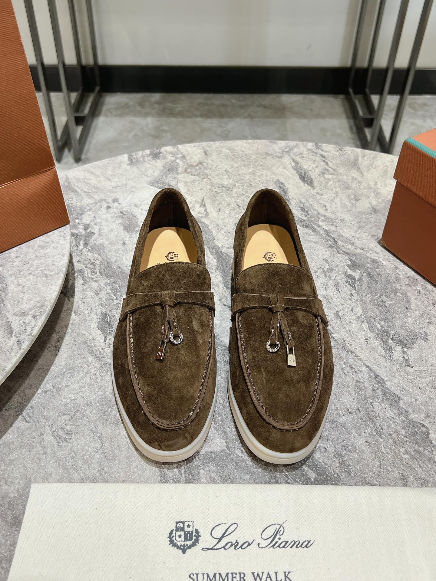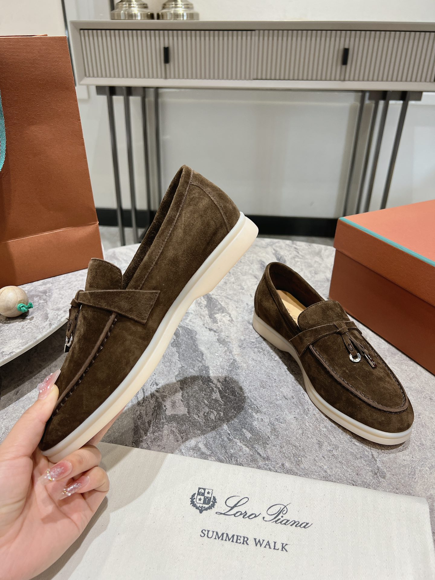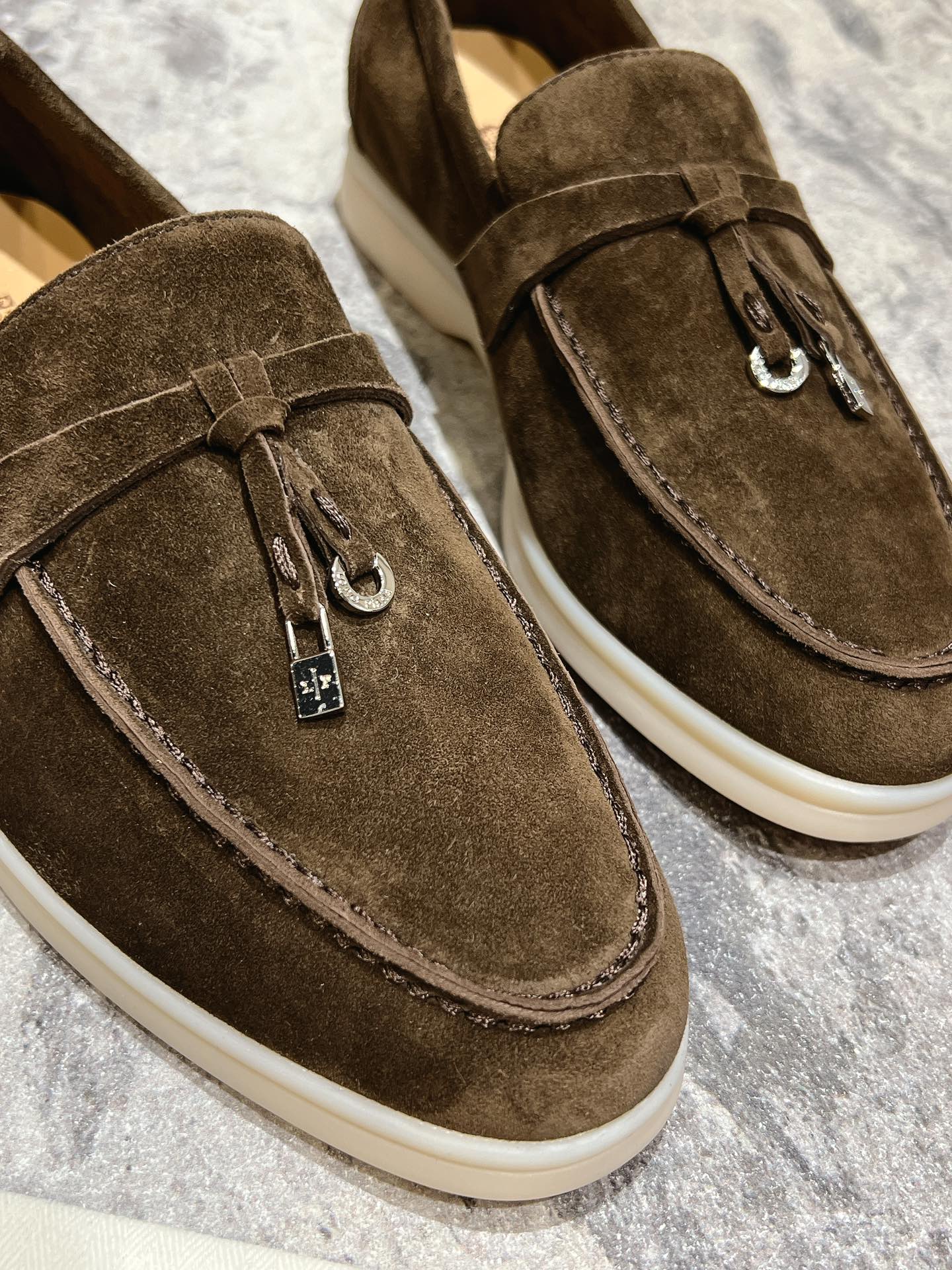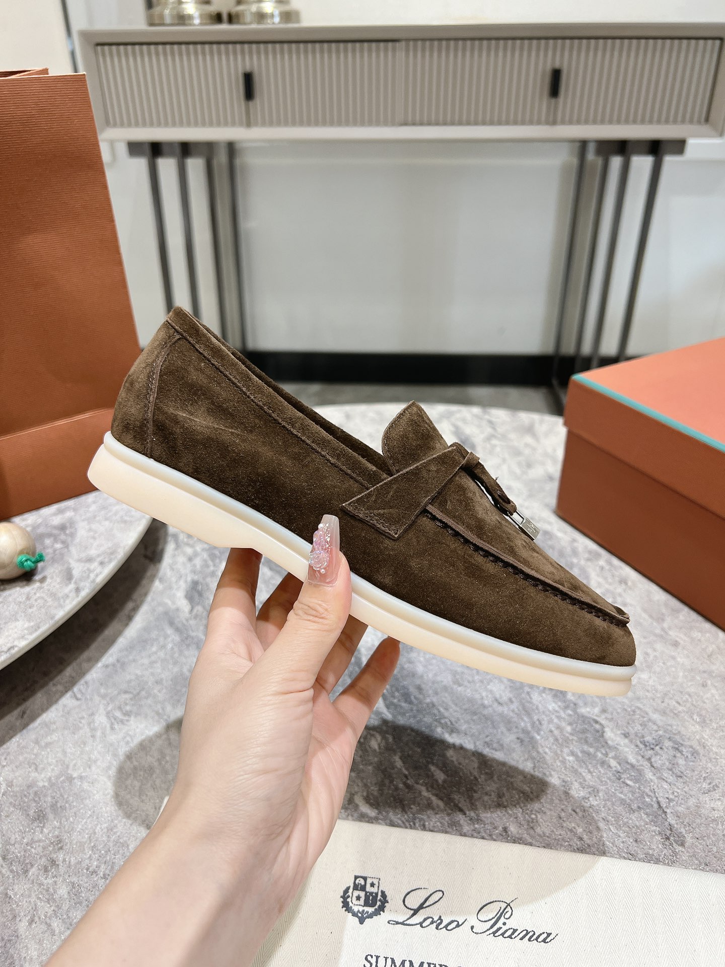 这款鞋子是AAAAA 1:1 质量 (非常棒). 使用了和原版一模一样的材料. 商标部分也保持了和洛罗皮亚纳/Loro Piana一样. 图片拍摄是实物鞋子拍摄, 您所收到的实物保证和我们图片一模一样.