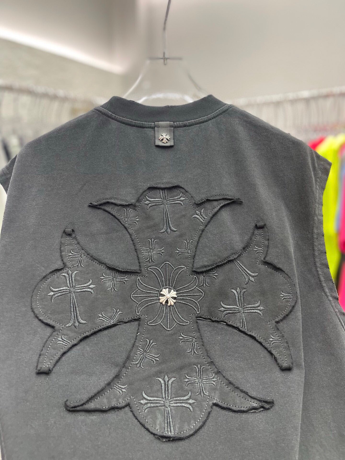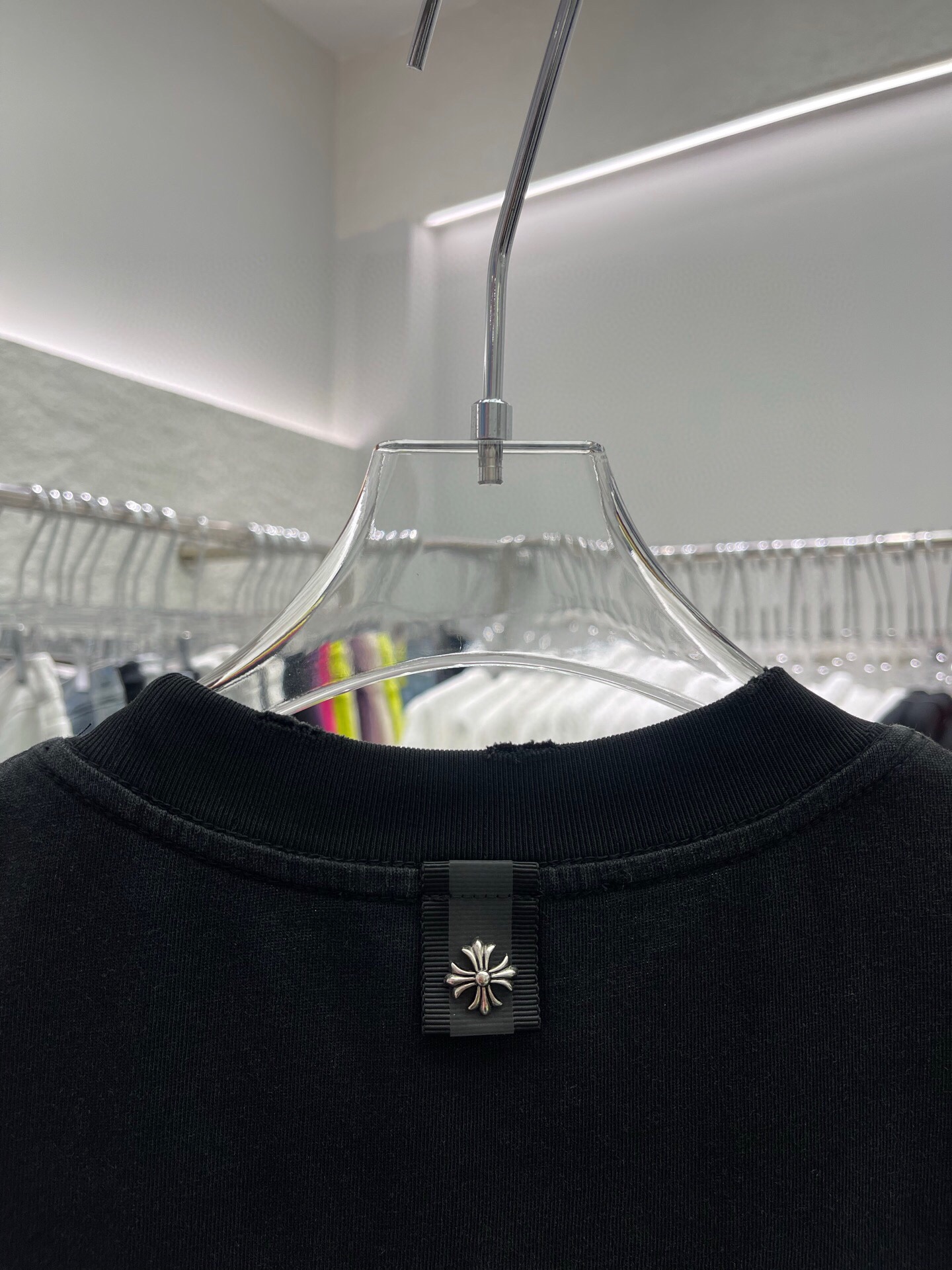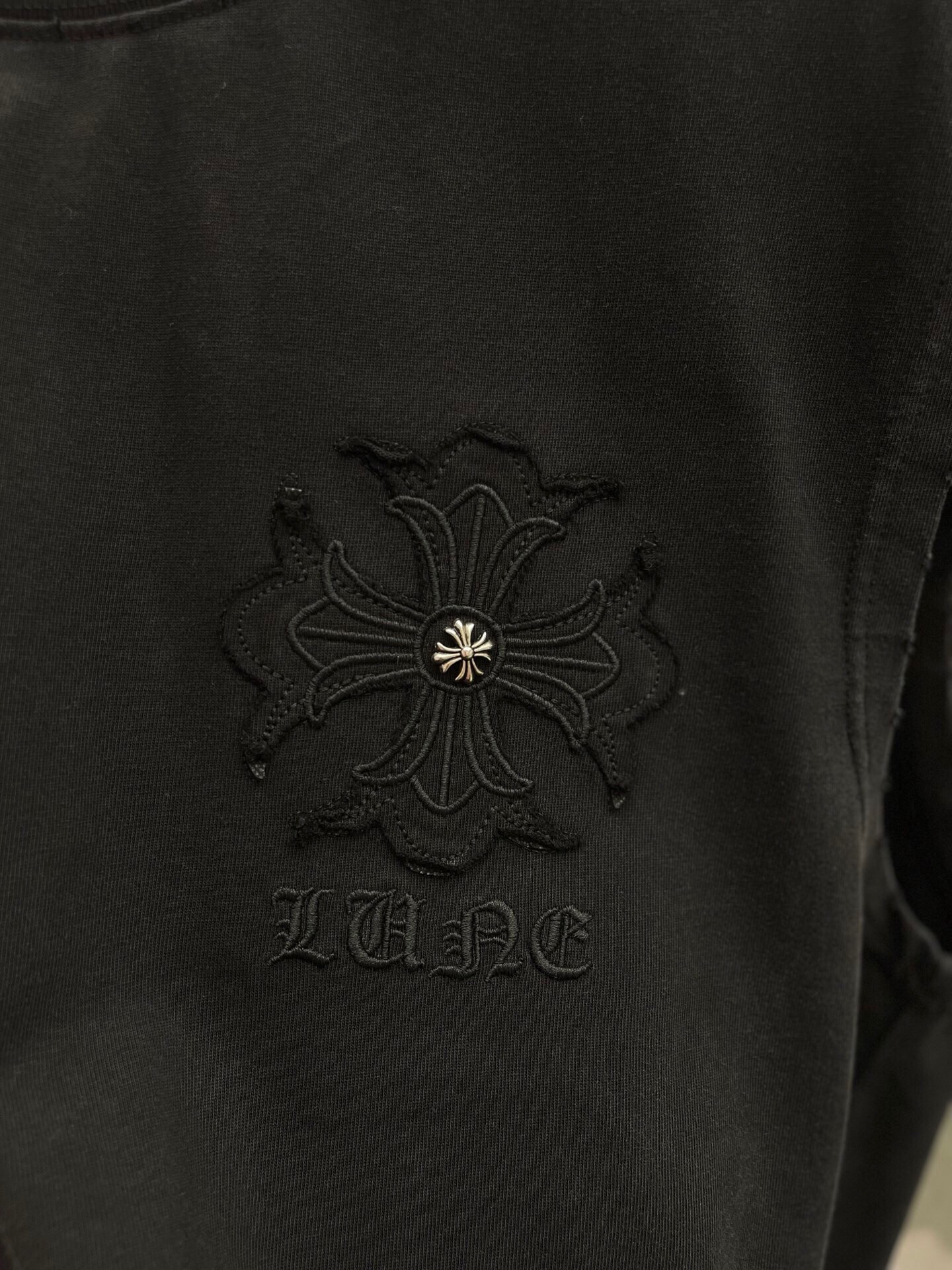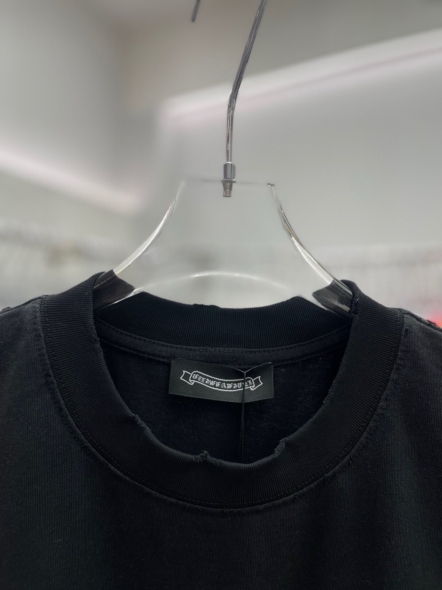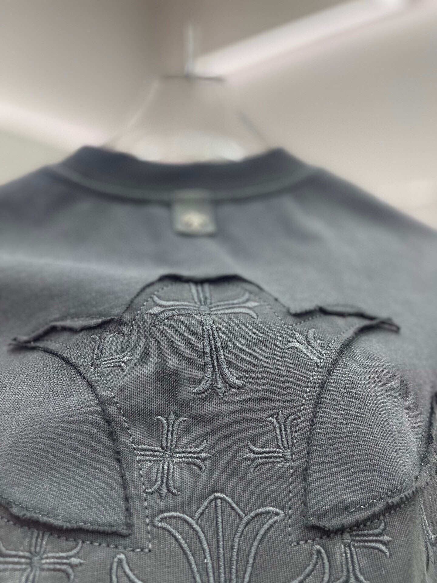 这款衣服是AAAAA 1:1 质量 (非常棒). 使用了和原版一模一样的材料. 商标部分也保持了和克罗心/Chrome Hearts一样. 图片拍摄是实物衣服拍摄, 您所收到的实物保证和我们图片一模一样.