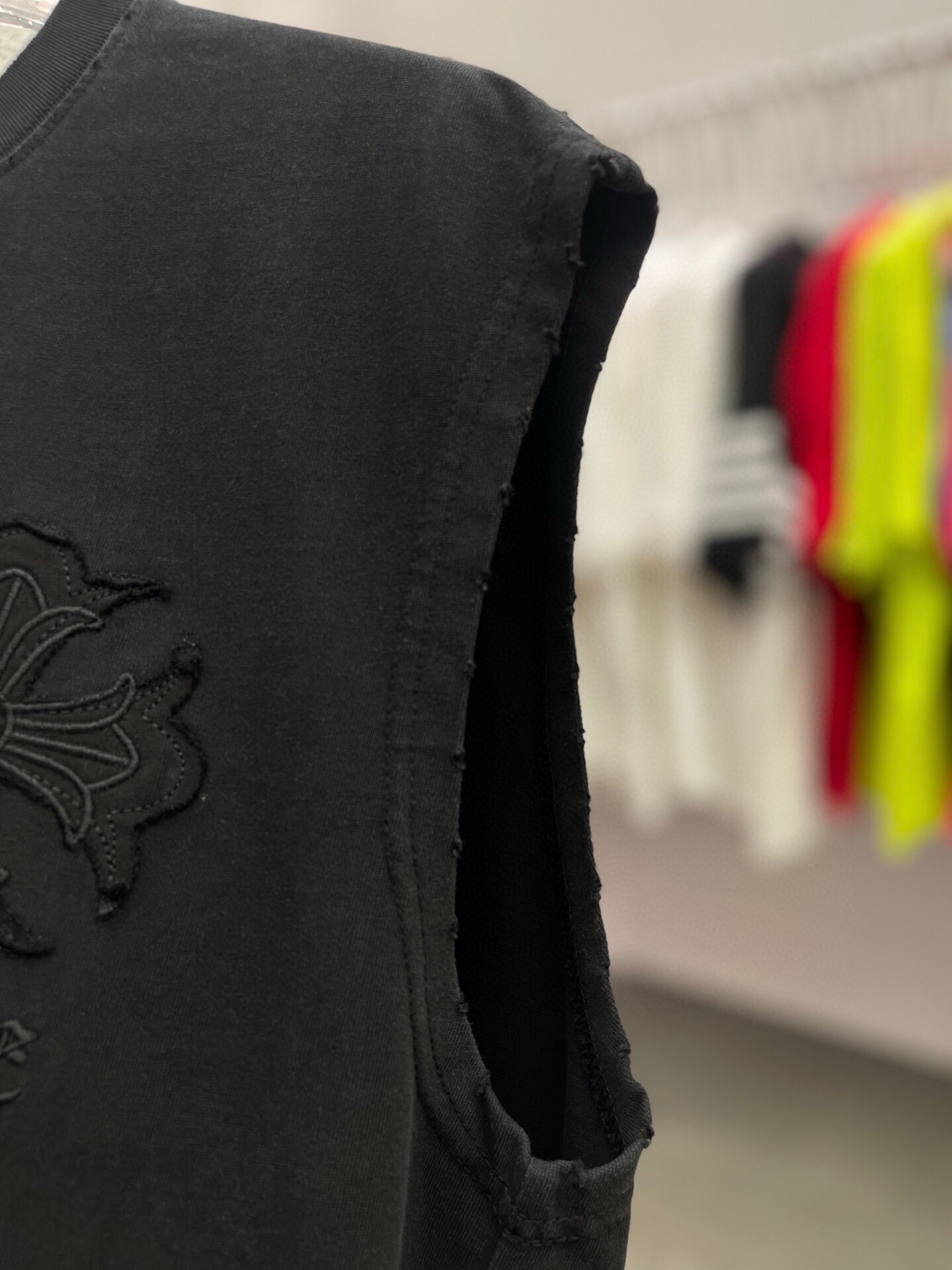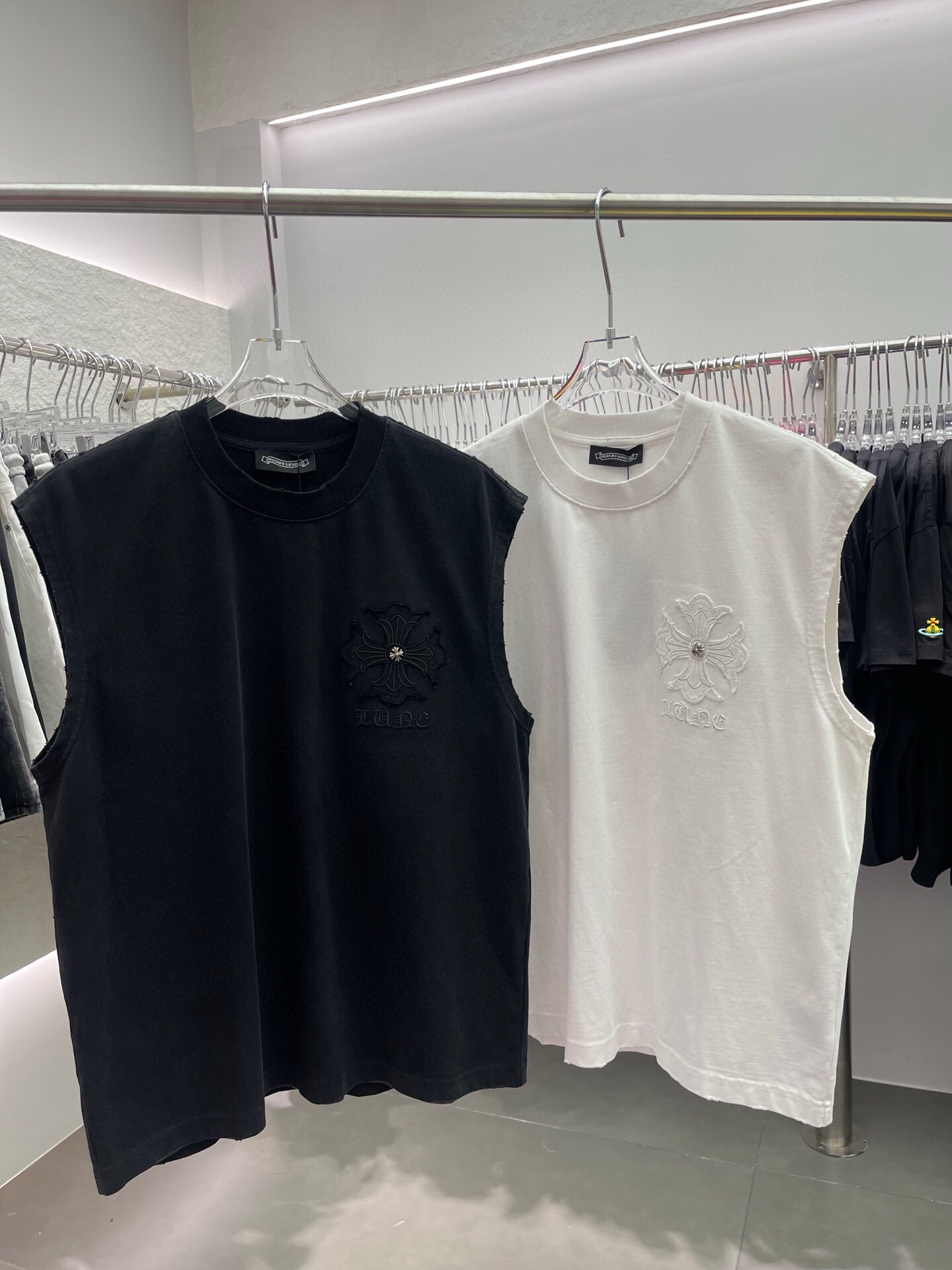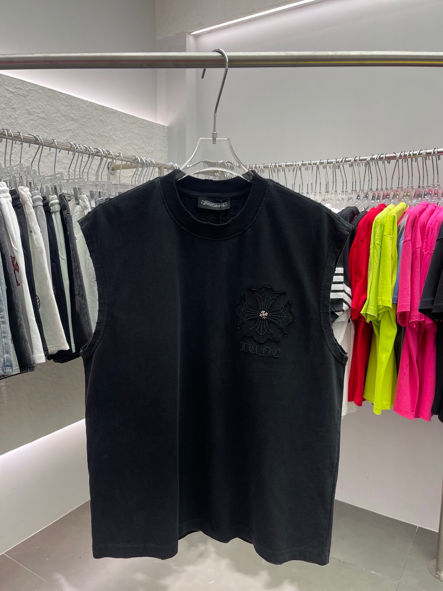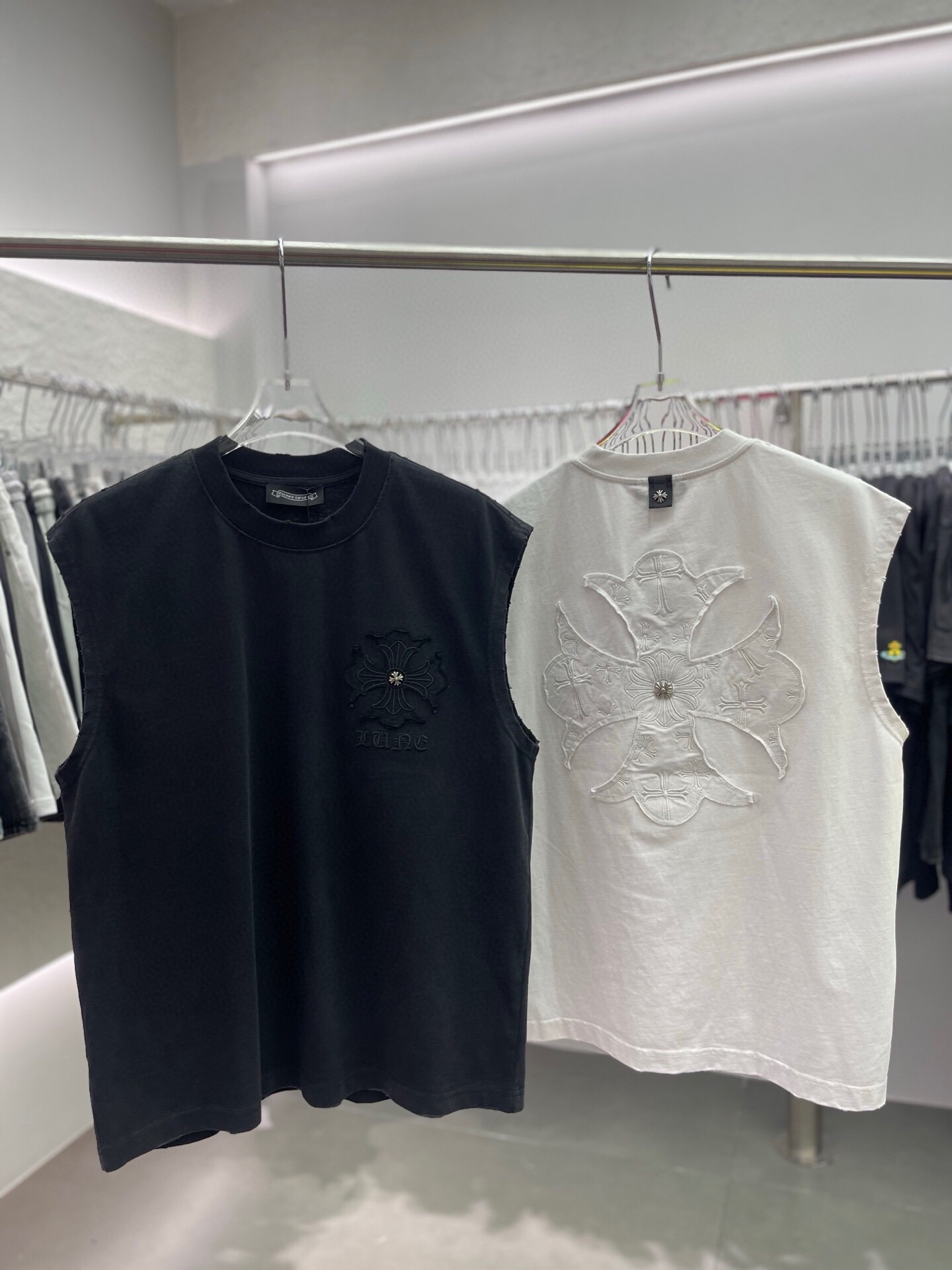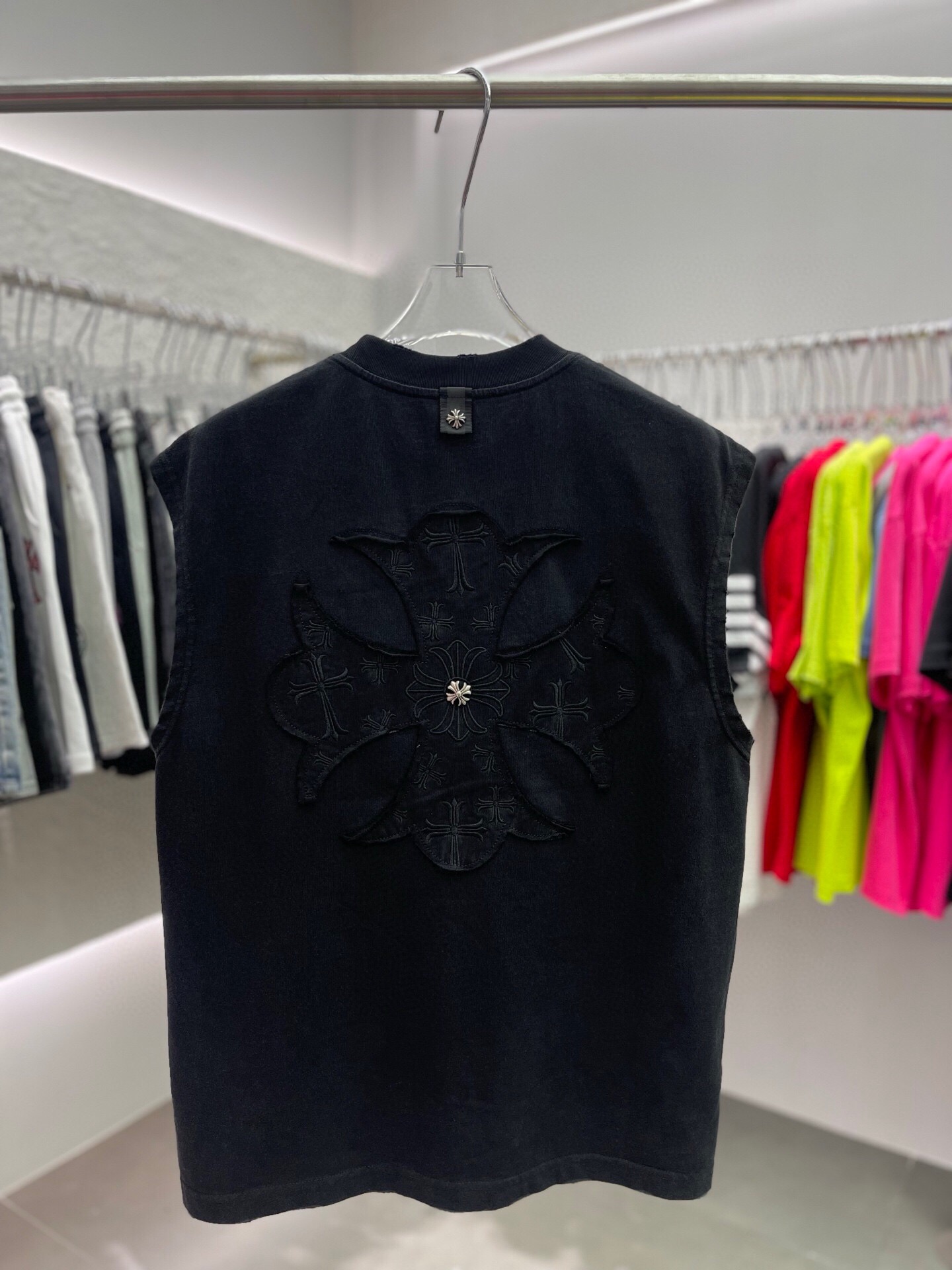 这款衣服是AAAAA 1:1 质量 (非常棒). 使用了和原版一模一样的材料. 商标部分也保持了和克罗心/Chrome Hearts一样. 图片拍摄是实物衣服拍摄, 您所收到的实物保证和我们图片一模一样.