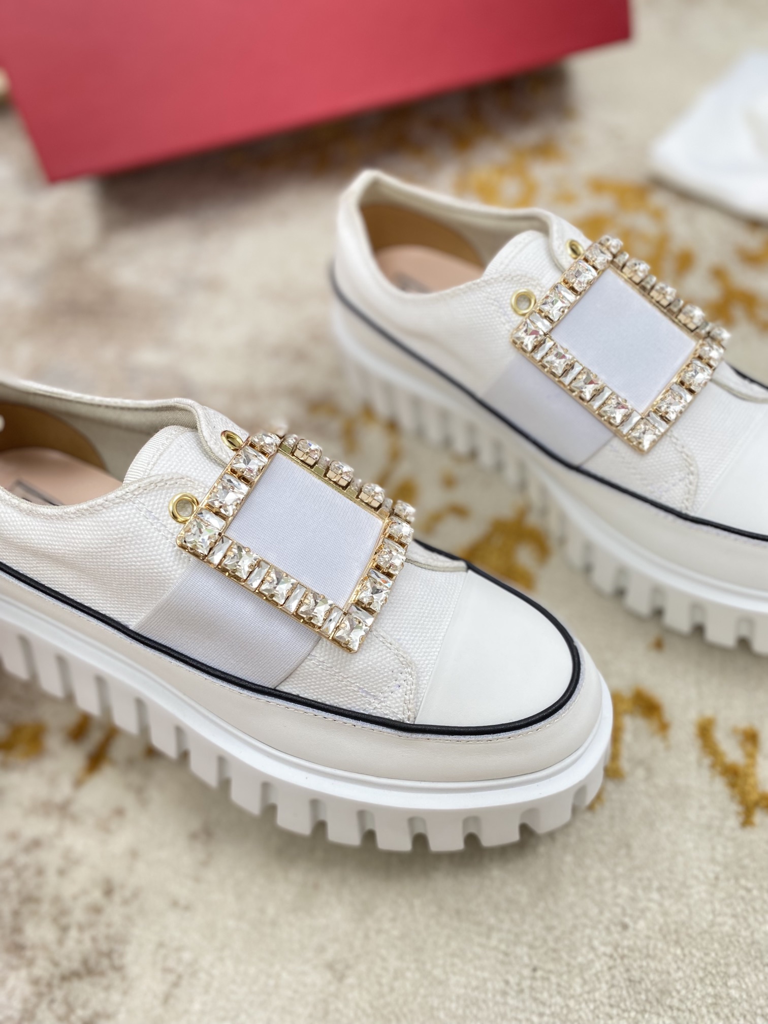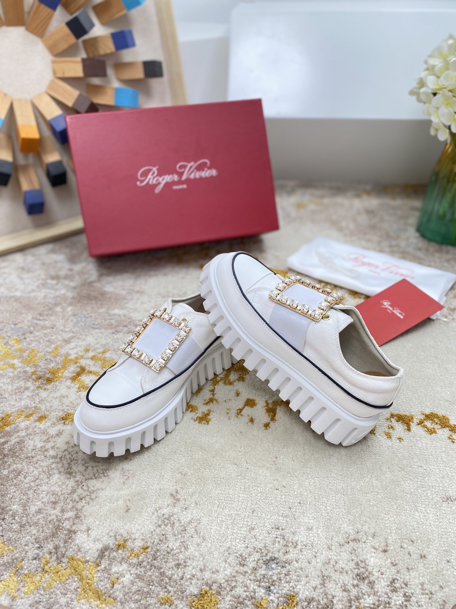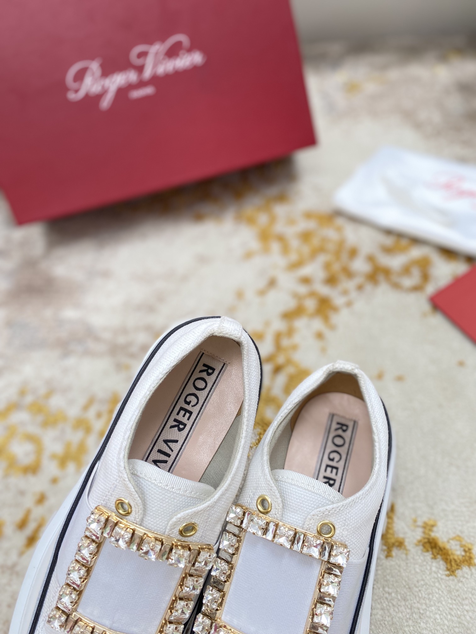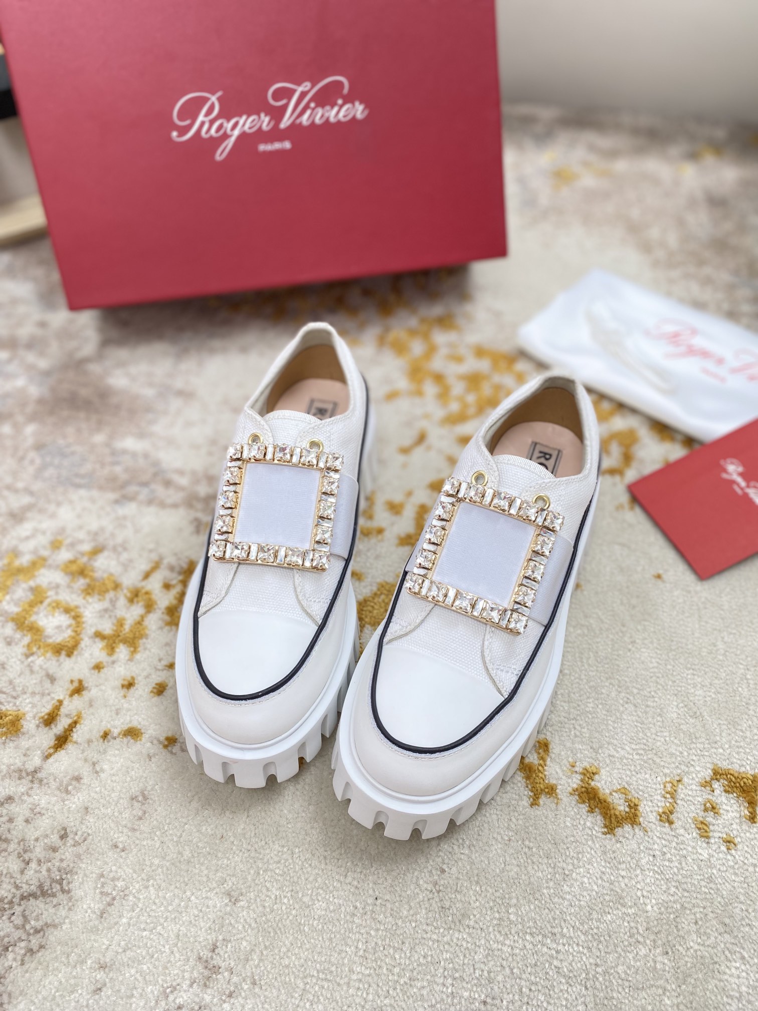 这款鞋子是AAAAA 1:1 质量 (非常棒). 使用了和原版一模一样的材料. 商标部分也保持了和罗杰维维耶/Roger Vivier一样. 图片拍摄是实物鞋子拍摄, 您所收到的实物保证和我们图片一模一样.