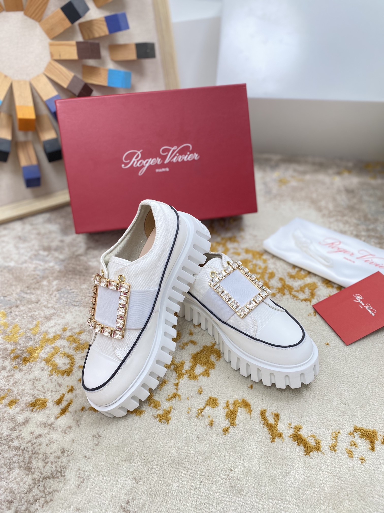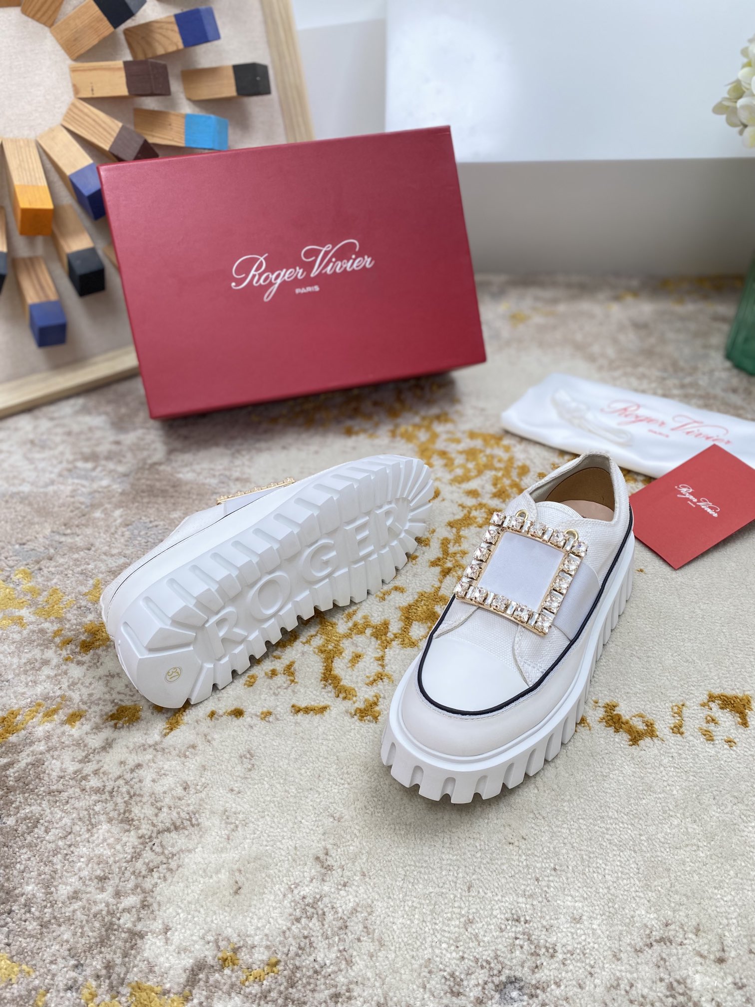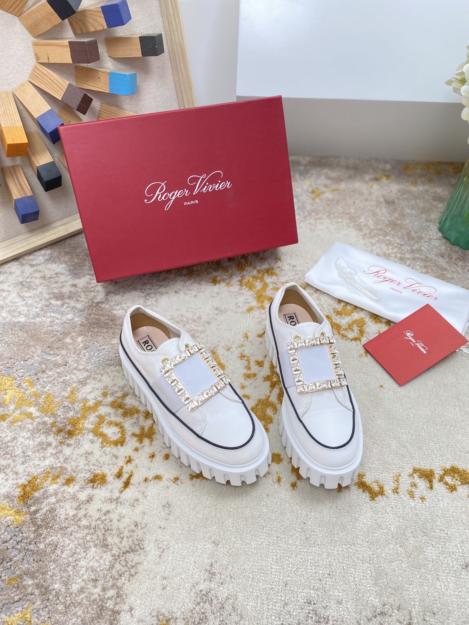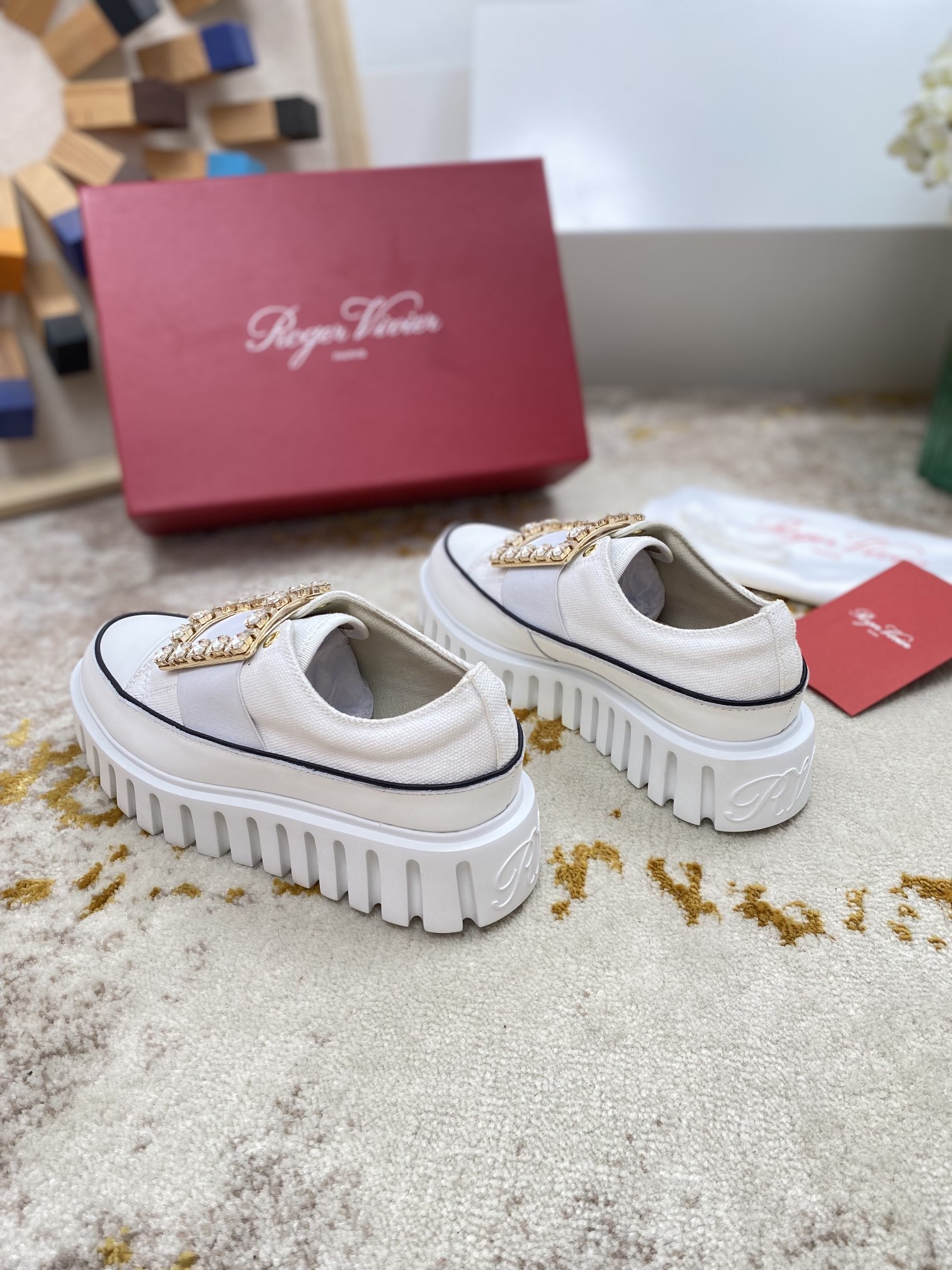 这款鞋子是AAAAA 1:1 质量 (非常棒). 使用了和原版一模一样的材料. 商标部分也保持了和罗杰维维耶/Roger Vivier一样. 图片拍摄是实物鞋子拍摄, 您所收到的实物保证和我们图片一模一样.