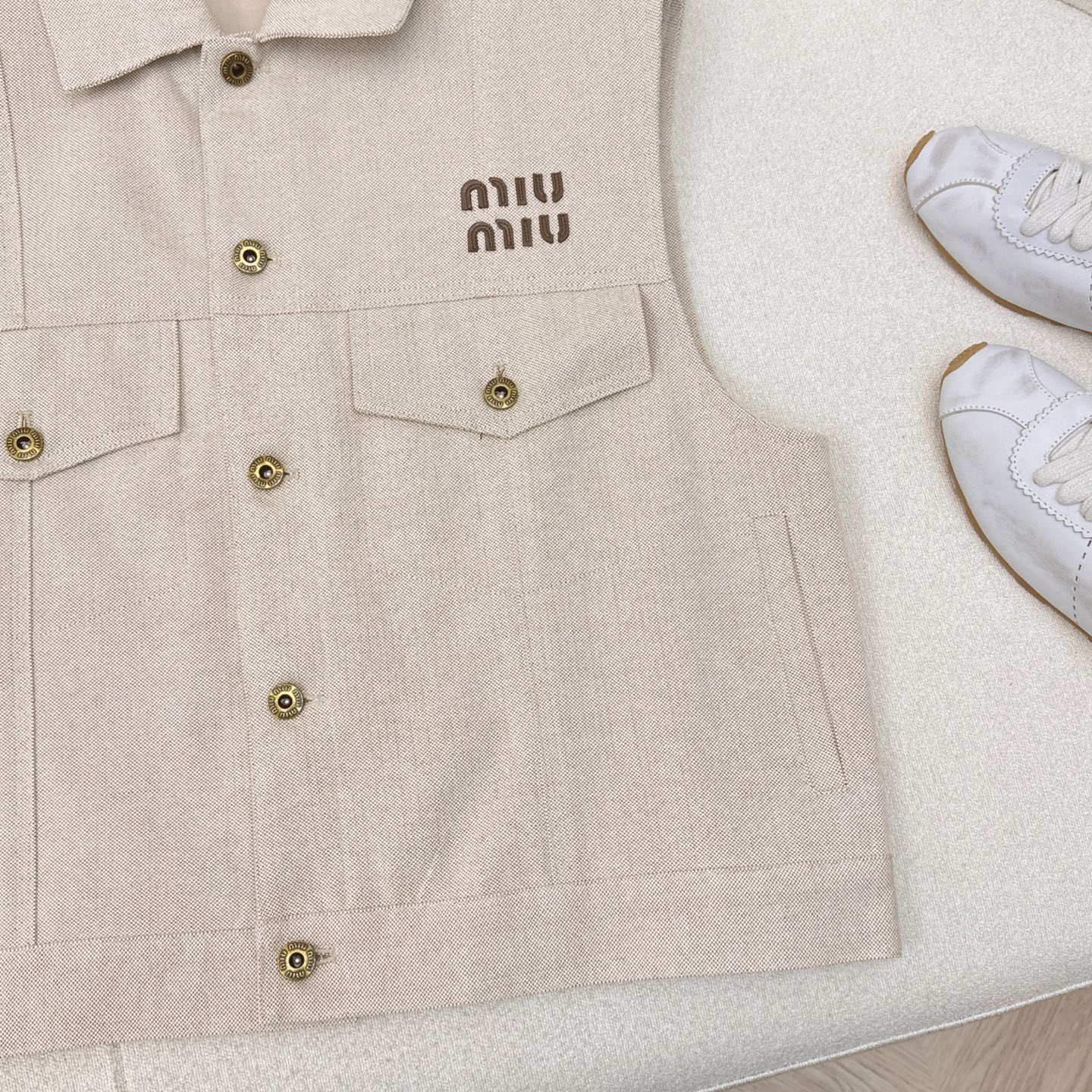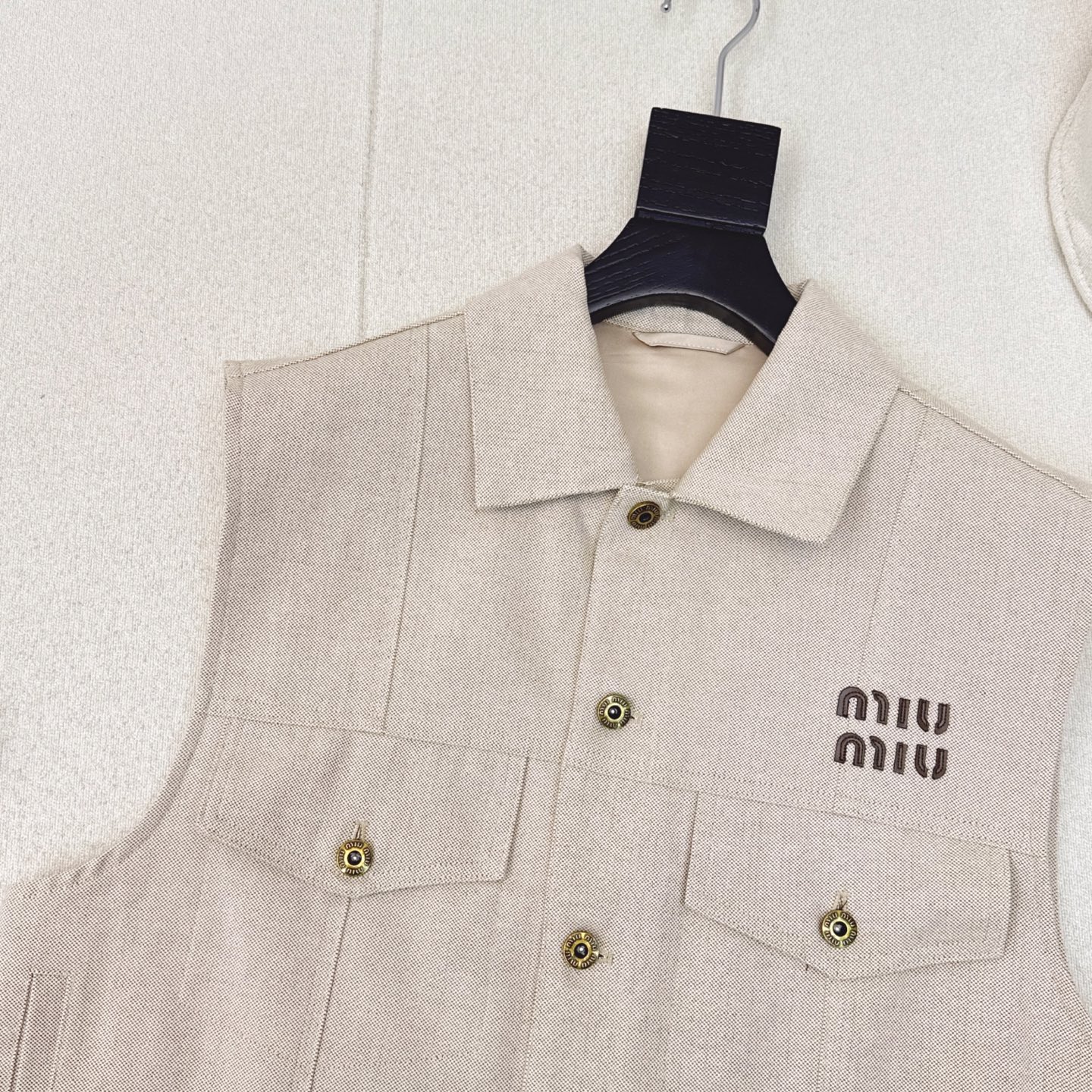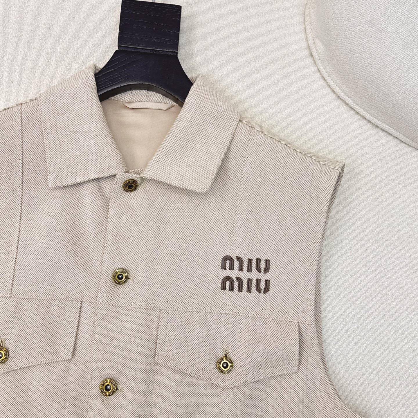 这款衣服是AAAAA 1:1 质量 (非常棒). 使用了和原版一模一样的材料. 商标部分也保持了和缪缪/Miu Miu一样. 图片拍摄是实物衣服拍摄, 您所收到的实物保证和我们图片一模一样.
