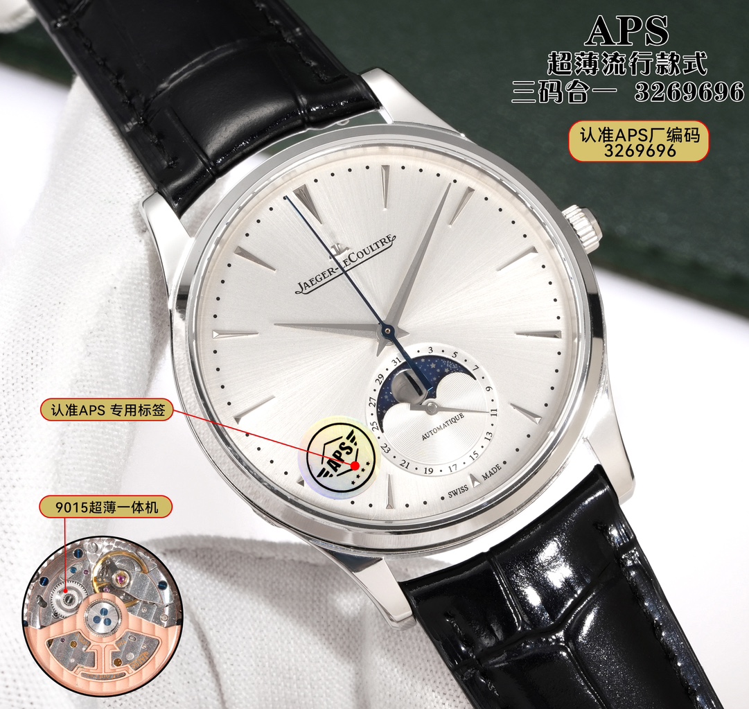 这款手表是AAAAA 1:1 质量 (非常棒). 使用了和原版一模一样的材料. 商标部分也保持了和Jaeger Lecoultre一样. 图片拍摄是实物手表拍摄, 您所收到的实物保证和我们图片一模一样.