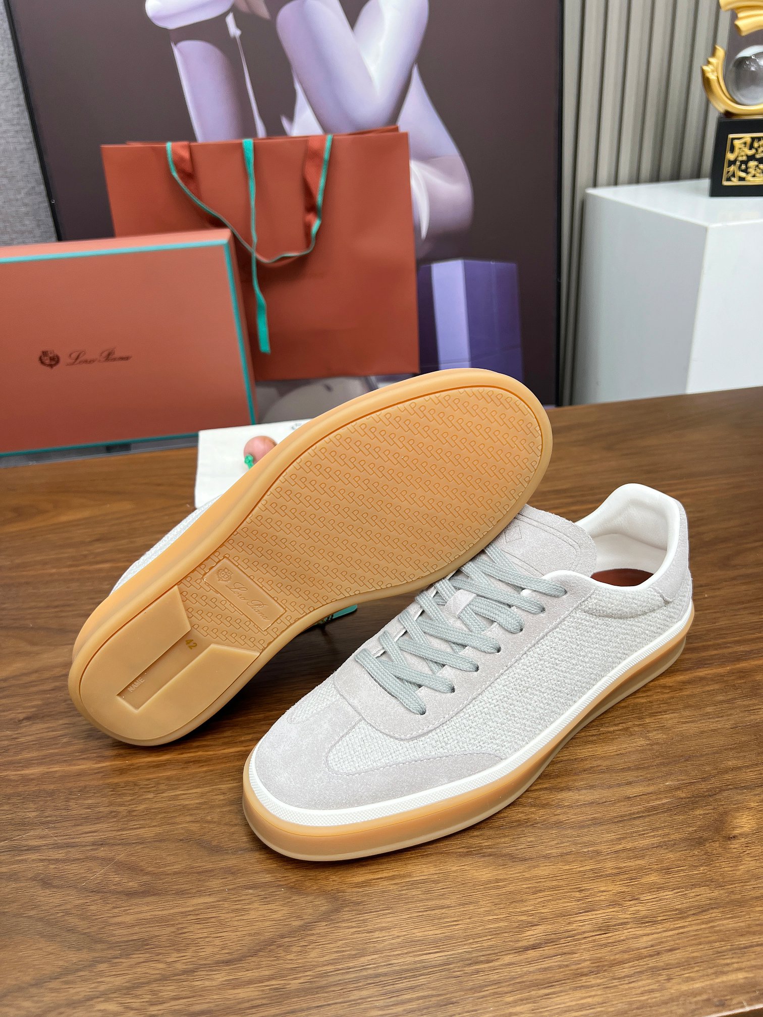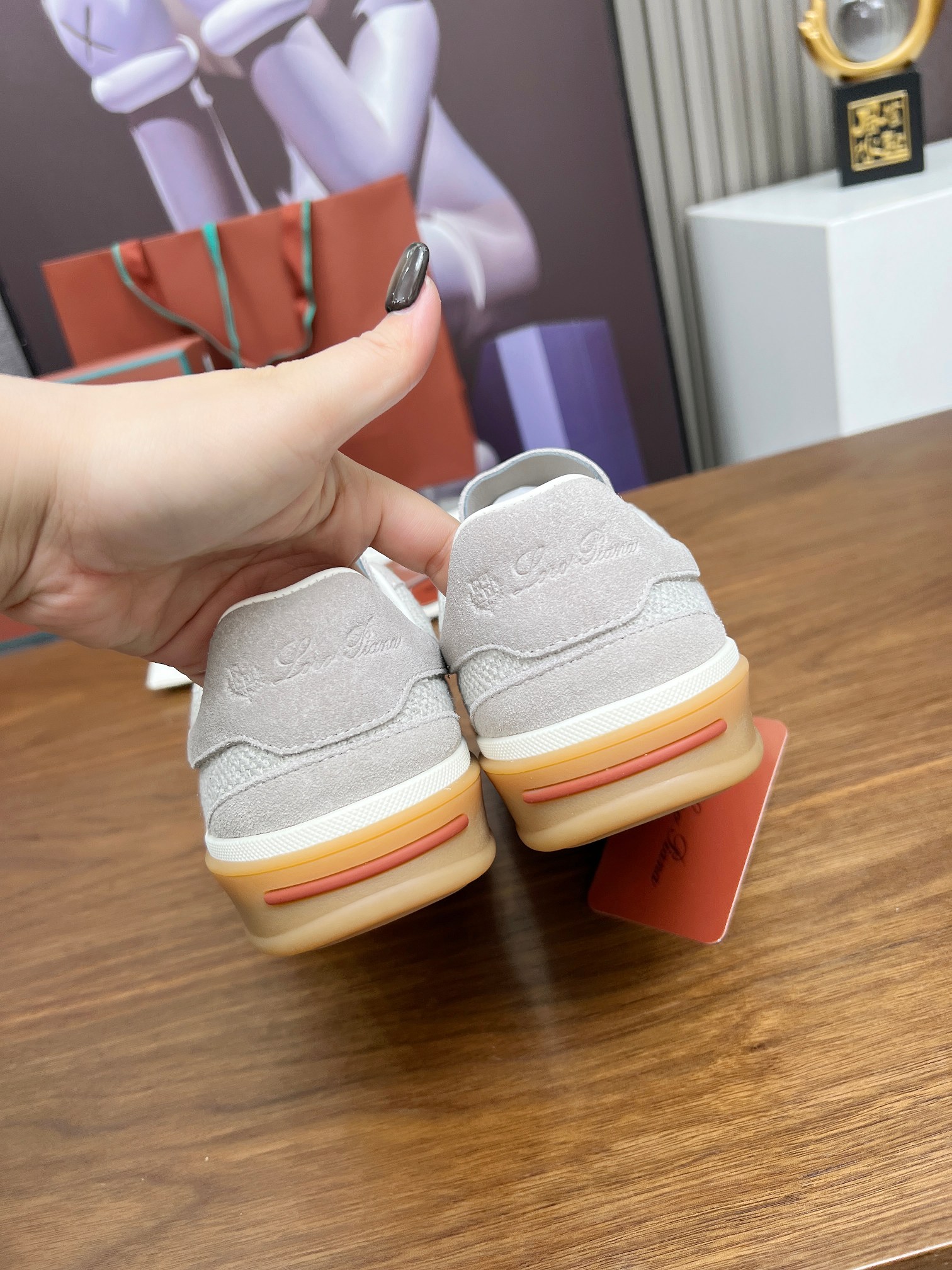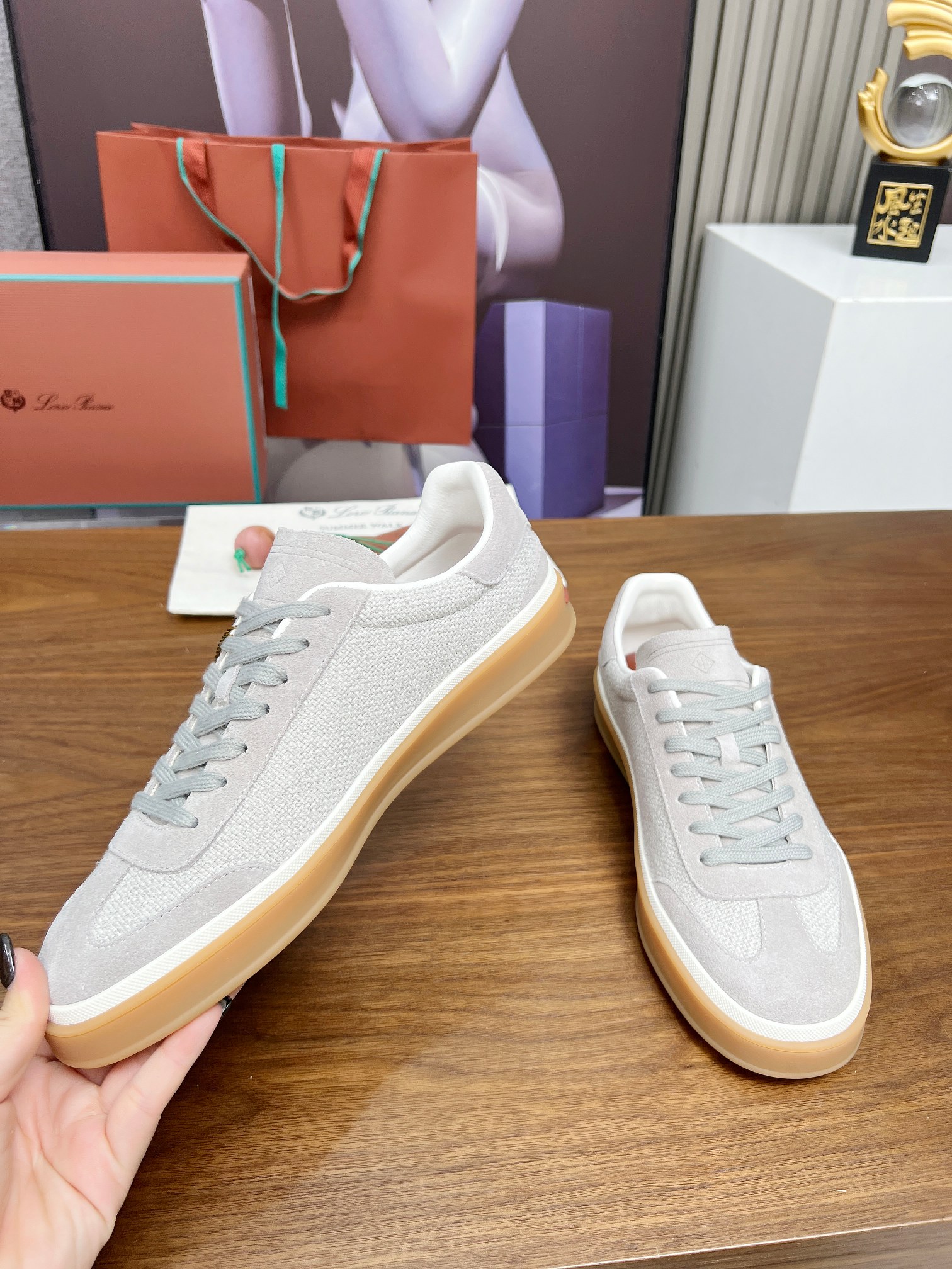 这款鞋子是AAAAA 1:1 质量 (非常棒). 使用了和原版一模一样的材料. 商标部分也保持了和洛罗皮亚纳/Loro Piana一样. 图片拍摄是实物鞋子拍摄, 您所收到的实物保证和我们图片一模一样.