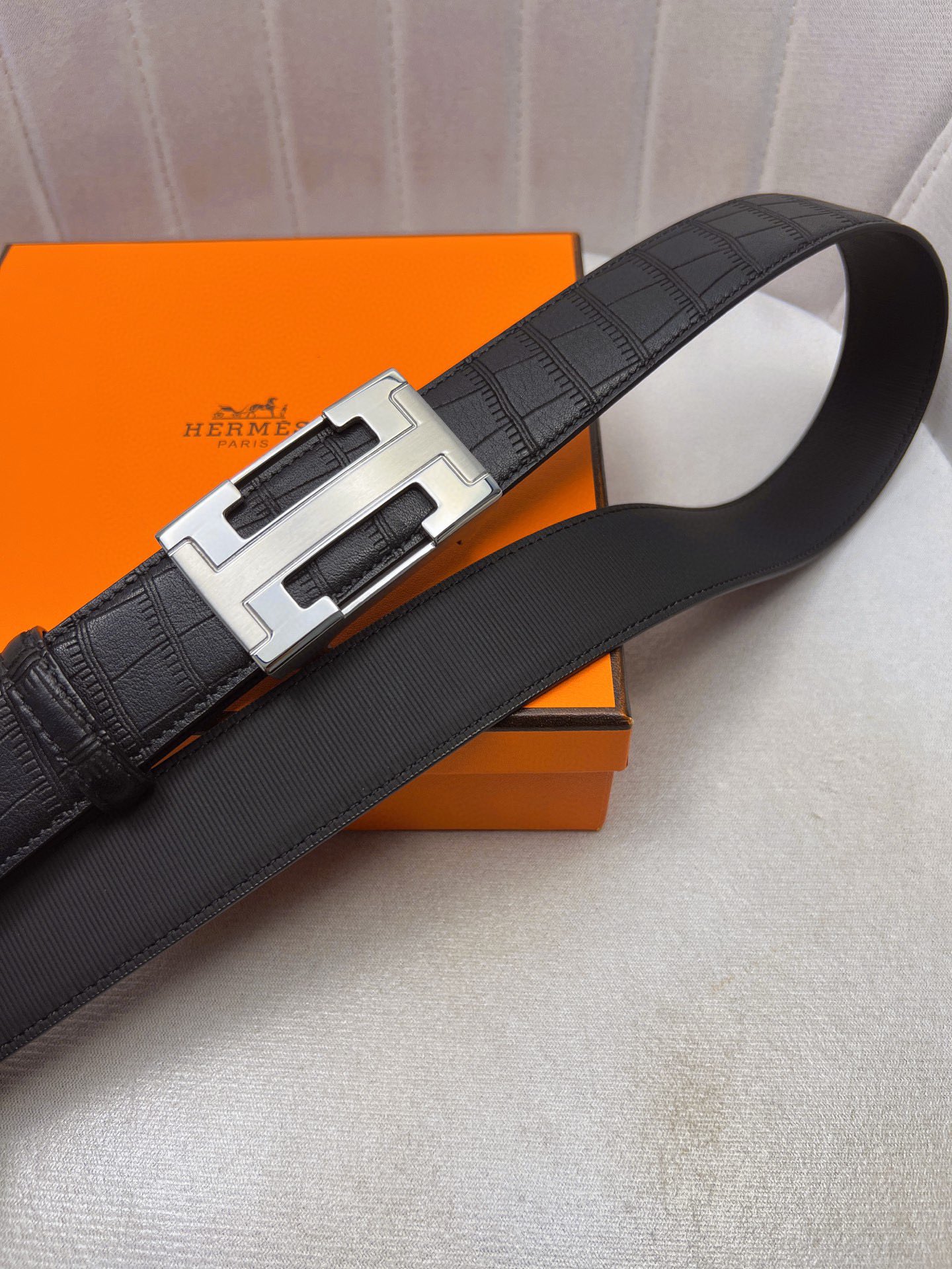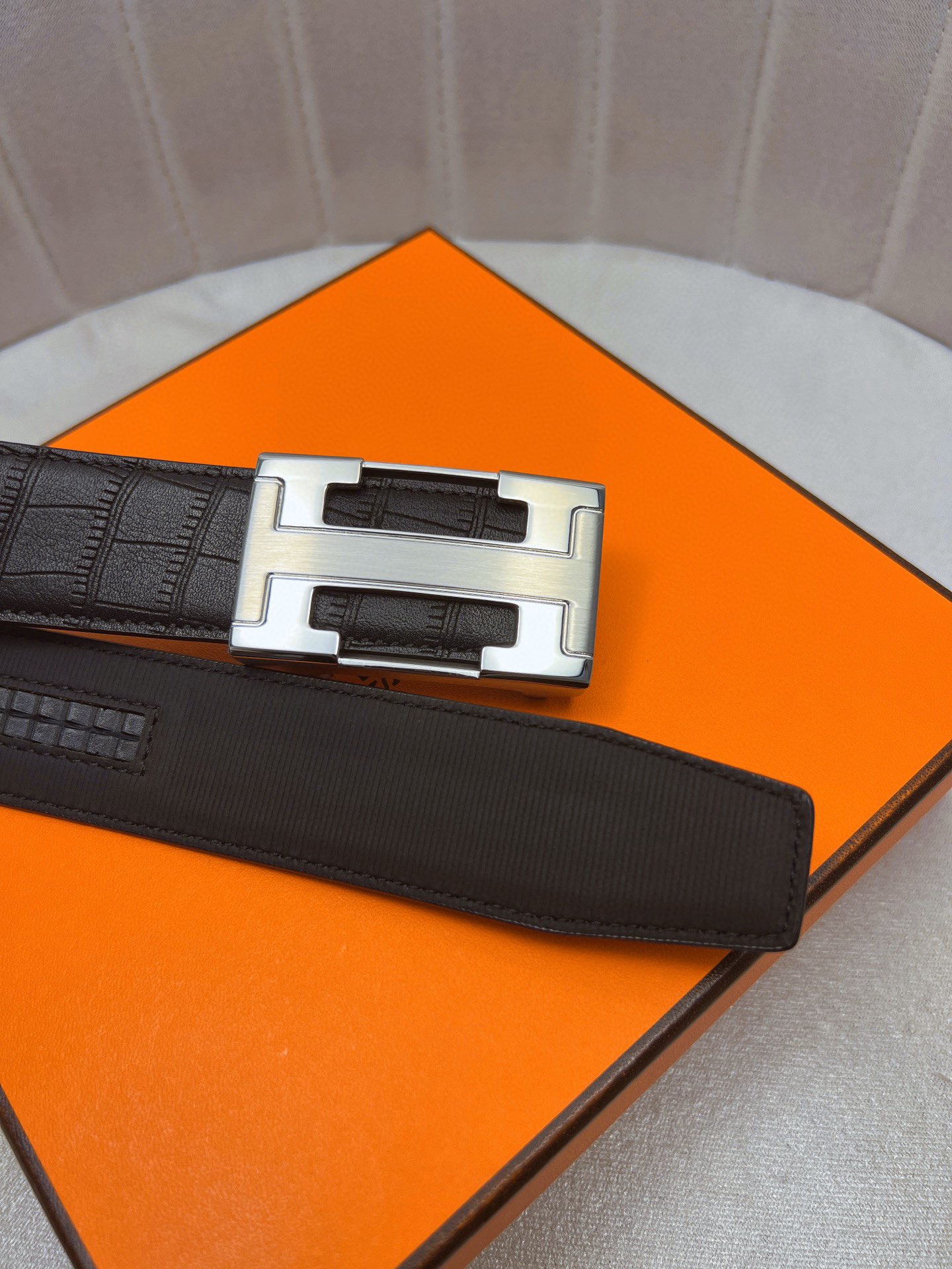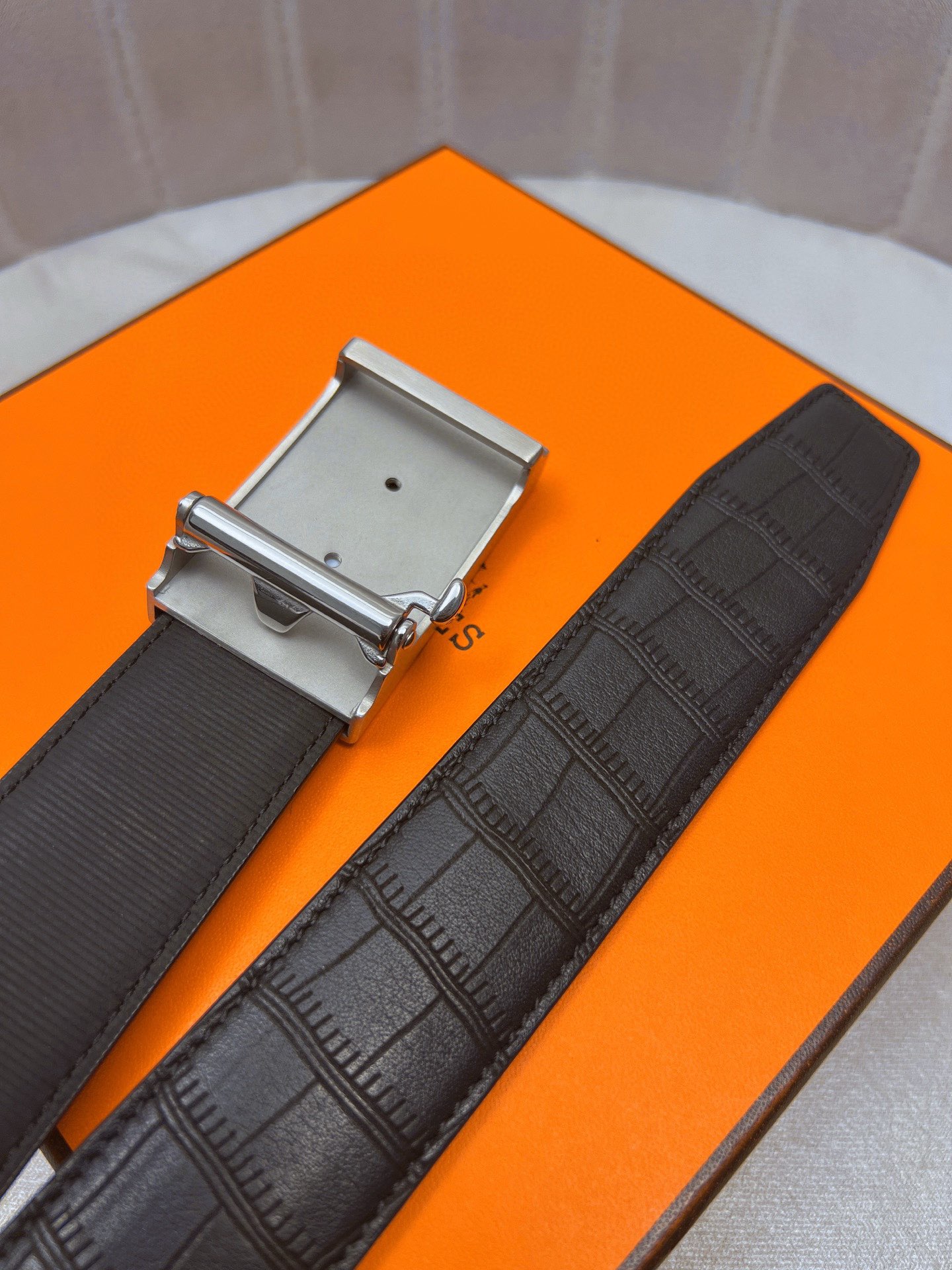 这款皮带是AAAAA 1:1 质量 (非常棒). 使用了和原版一模一样的材料. 商标部分也保持了和爱马仕/Hermes一样. 图片拍摄是实物皮带拍摄, 您所收到的实物保证和我们图片一模一样.