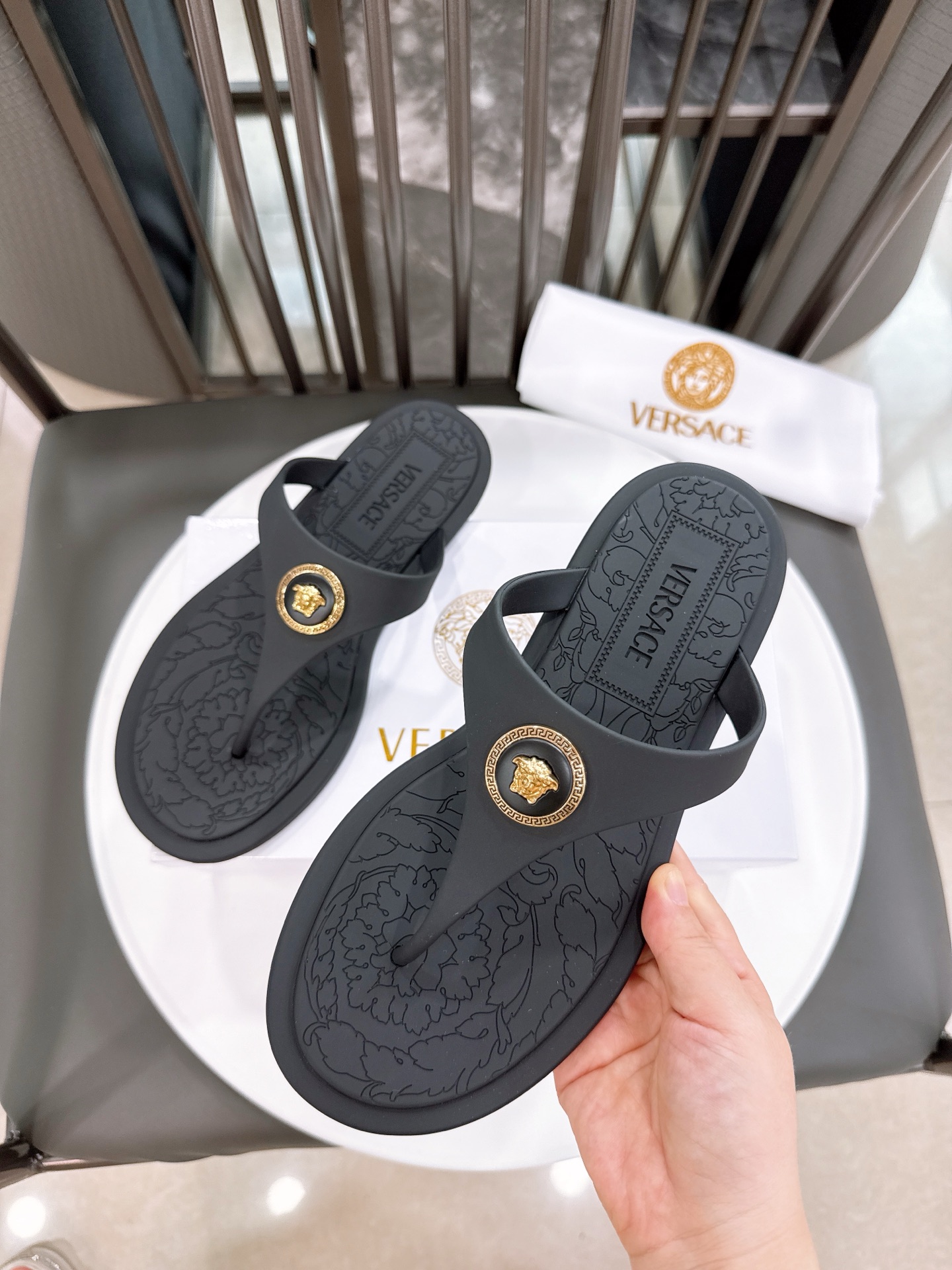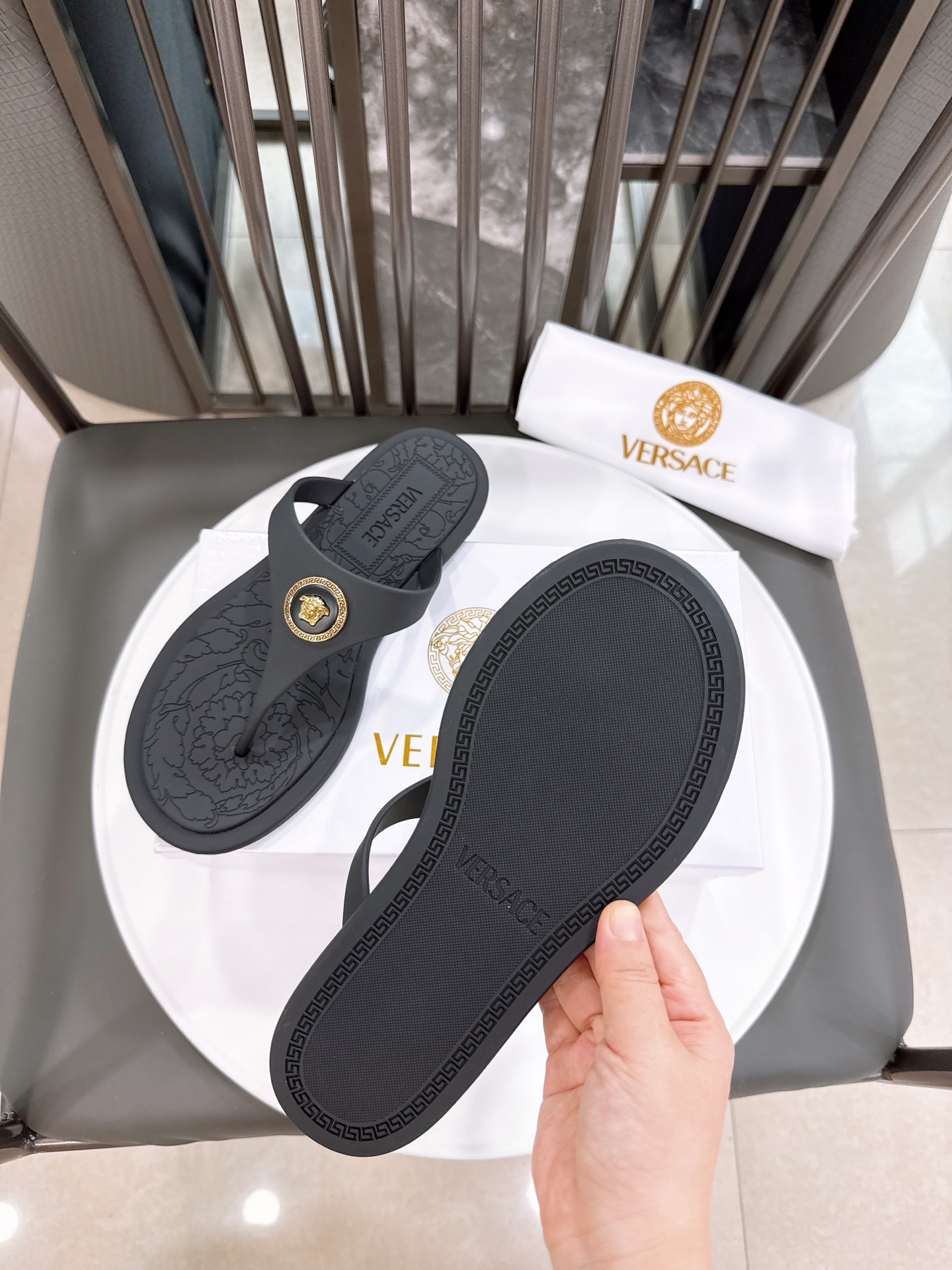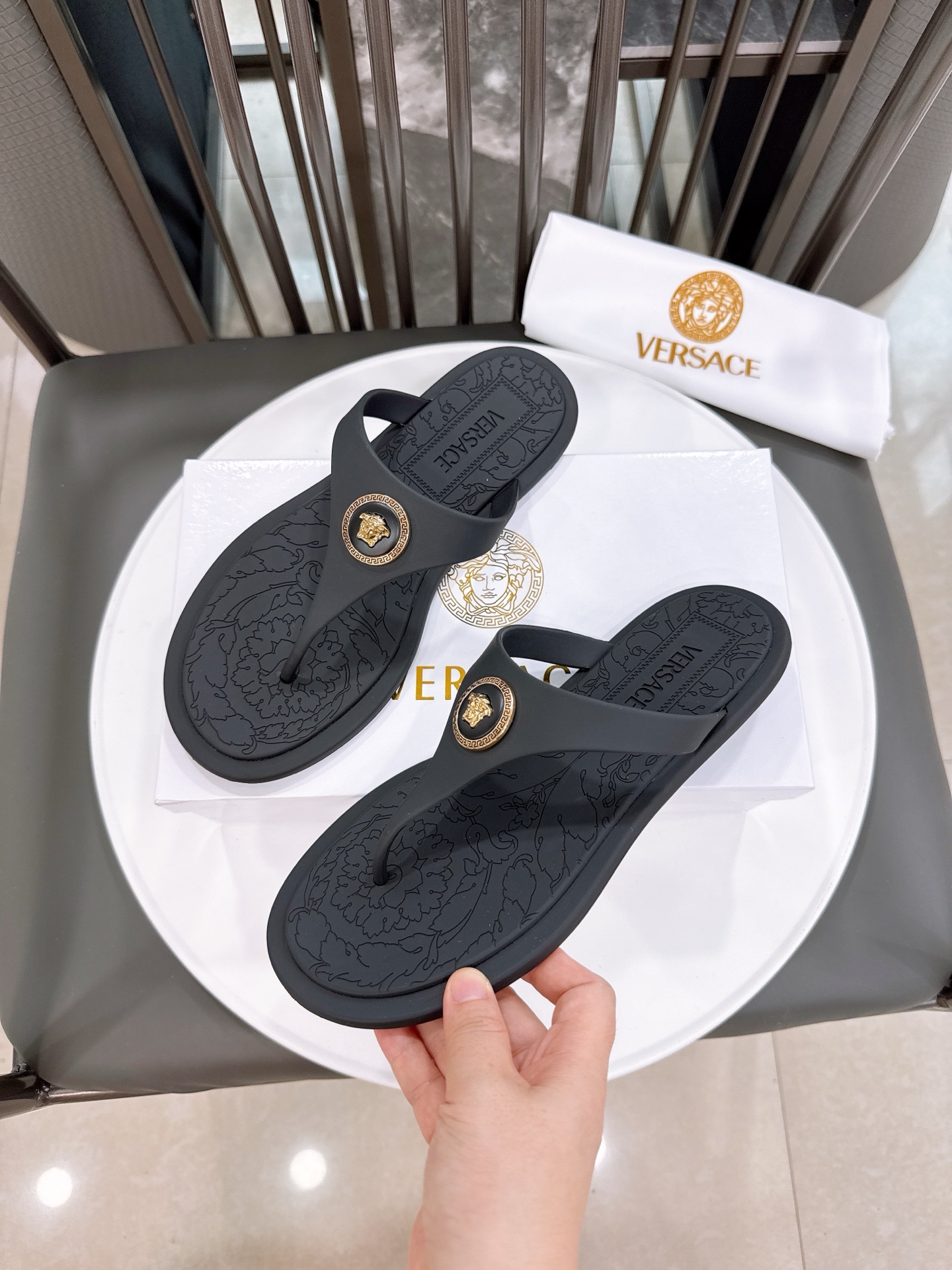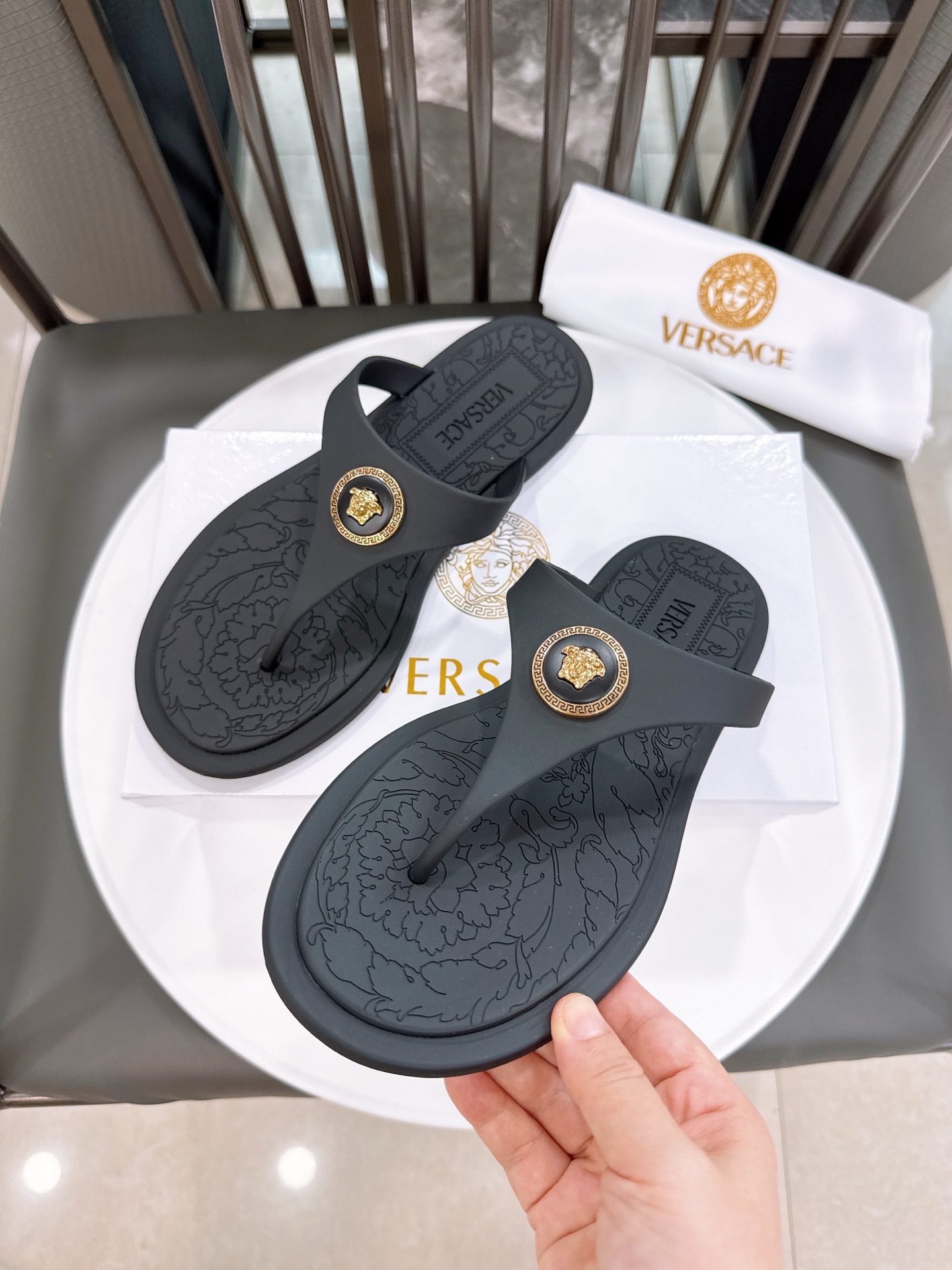 这款鞋子是AAAAA 1:1 质量 (非常棒). 使用了和原版一模一样的材料. 商标部分也保持了和范思哲/Versace一样. 图片拍摄是实物鞋子拍摄, 您所收到的实物保证和我们图片一模一样.