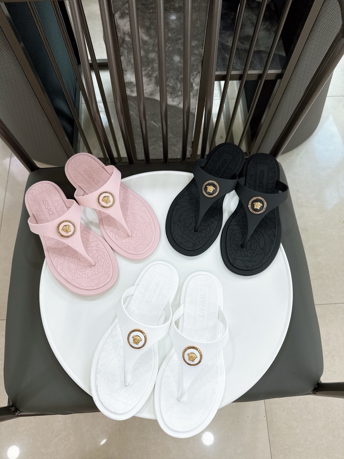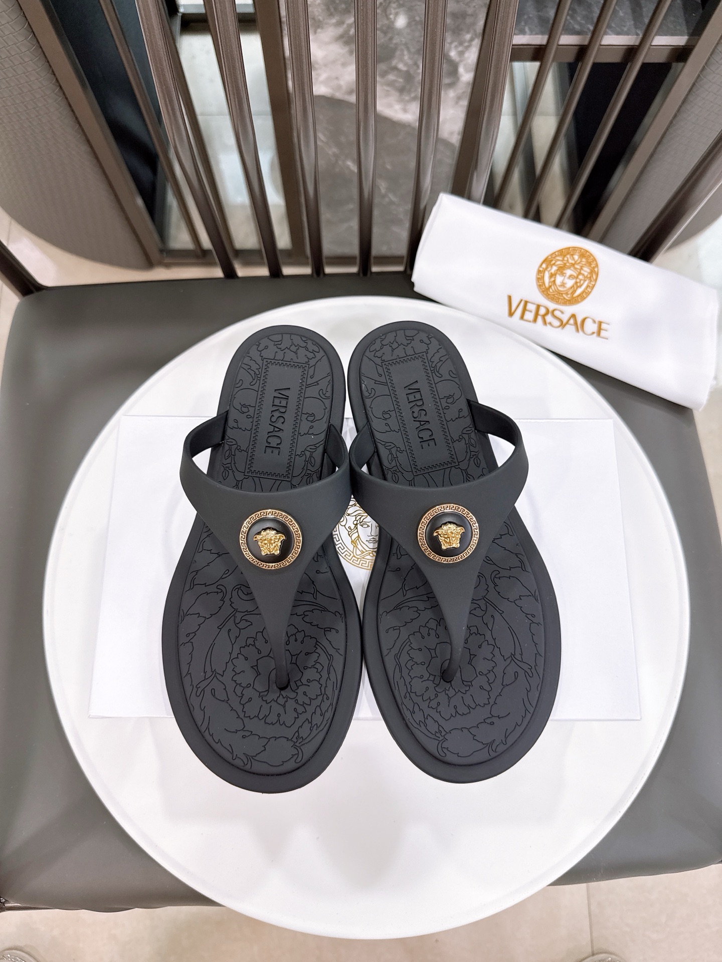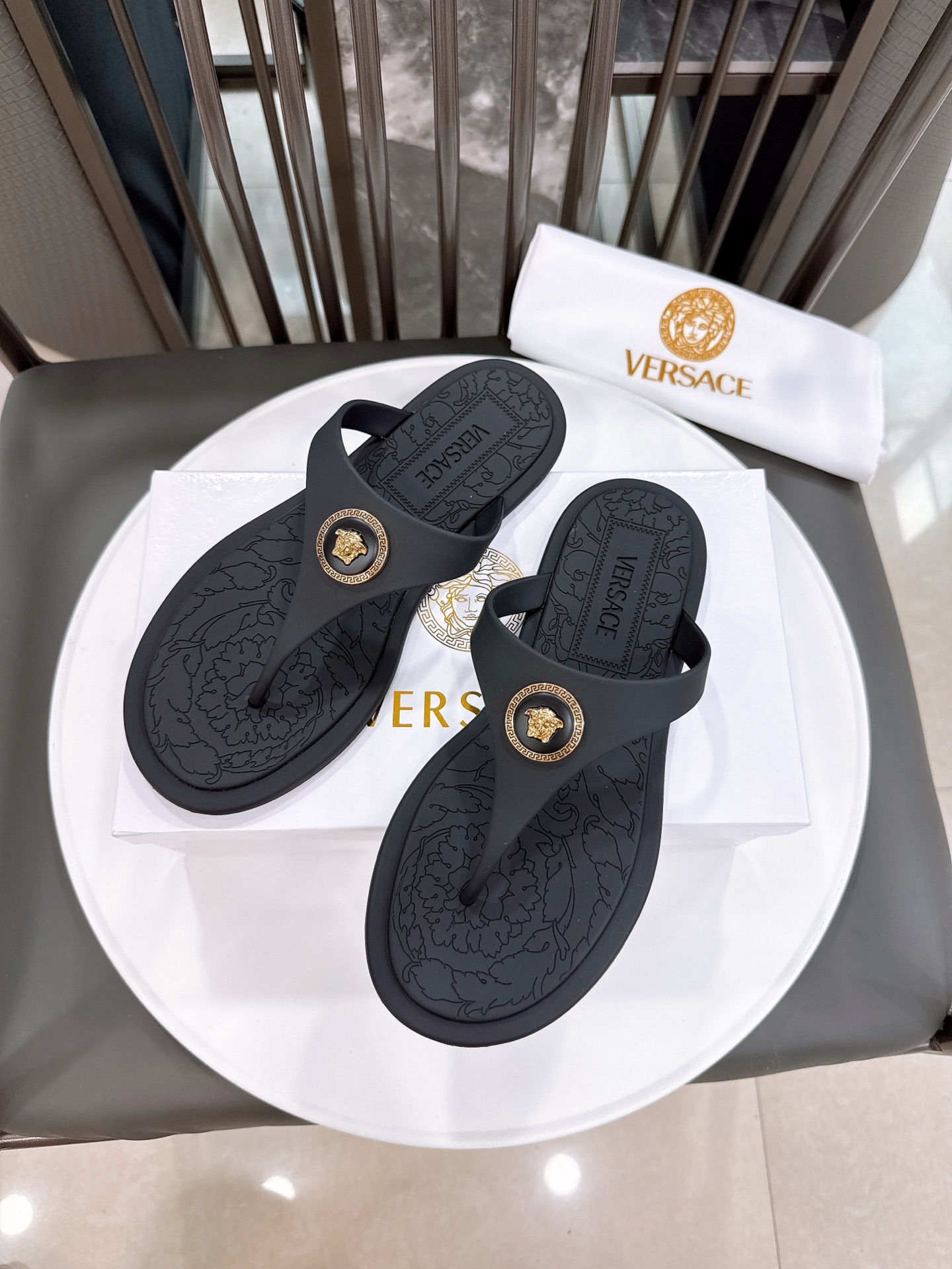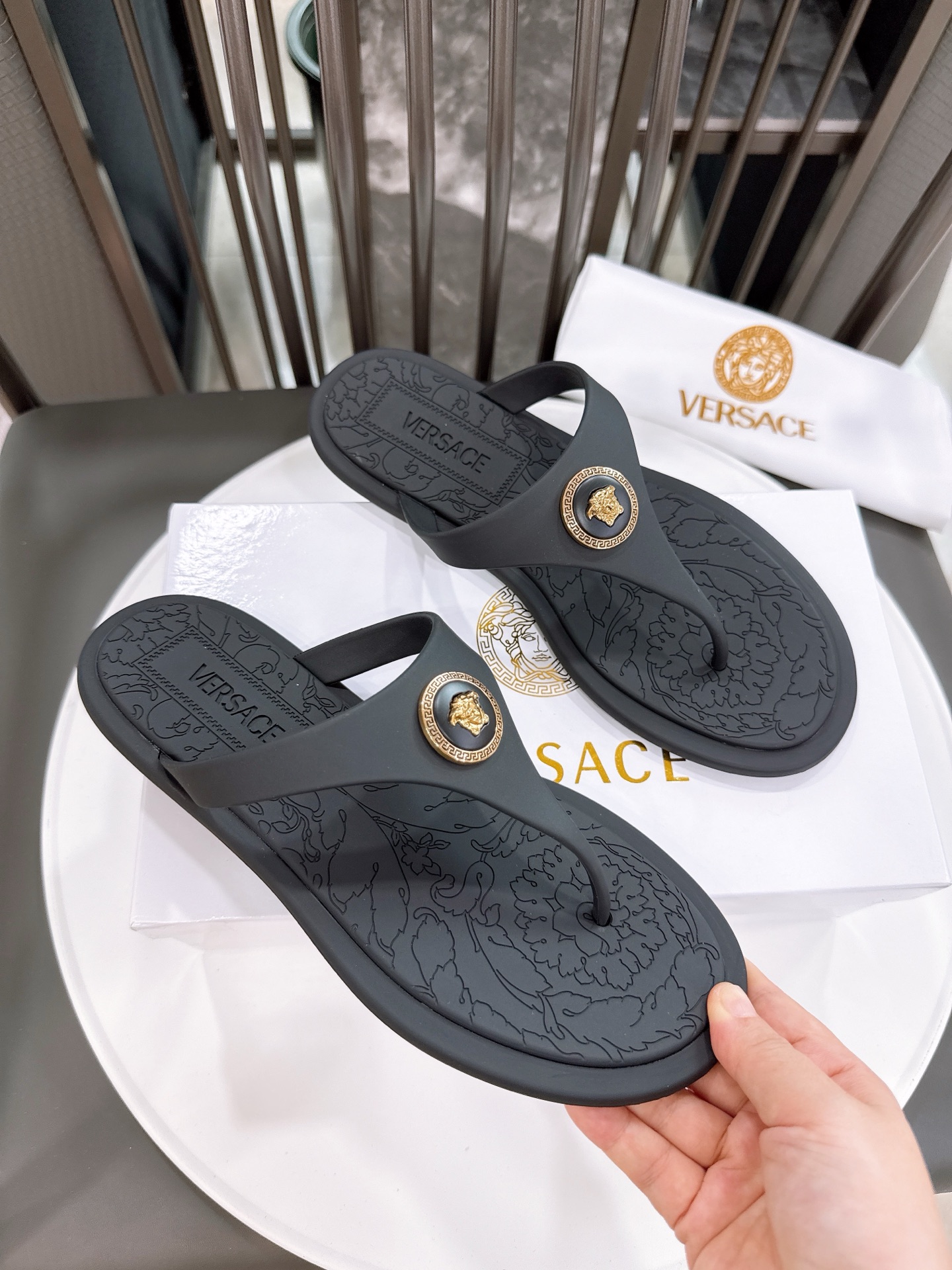 这款鞋子是AAAAA 1:1 质量 (非常棒). 使用了和原版一模一样的材料. 商标部分也保持了和范思哲/Versace一样. 图片拍摄是实物鞋子拍摄, 您所收到的实物保证和我们图片一模一样.
