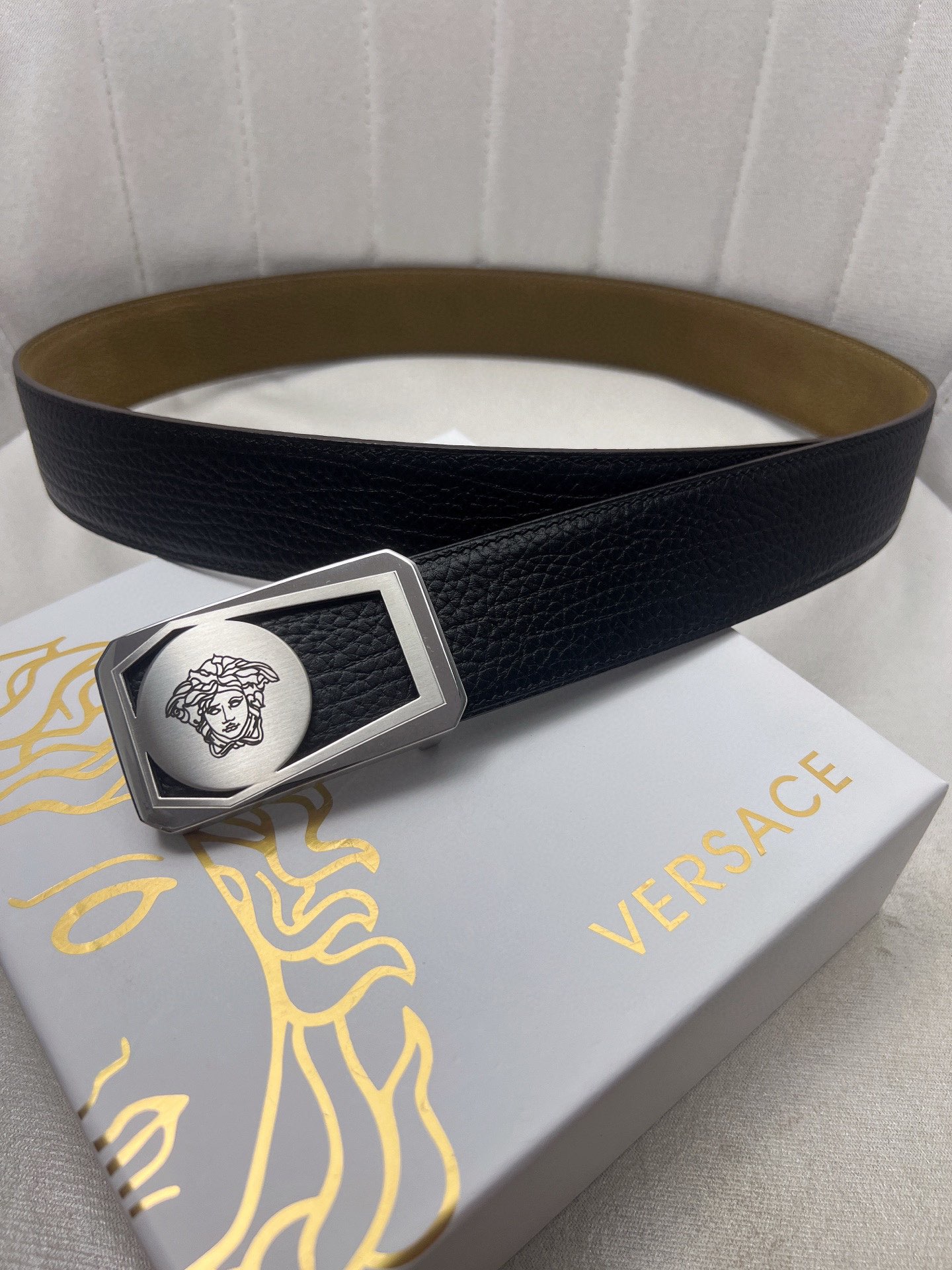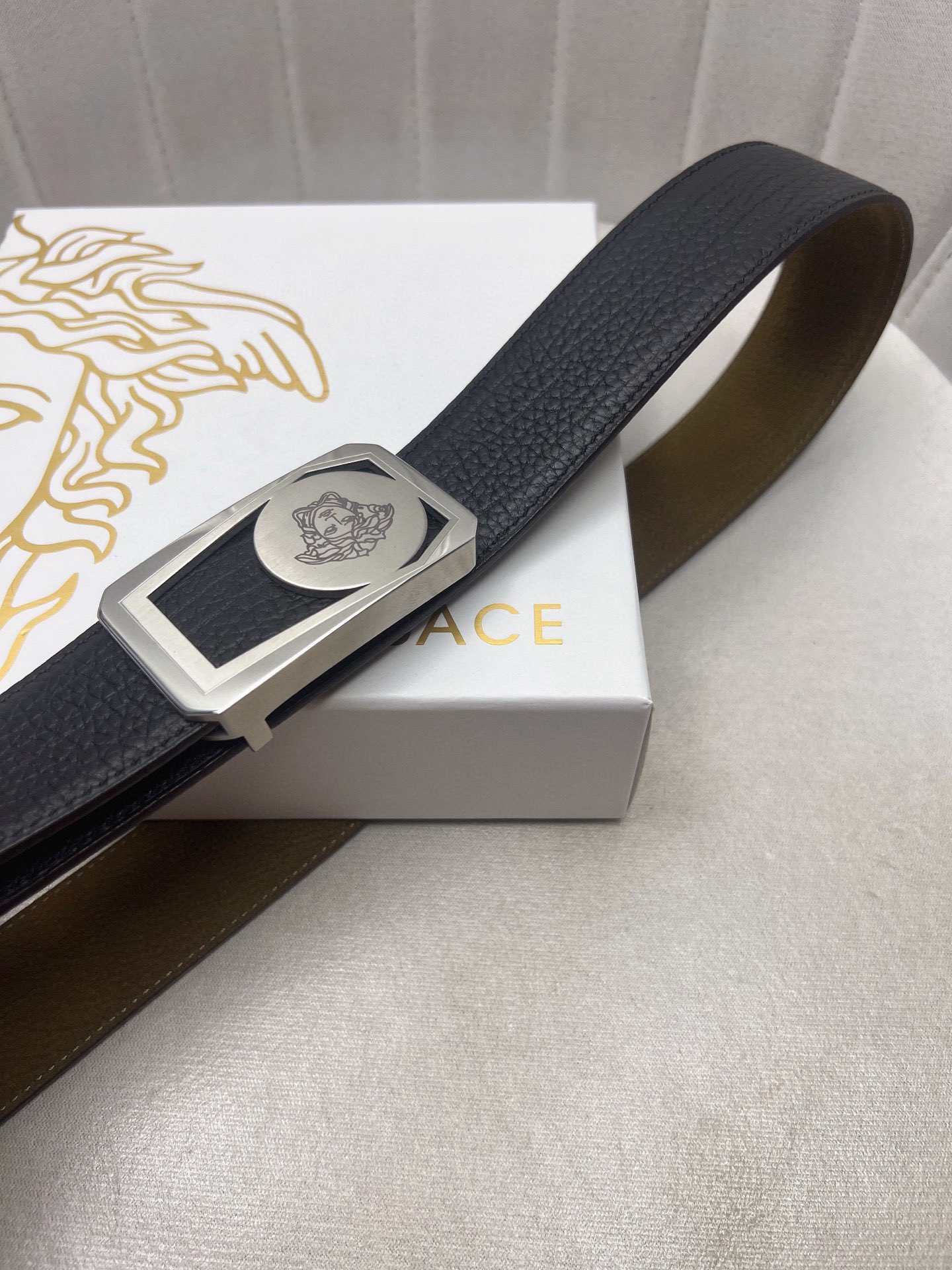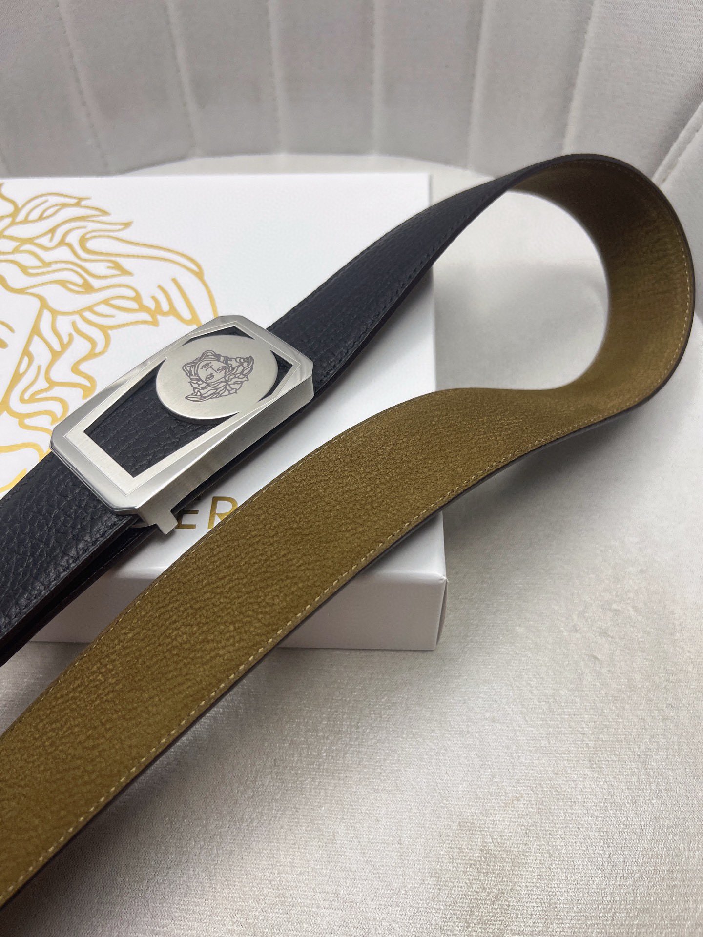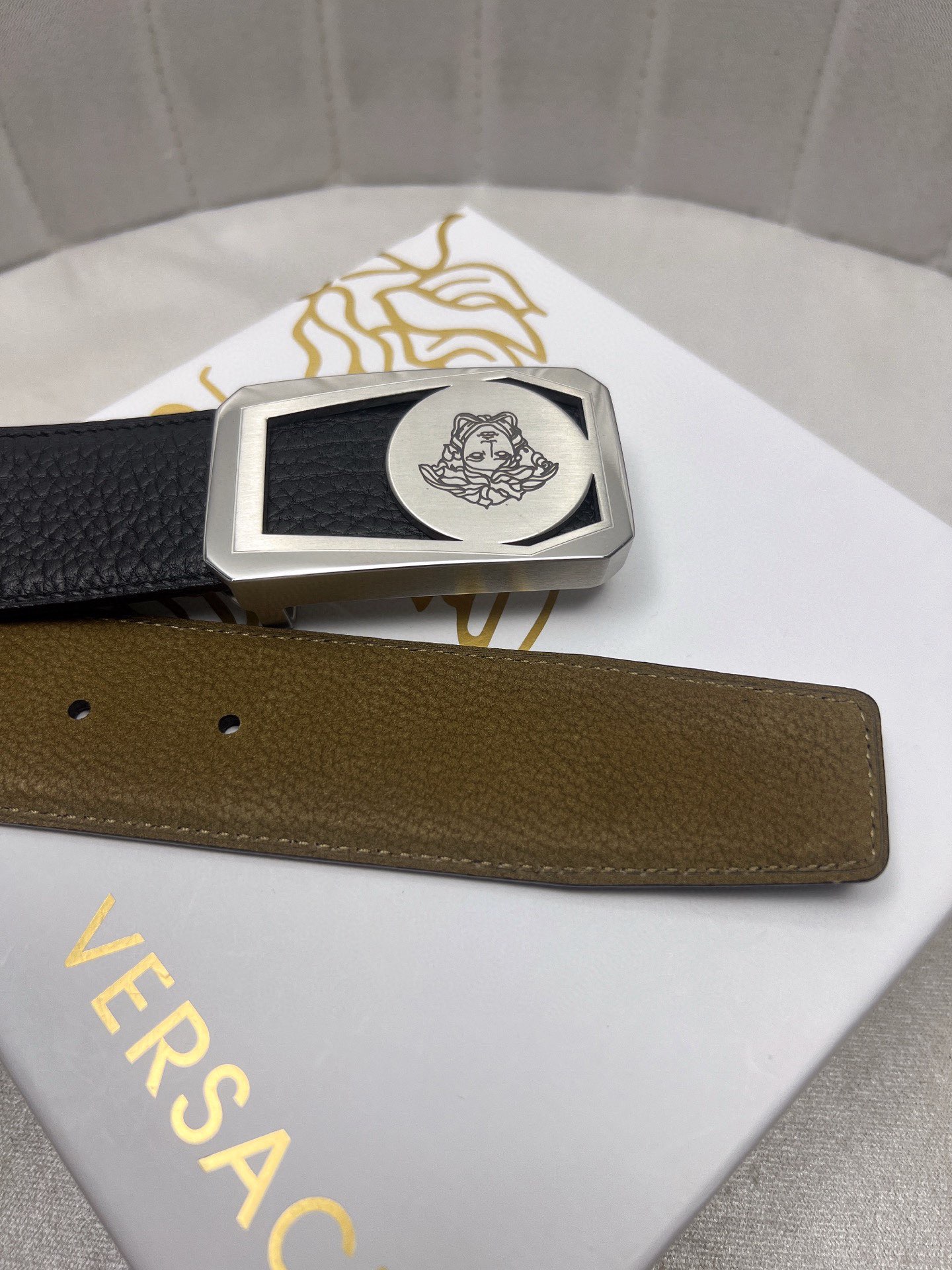 这款皮带是AAAAA 1:1 质量 (非常棒). 使用了和原版一模一样的材料. 商标部分也保持了和范思哲/Versace一样. 图片拍摄是实物皮带拍摄, 您所收到的实物保证和我们图片一模一样.