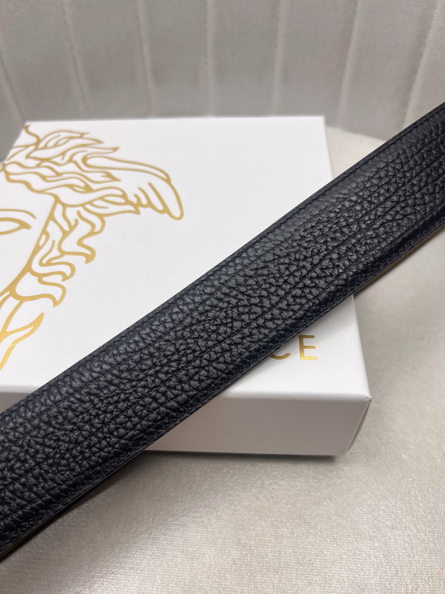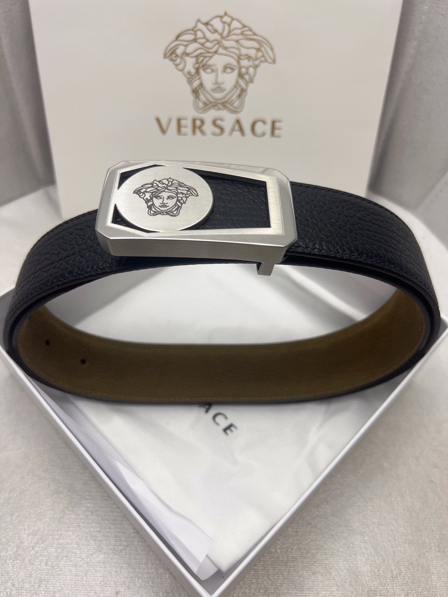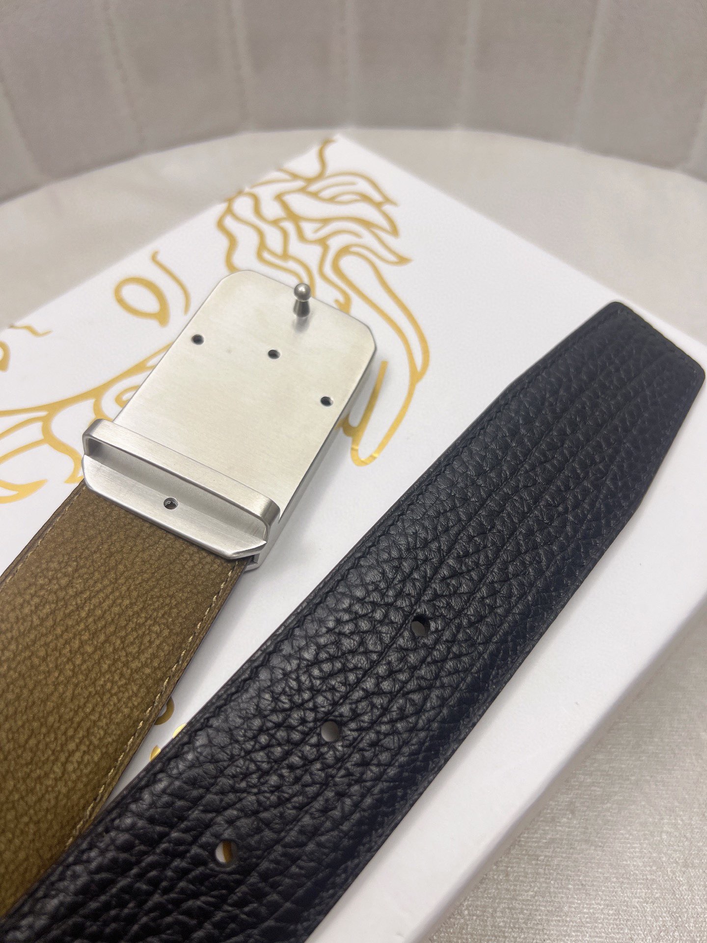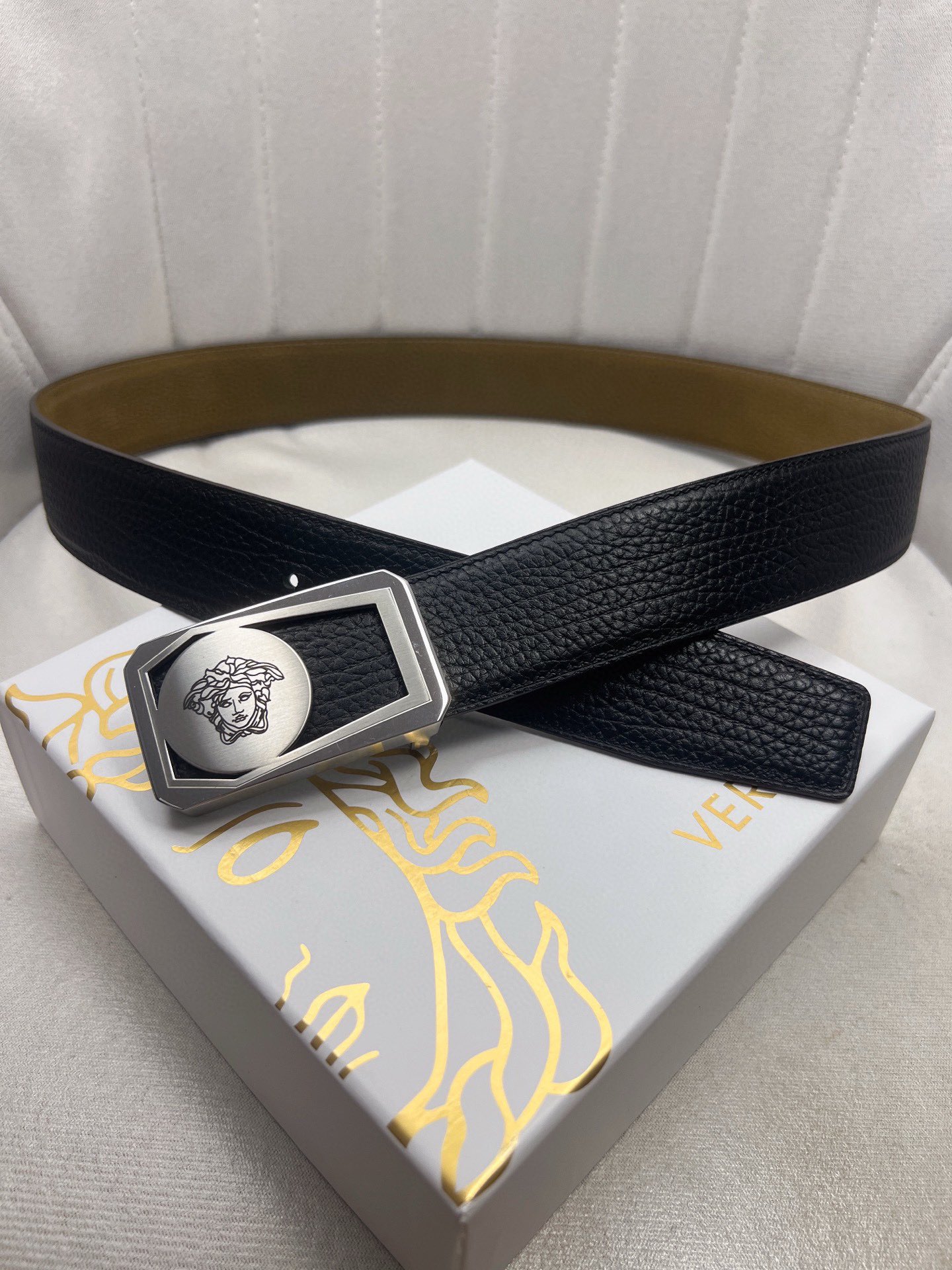 这款皮带是AAAAA 1:1 质量 (非常棒). 使用了和原版一模一样的材料. 商标部分也保持了和范思哲/Versace一样. 图片拍摄是实物皮带拍摄, 您所收到的实物保证和我们图片一模一样.