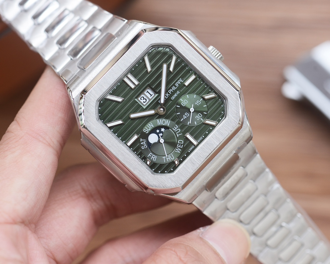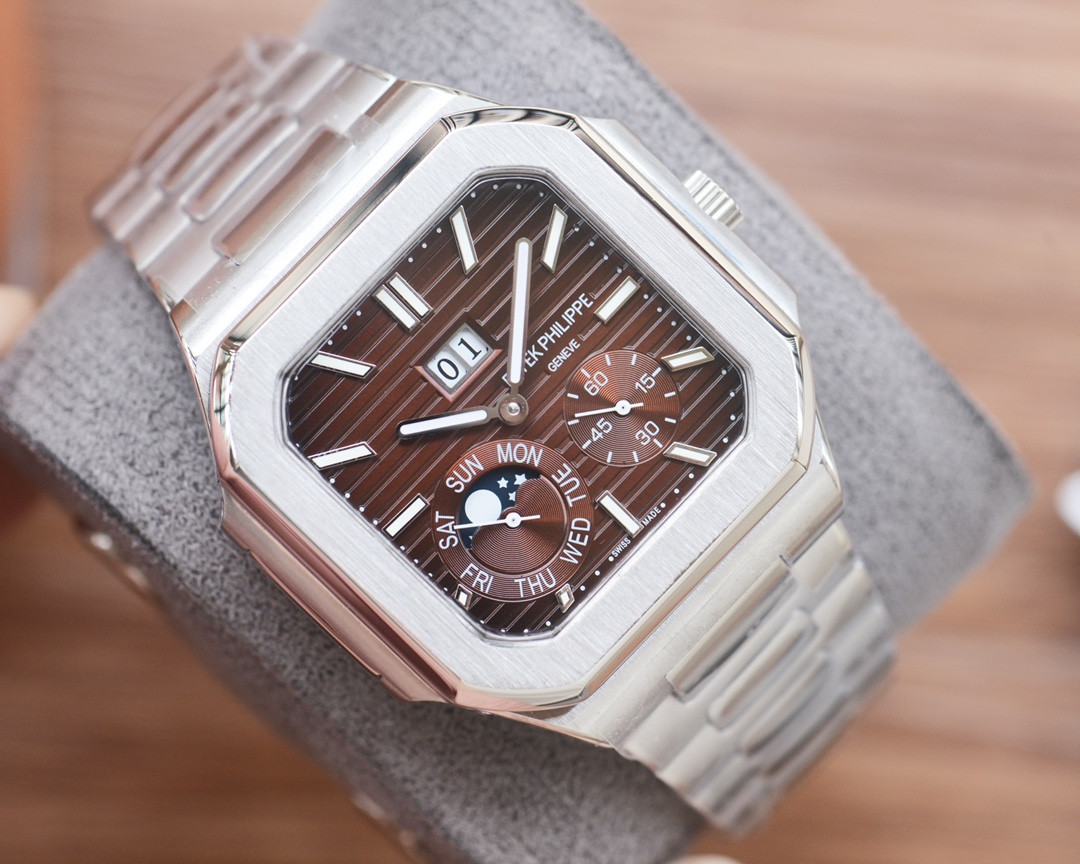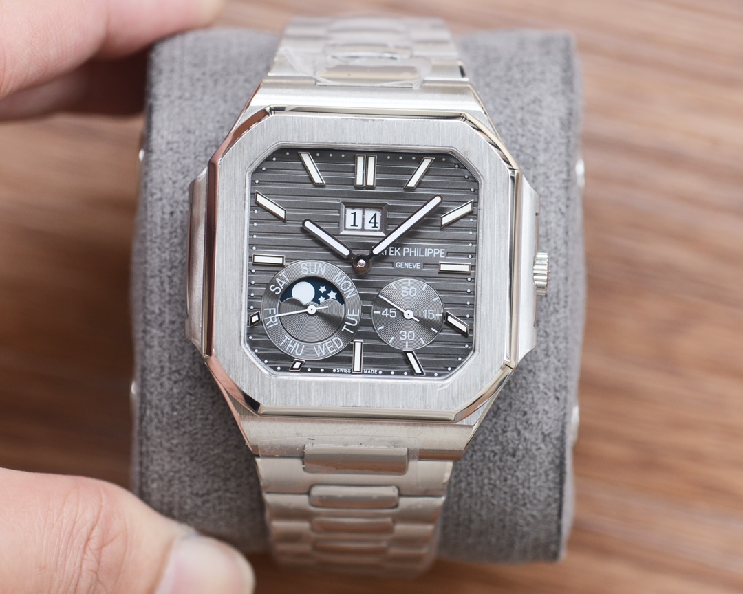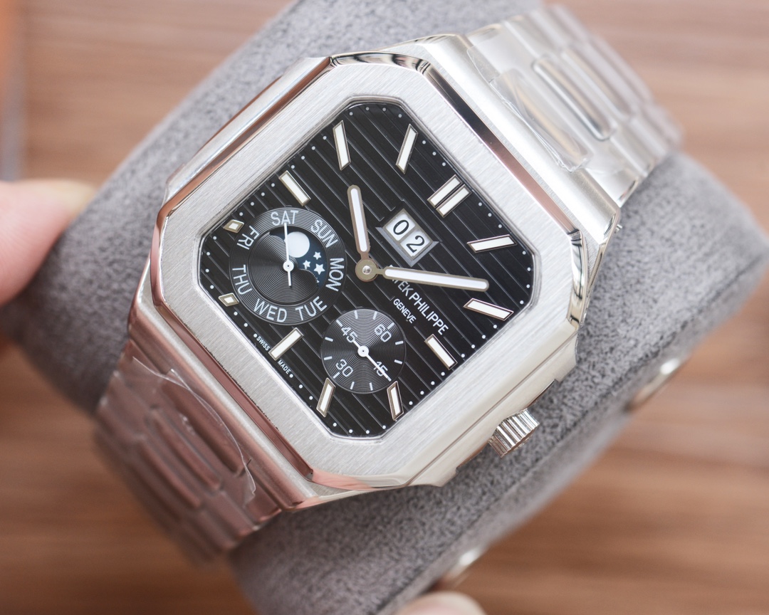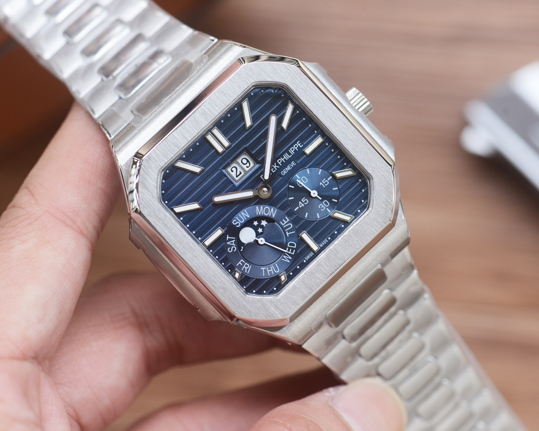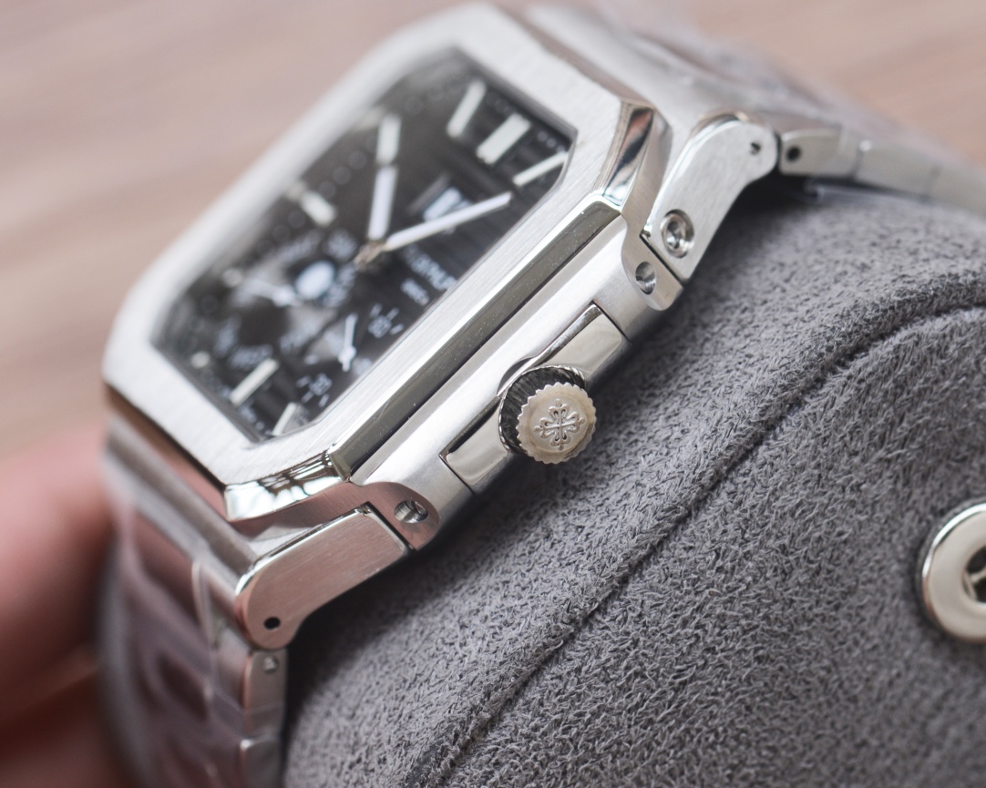 这款手表是AAAAA 1:1 质量 (非常棒). 使用了和原版一模一样的材料. 商标部分也保持了和百达翡丽/Patek Philippe一样. 图片拍摄是实物手表拍摄, 您所收到的实物保证和我们图片一模一样.
