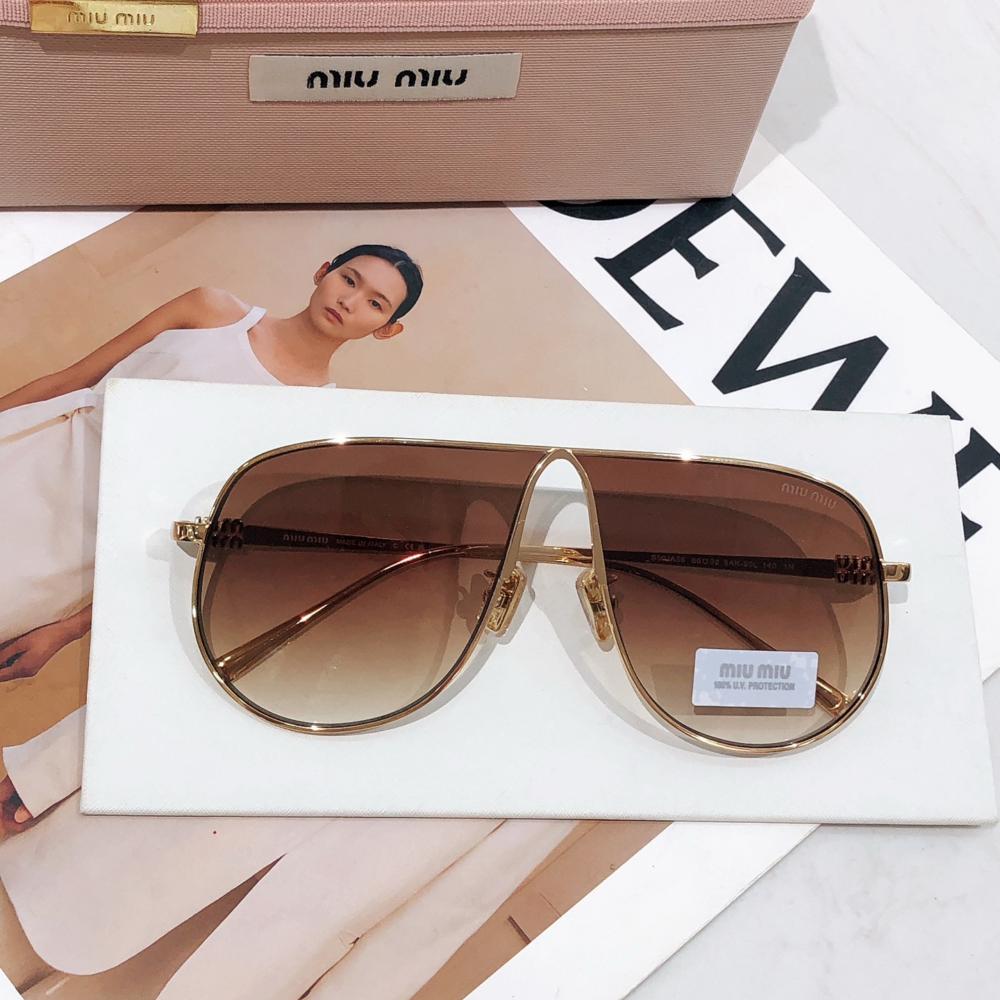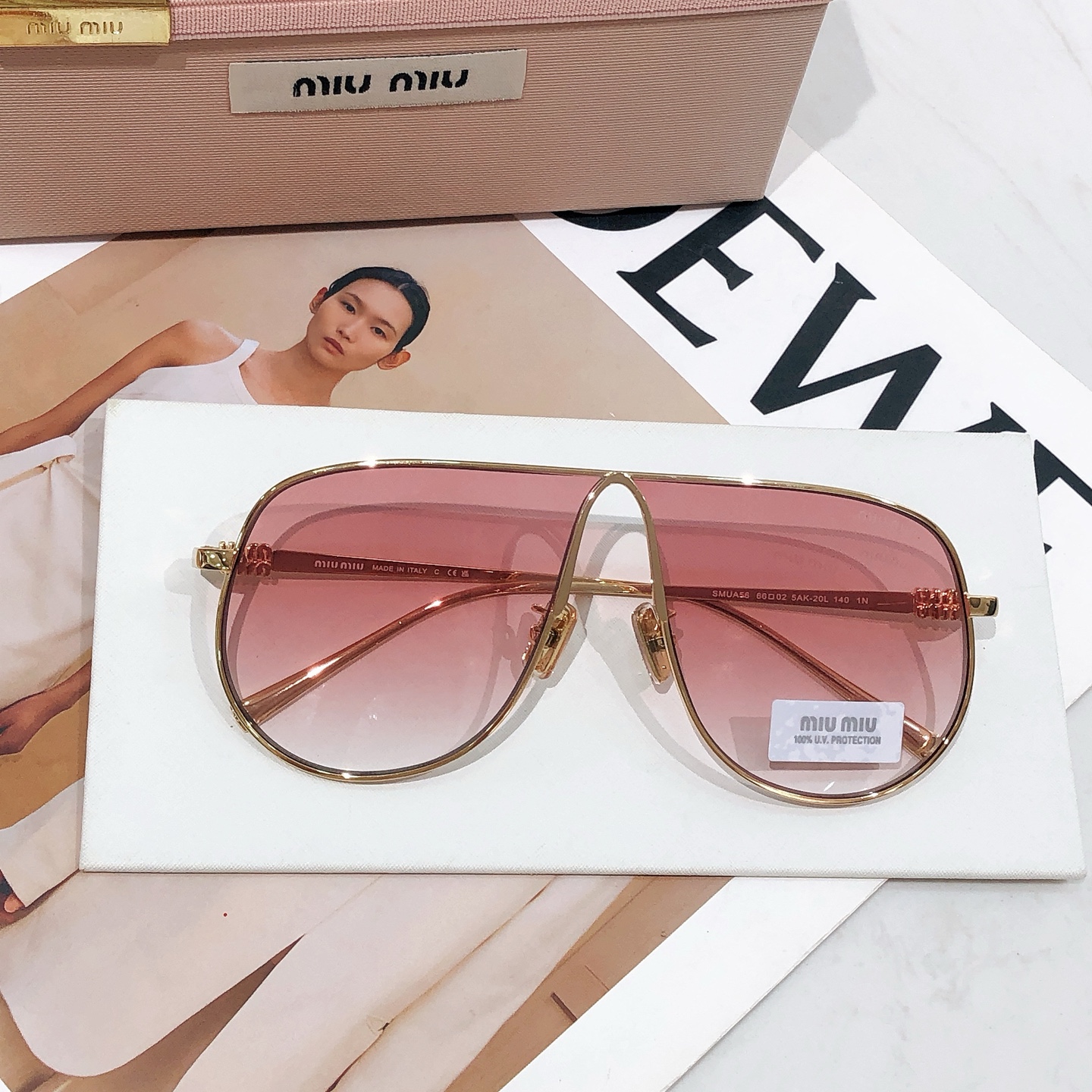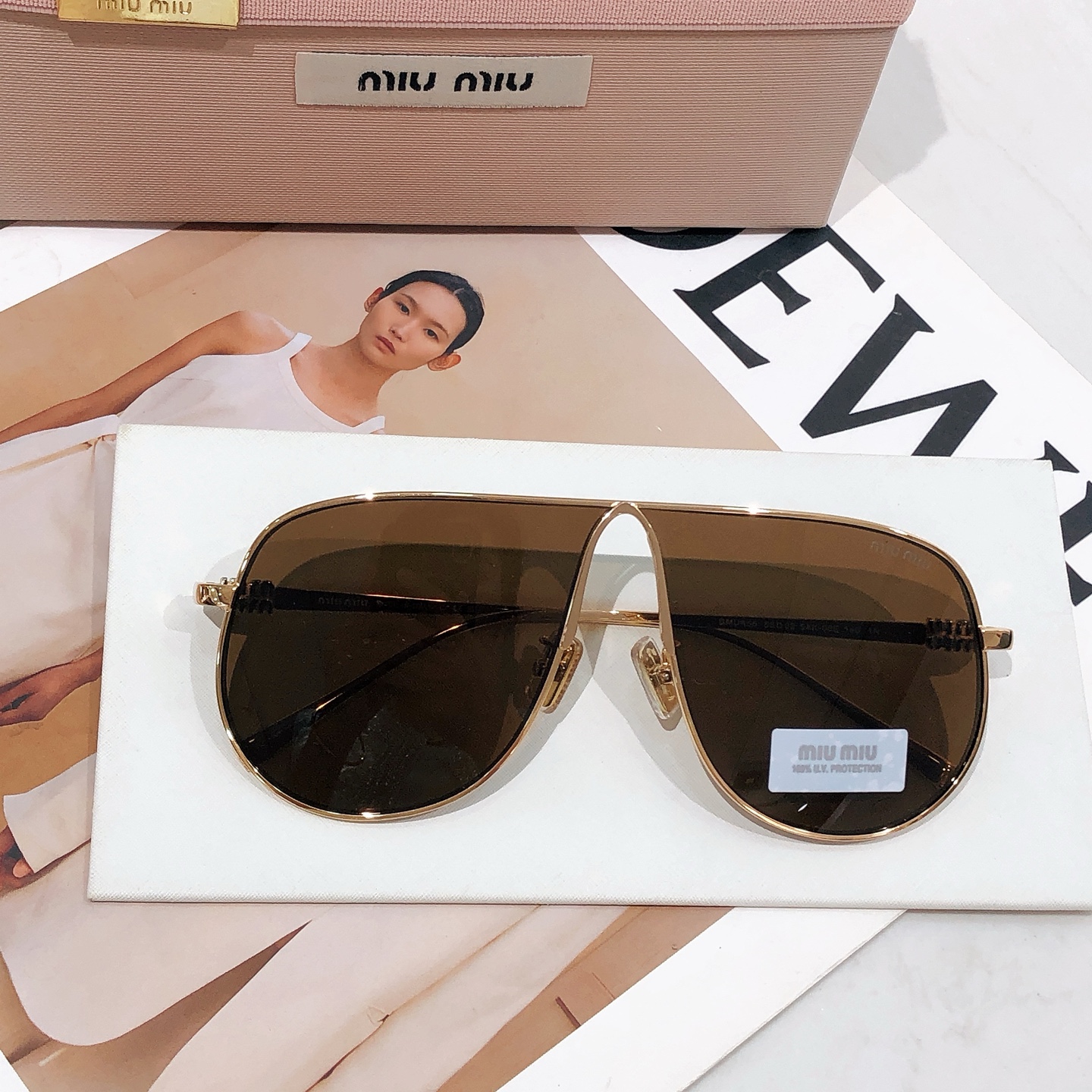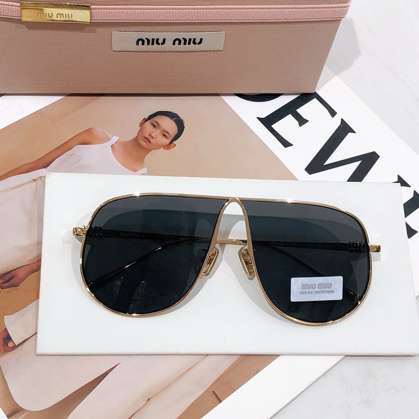 这款太阳眼镜是AAAAA 1:1 质量 (非常棒). 使用了和原版一模一样的材料. 商标部分也保持了和缪缪/Miu Miu一样. 图片拍摄是实物太阳眼镜拍摄, 您所收到的实物保证和我们图片一模一样.