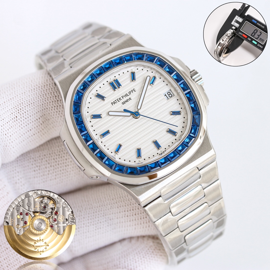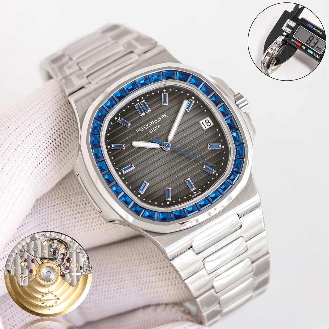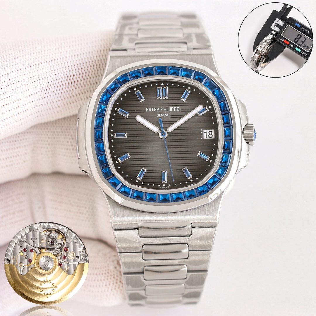 这款手表是AAAAA 1:1 质量 (非常棒). 使用了和原版一模一样的材料. 商标部分也保持了和百达翡丽/Patek Philippe一样. 图片拍摄是实物手表拍摄, 您所收到的实物保证和我们图片一模一样.