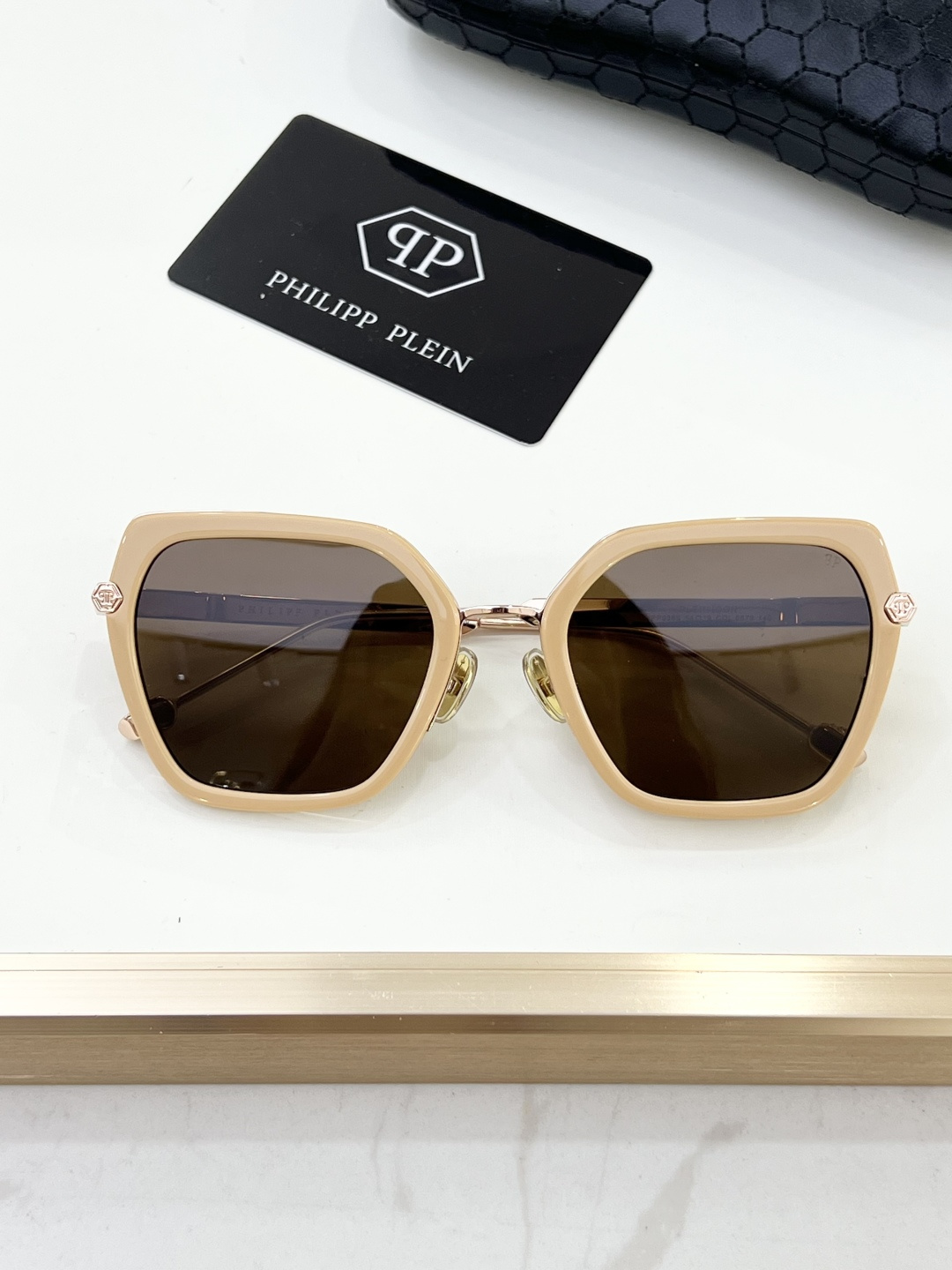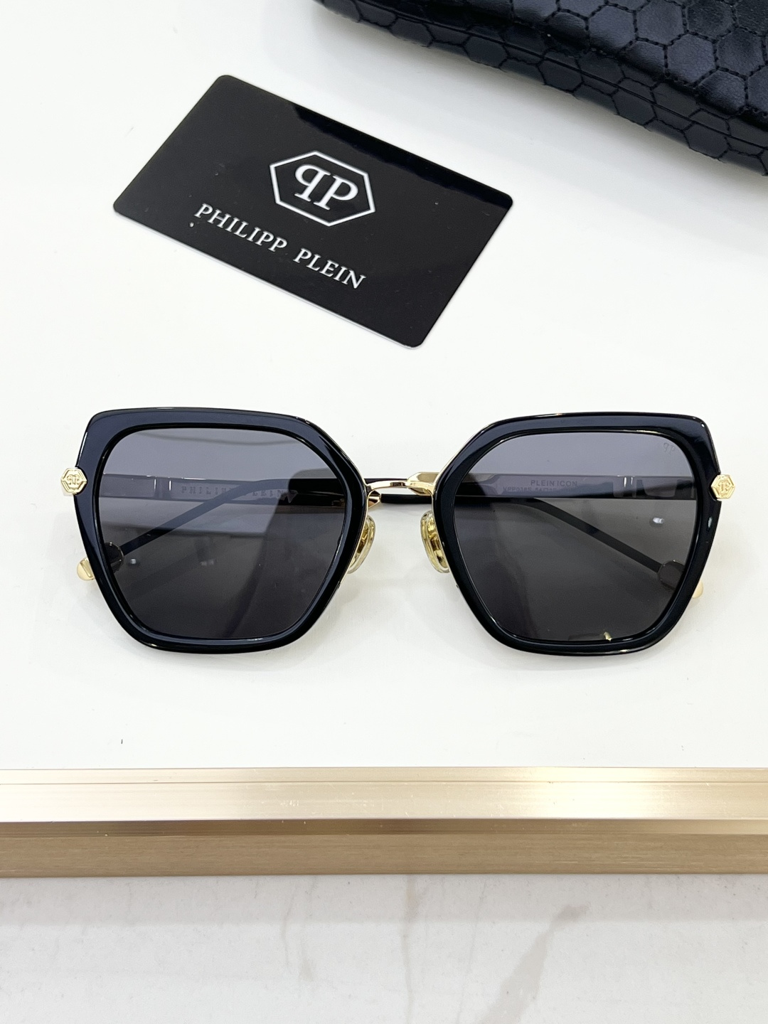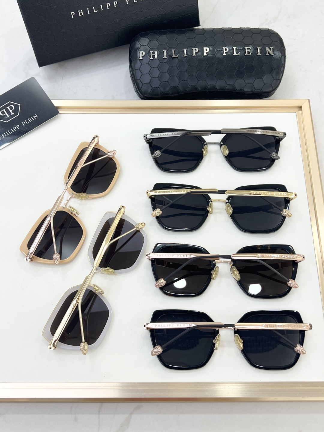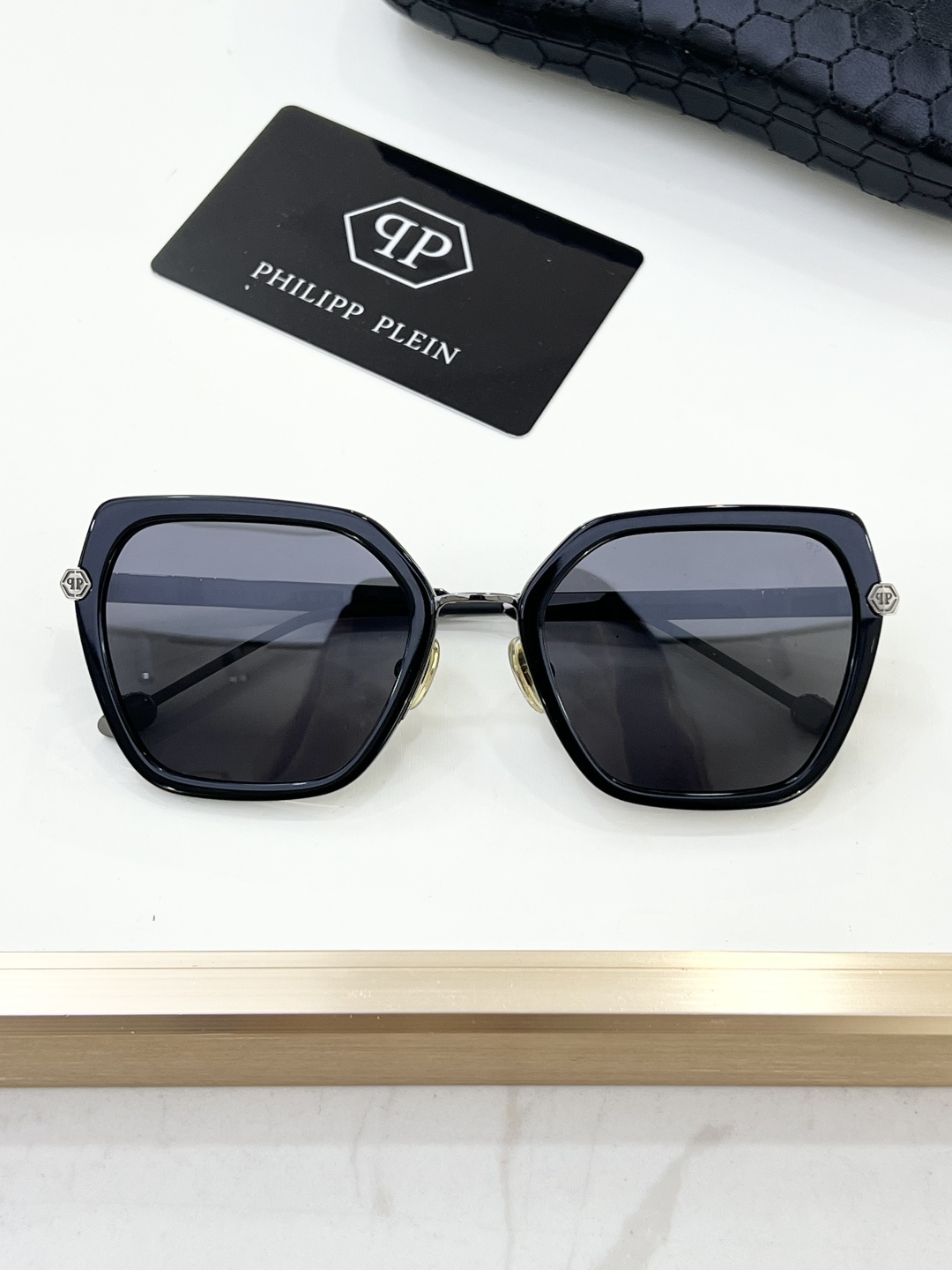 这款太阳眼镜是AAAAA 1:1 质量 (非常棒). 使用了和原版一模一样的材料. 商标部分也保持了和菲利普·普林/Philipp Plein一样. 图片拍摄是实物太阳眼镜拍摄, 您所收到的实物保证和我们图片一模一样.
