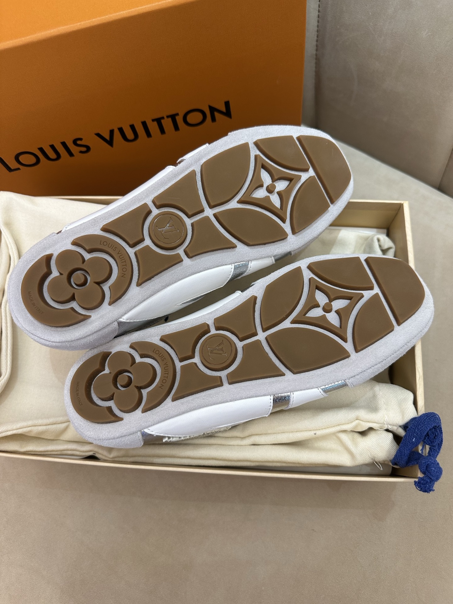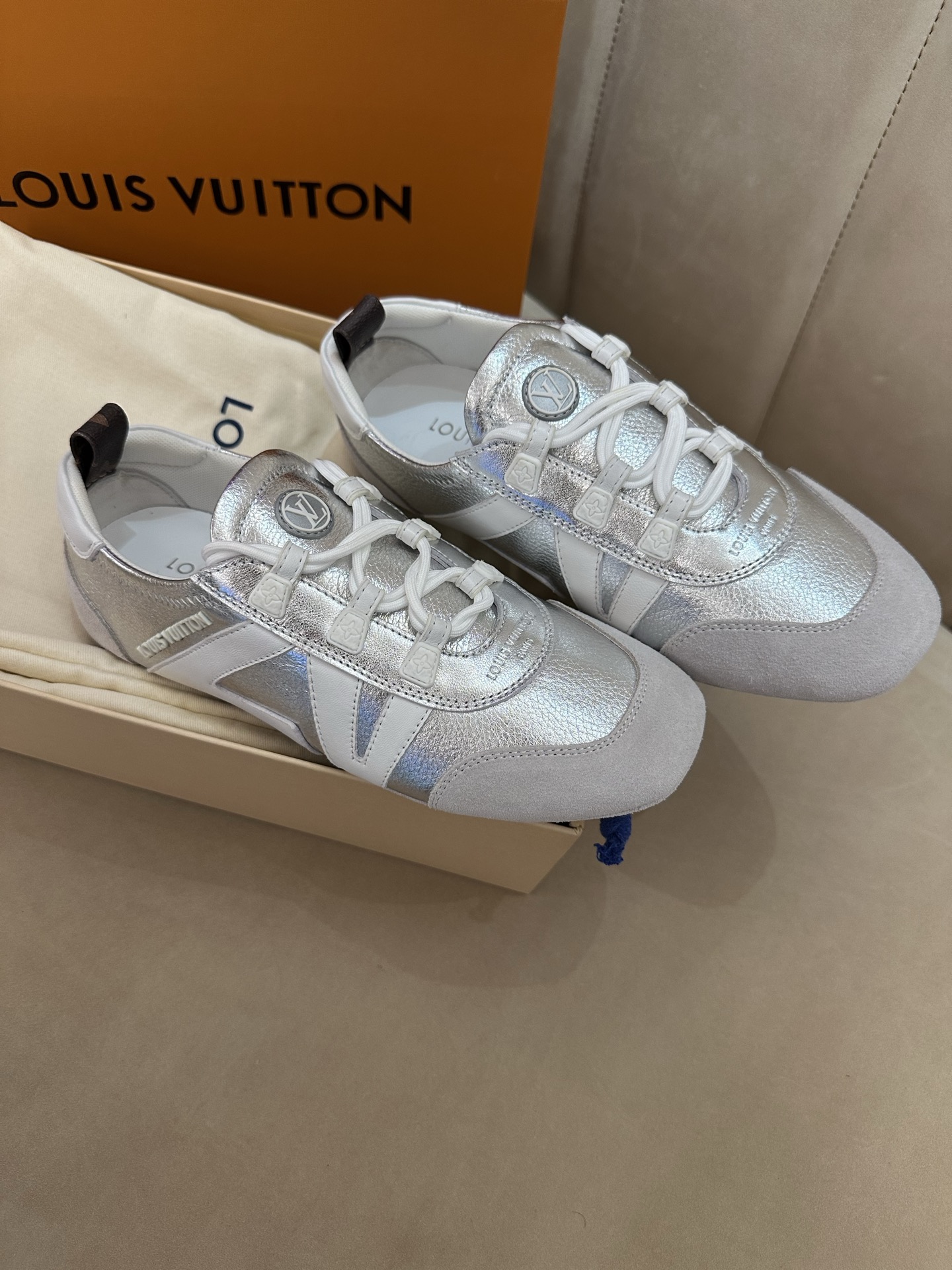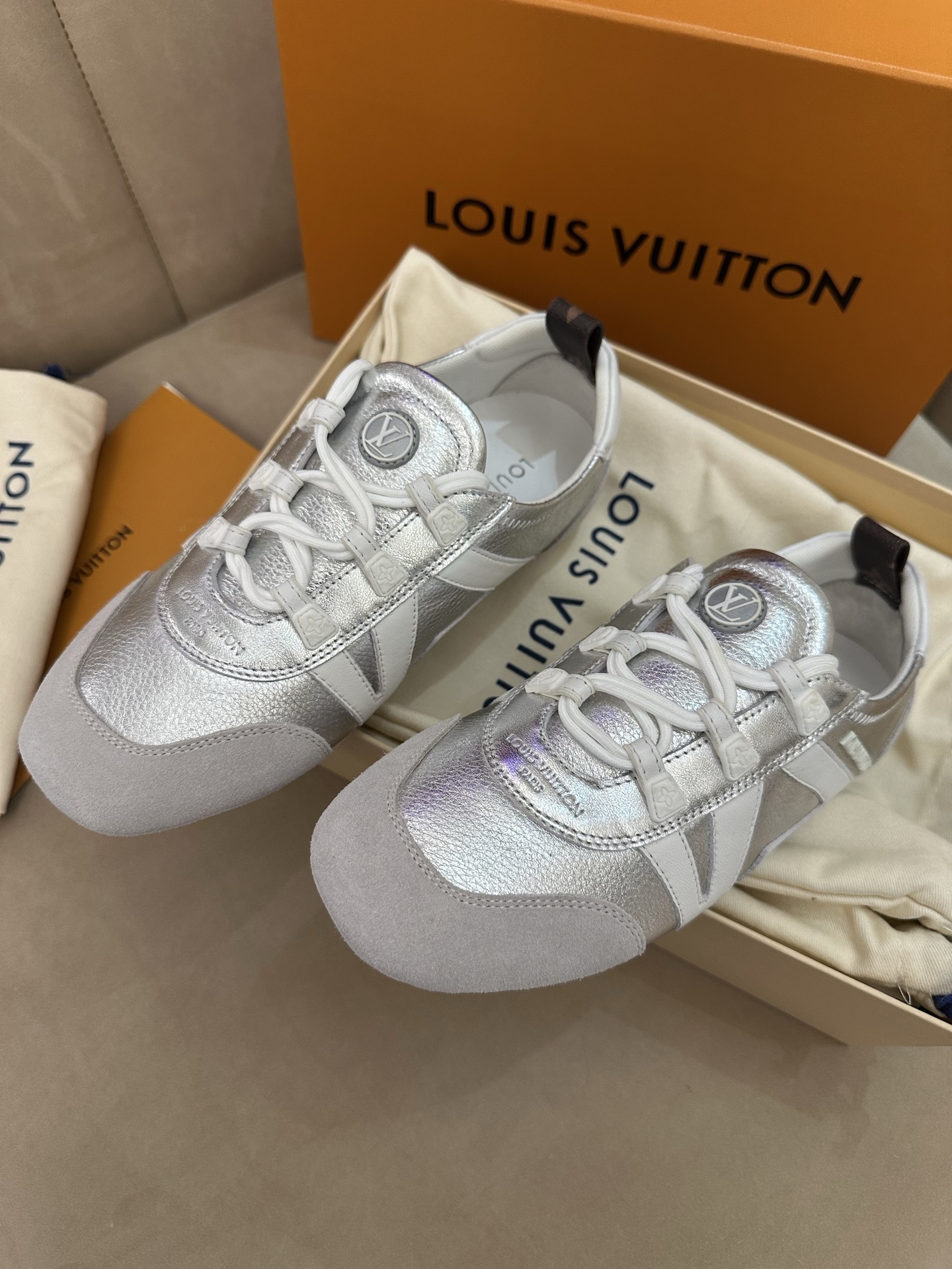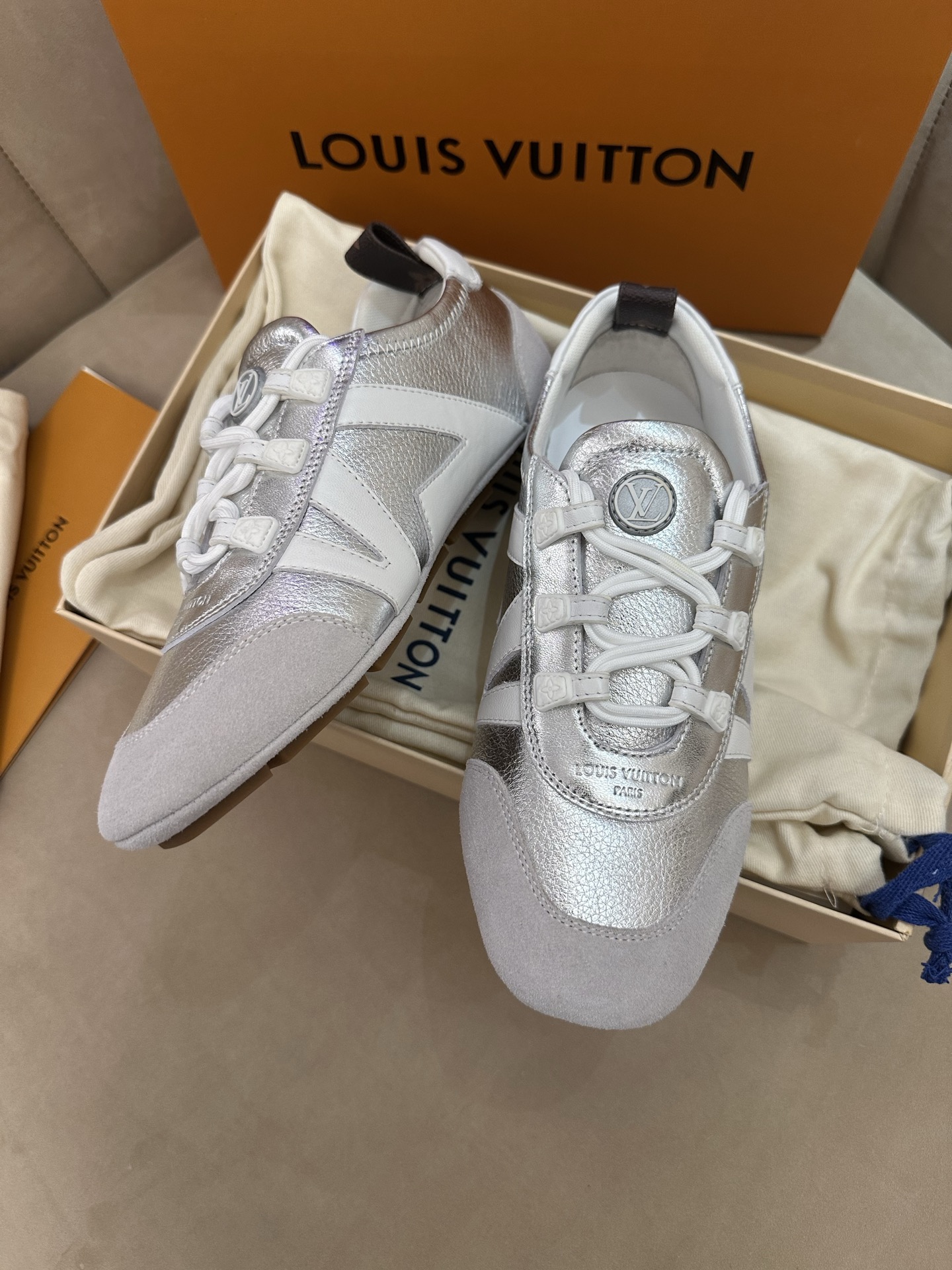 这款鞋子是AAAAA 1:1 质量 (非常棒). 使用了和原版一模一样的材料. 商标部分也保持了和路易威登/Louis Vuitton一样. 图片拍摄是实物鞋子拍摄, 您所收到的实物保证和我们图片一模一样.