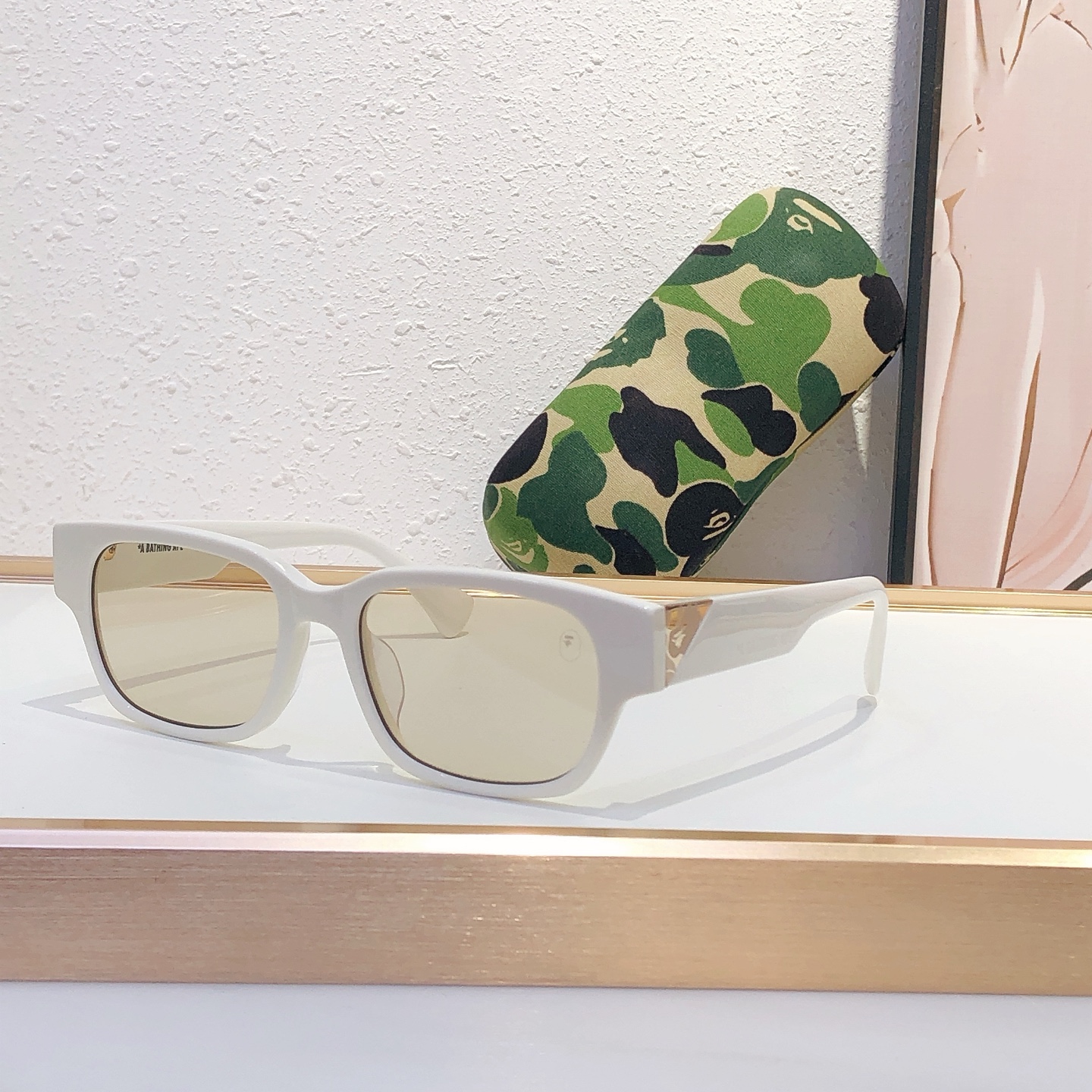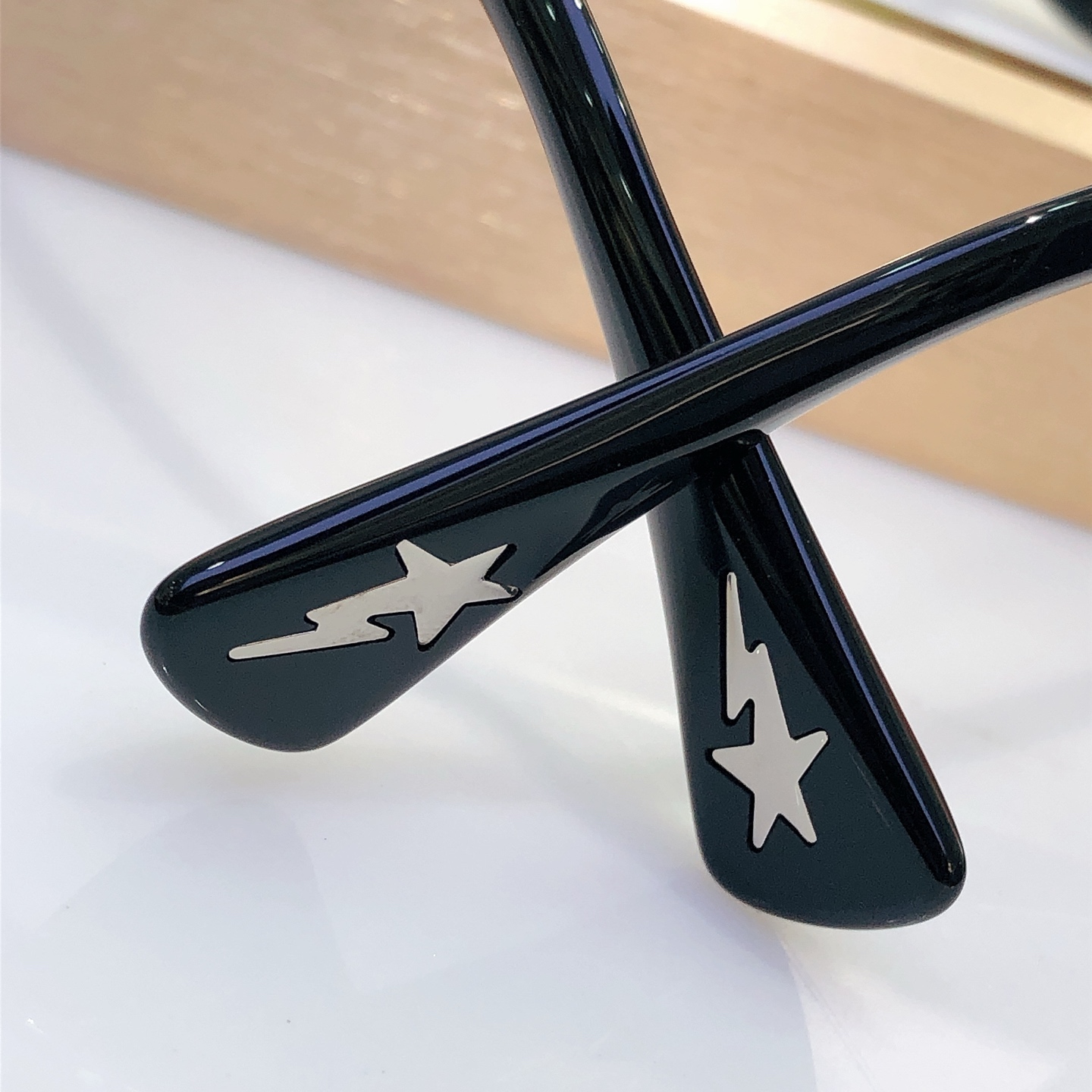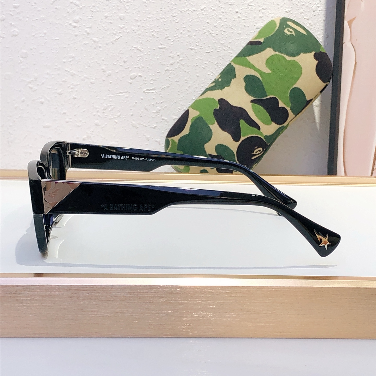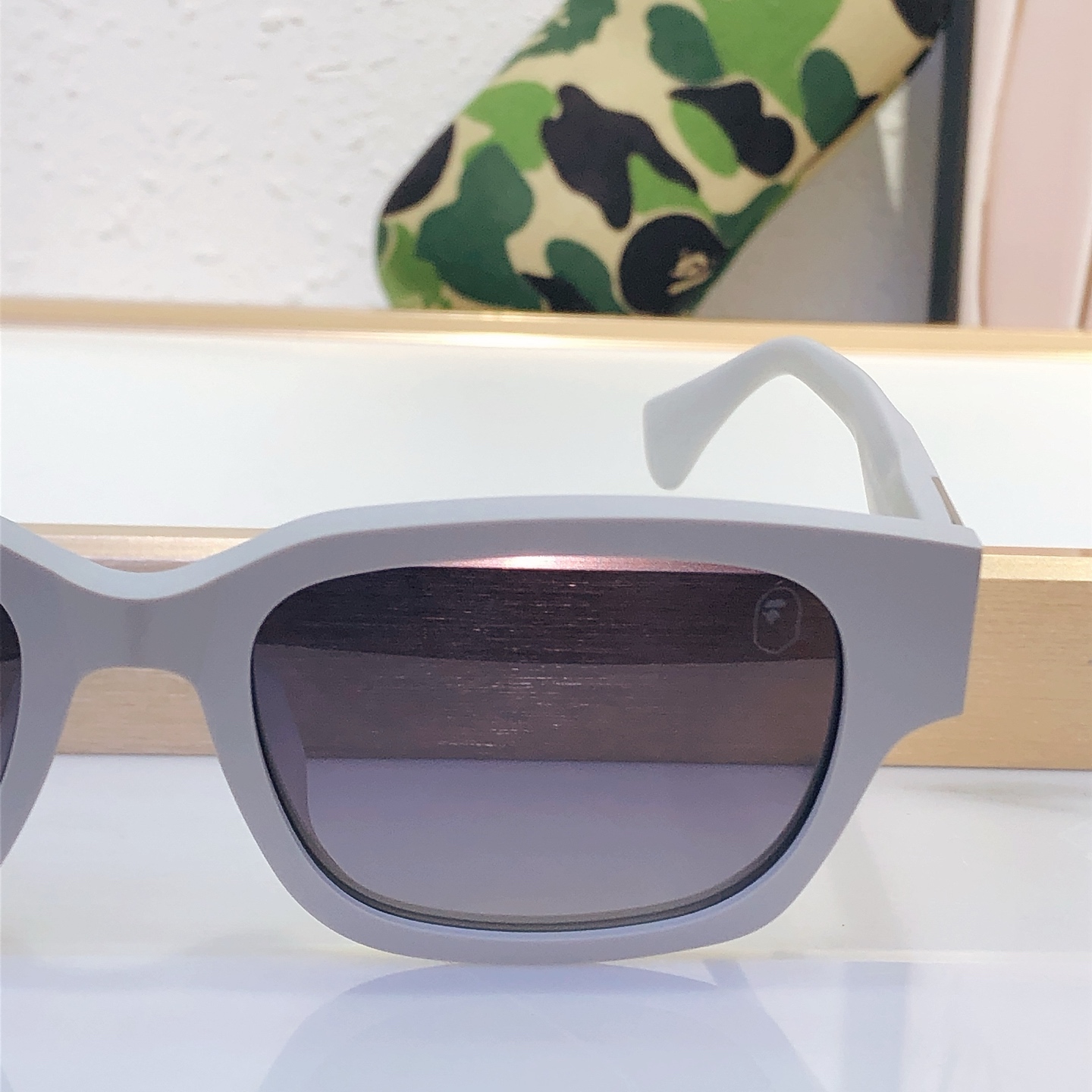 这款太阳眼镜是AAAAA 1:1 质量 (非常棒). 使用了和原版一模一样的材料. 商标部分也保持了和Bape一样. 图片拍摄是实物太阳眼镜拍摄, 您所收到的实物保证和我们图片一模一样.