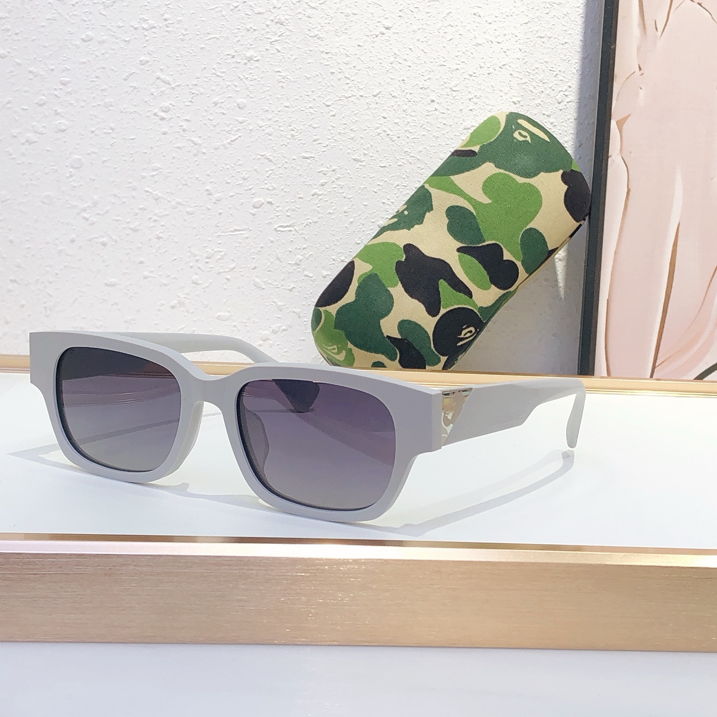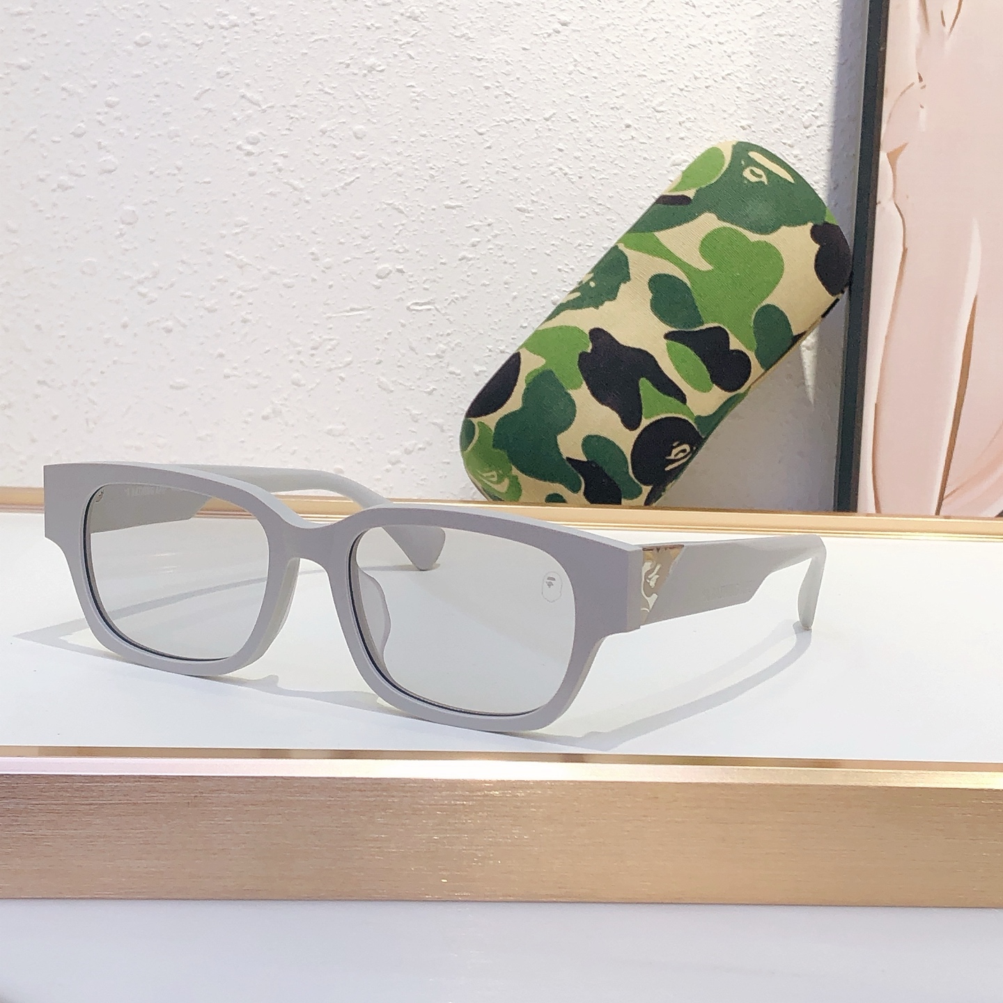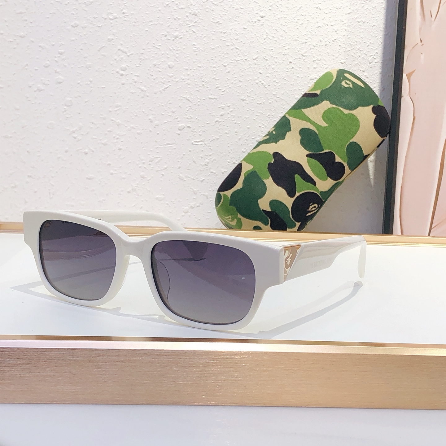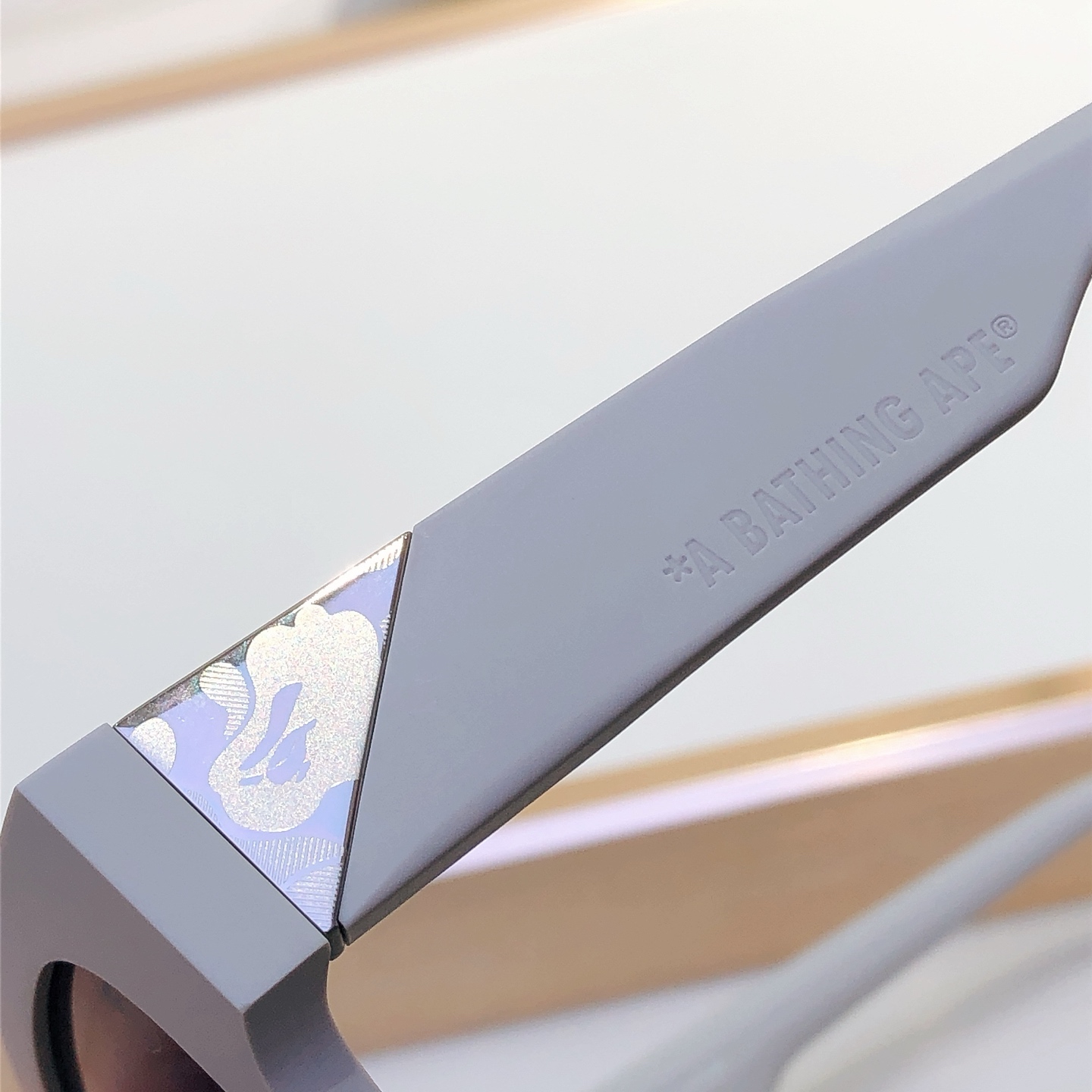 这款太阳眼镜是AAAAA 1:1 质量 (非常棒). 使用了和原版一模一样的材料. 商标部分也保持了和Bape一样. 图片拍摄是实物太阳眼镜拍摄, 您所收到的实物保证和我们图片一模一样.