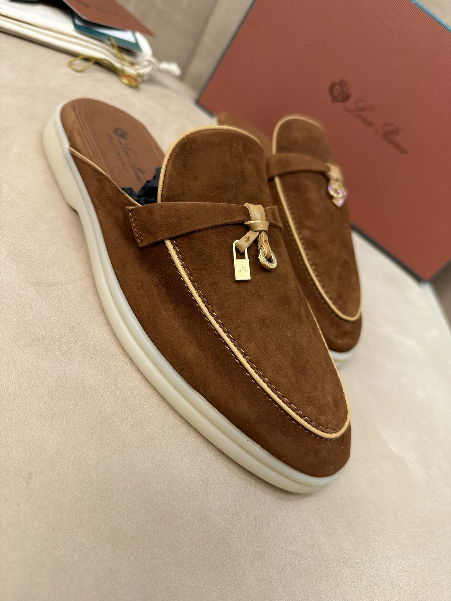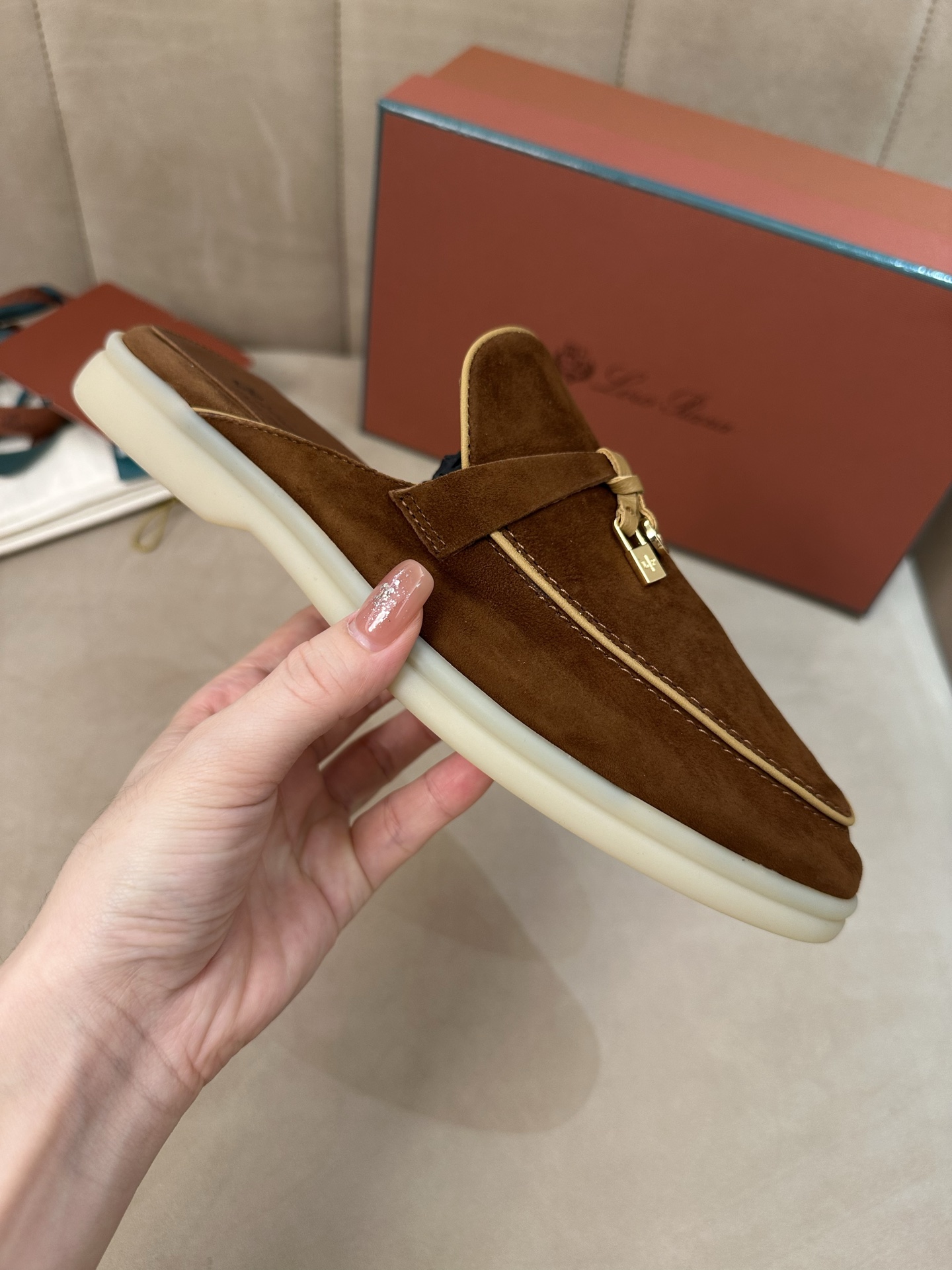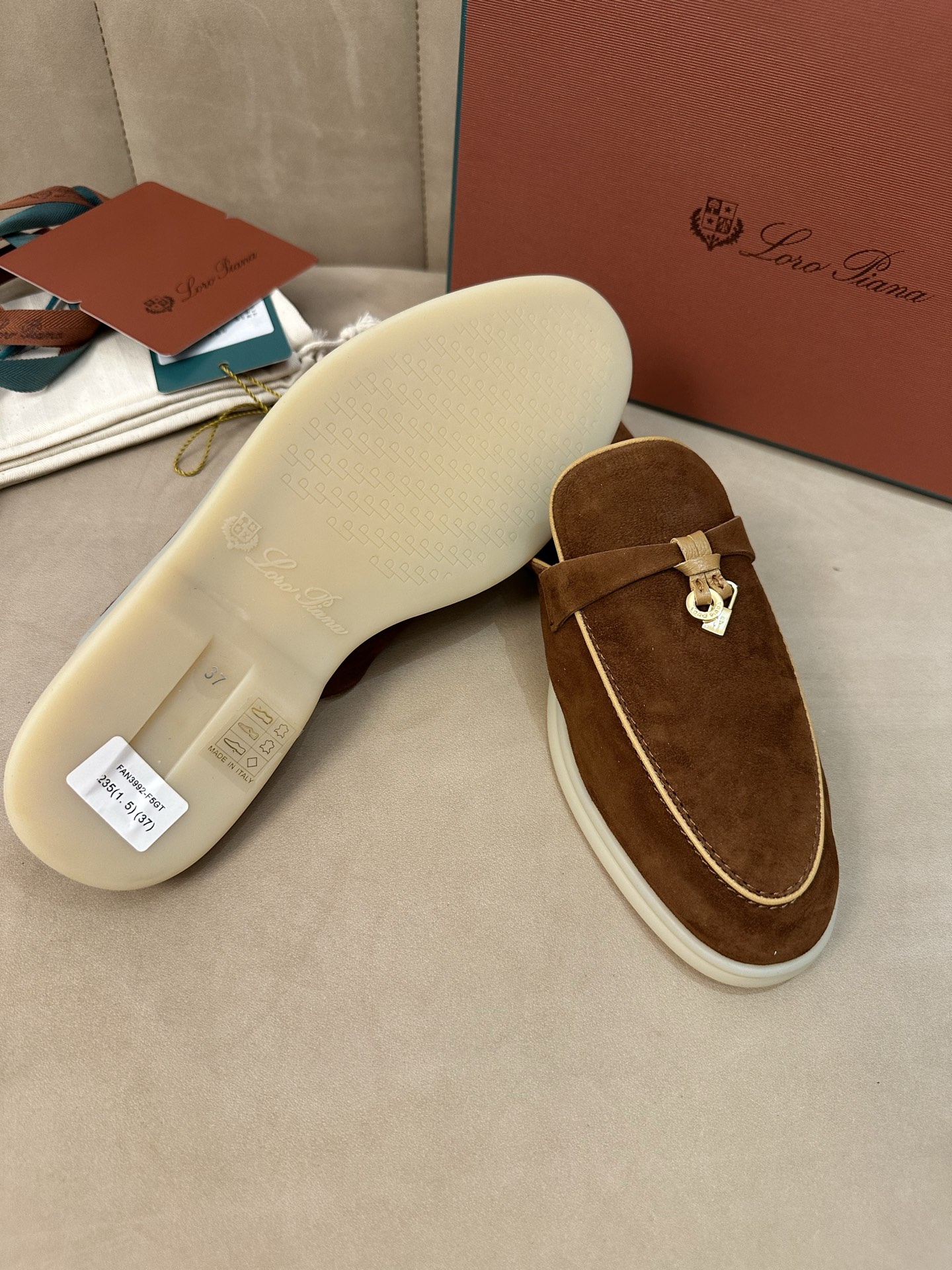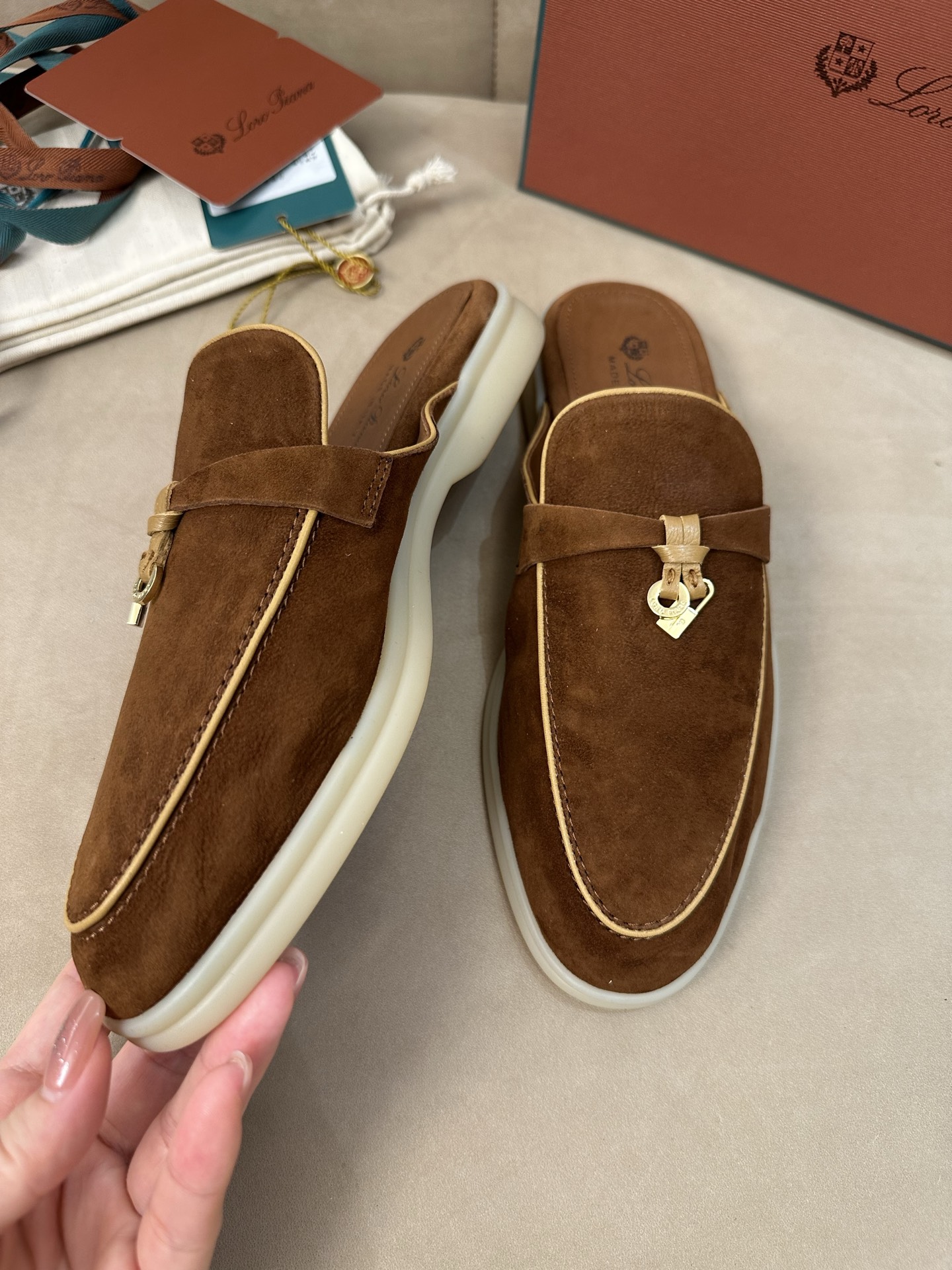 这款鞋子是AAAAA 1:1 质量 (非常棒). 使用了和原版一模一样的材料. 商标部分也保持了和洛罗皮亚纳/Loro Piana一样. 图片拍摄是实物鞋子拍摄, 您所收到的实物保证和我们图片一模一样.
