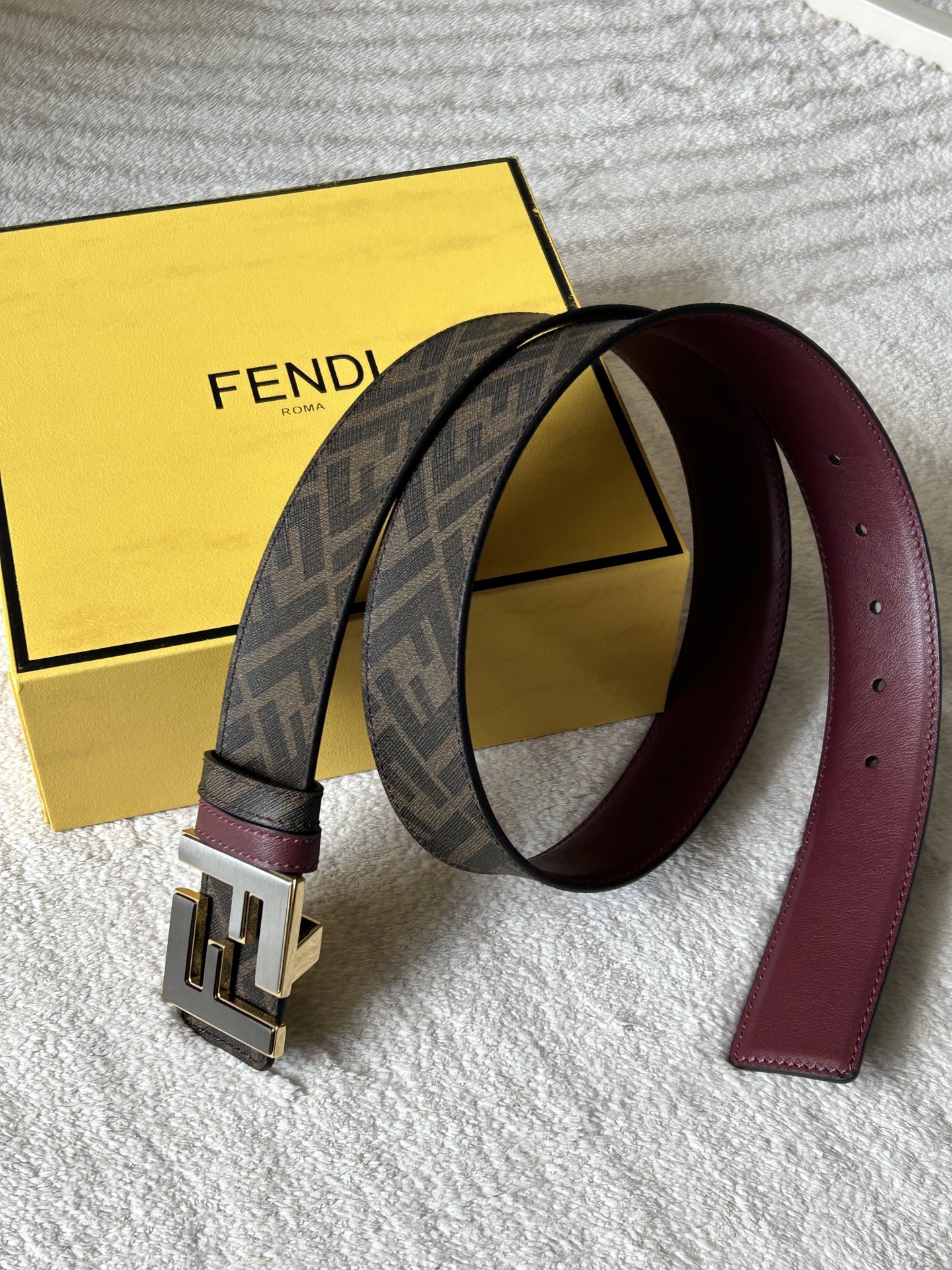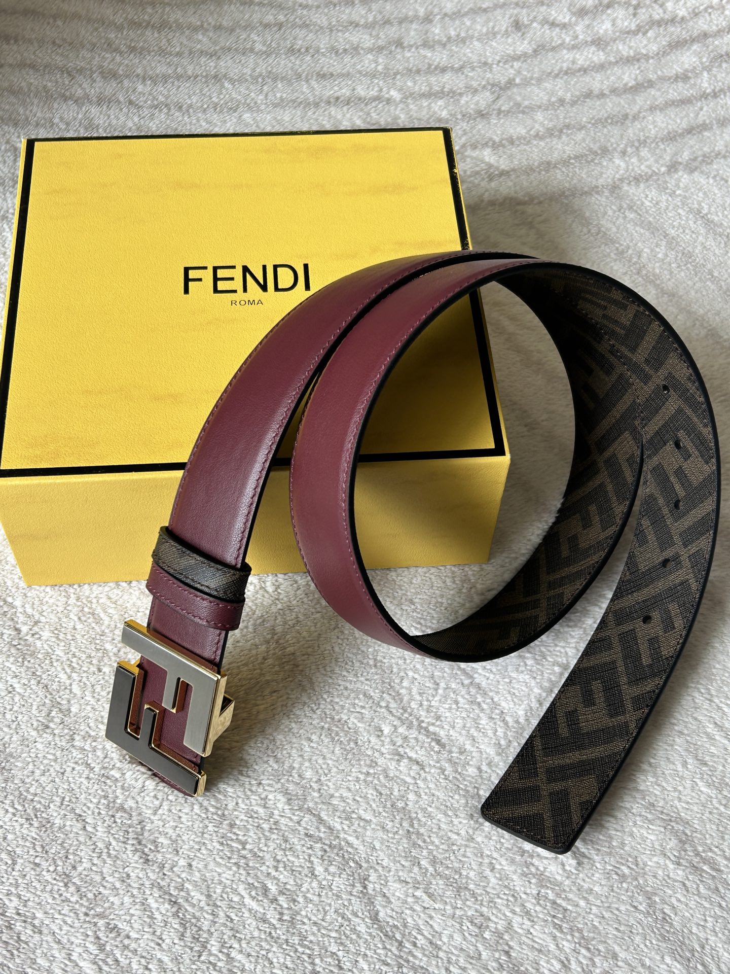 这款皮带是AAAAA 1:1 质量 (非常棒). 使用了和原版一模一样的材料. 商标部分也保持了和芬迪/Fendi一样. 图片拍摄是实物皮带拍摄, 您所收到的实物保证和我们图片一模一样.
