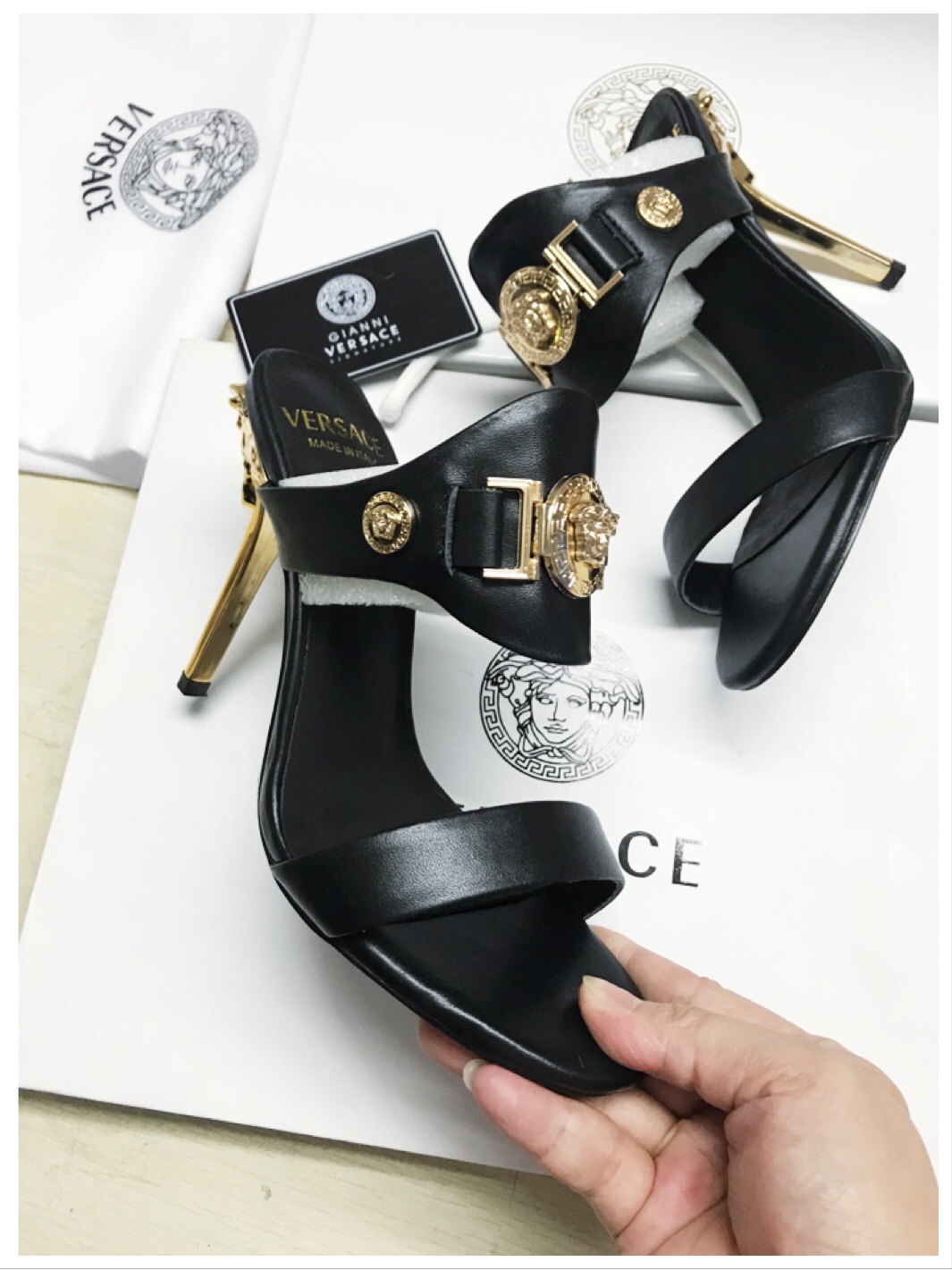 这款鞋子是AAAAA 1:1 质量 (非常棒). 使用了和原版一模一样的材料. 商标部分也保持了和范思哲/Versace一样. 图片拍摄是实物鞋子拍摄, 您所收到的实物保证和我们图片一模一样.
