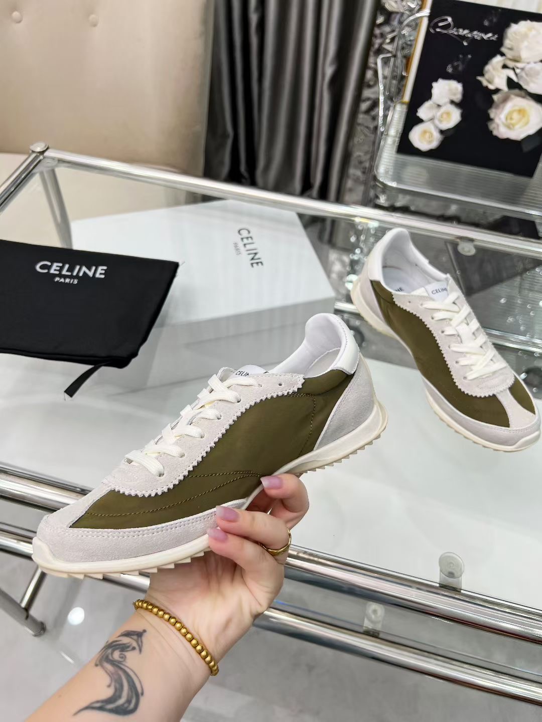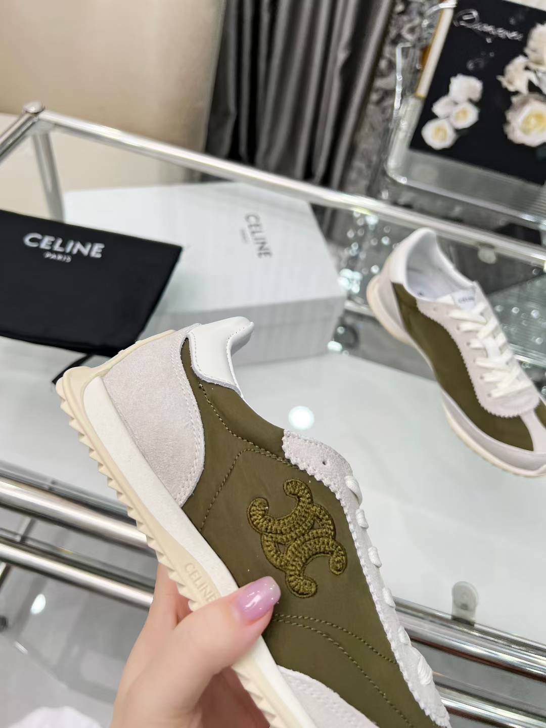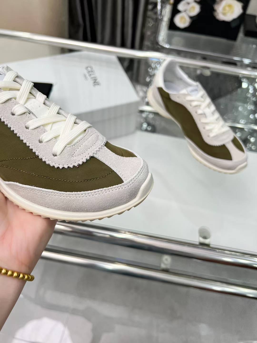 这款鞋子是AAAAA 1:1 质量 (非常棒). 使用了和原版一模一样的材料. 商标部分也保持了和思琳/Celine一样. 图片拍摄是实物鞋子拍摄, 您所收到的实物保证和我们图片一模一样.