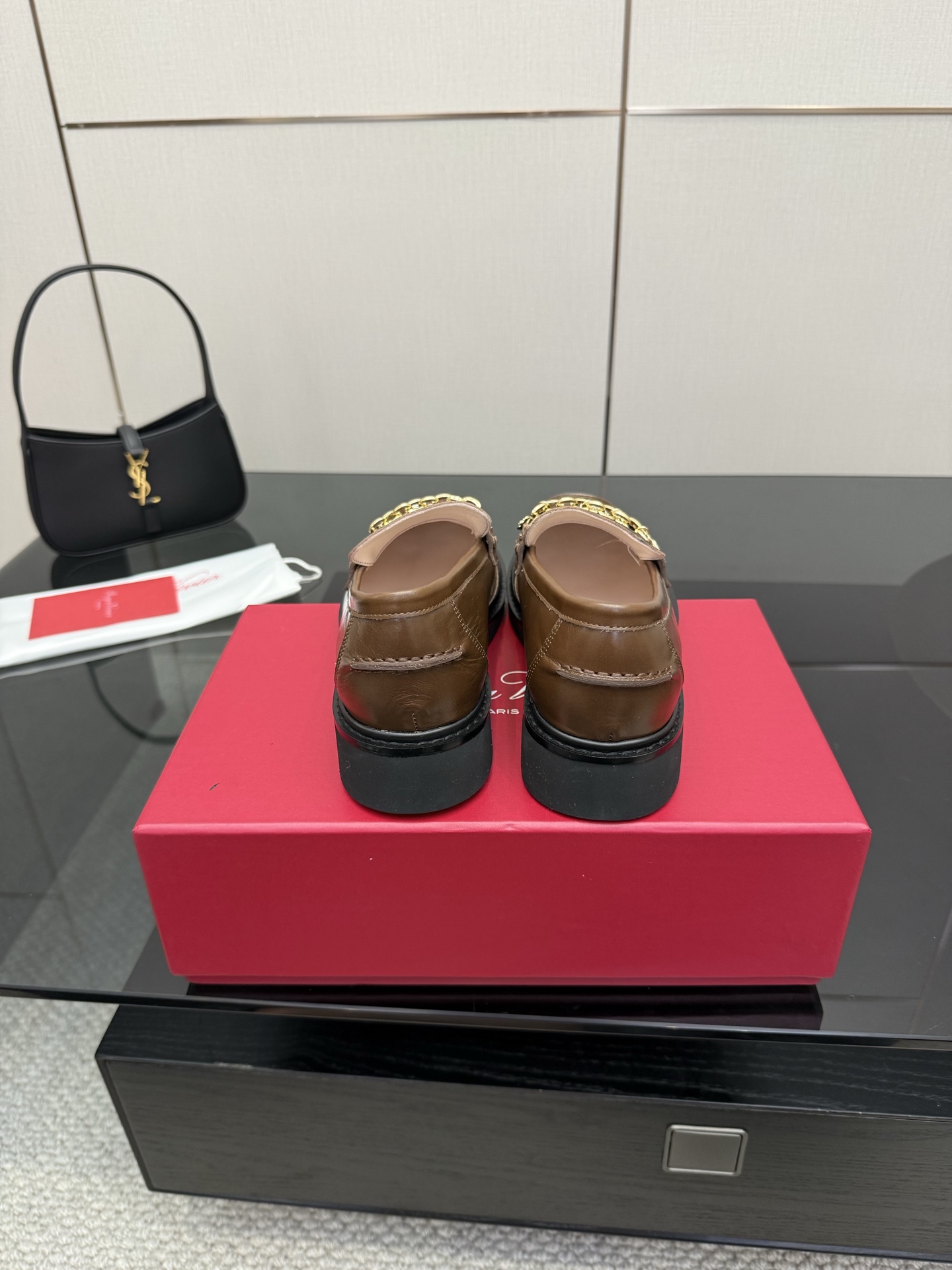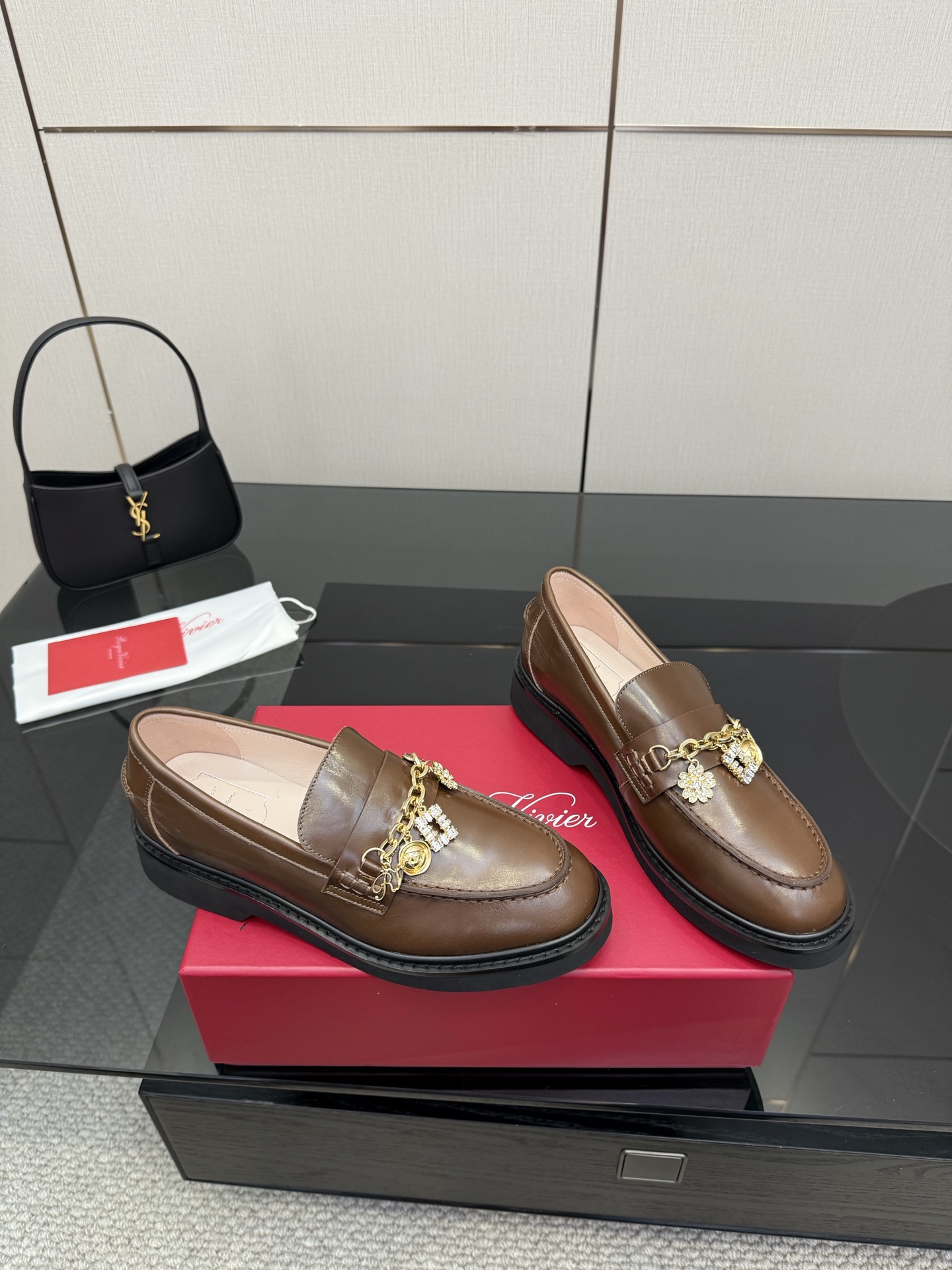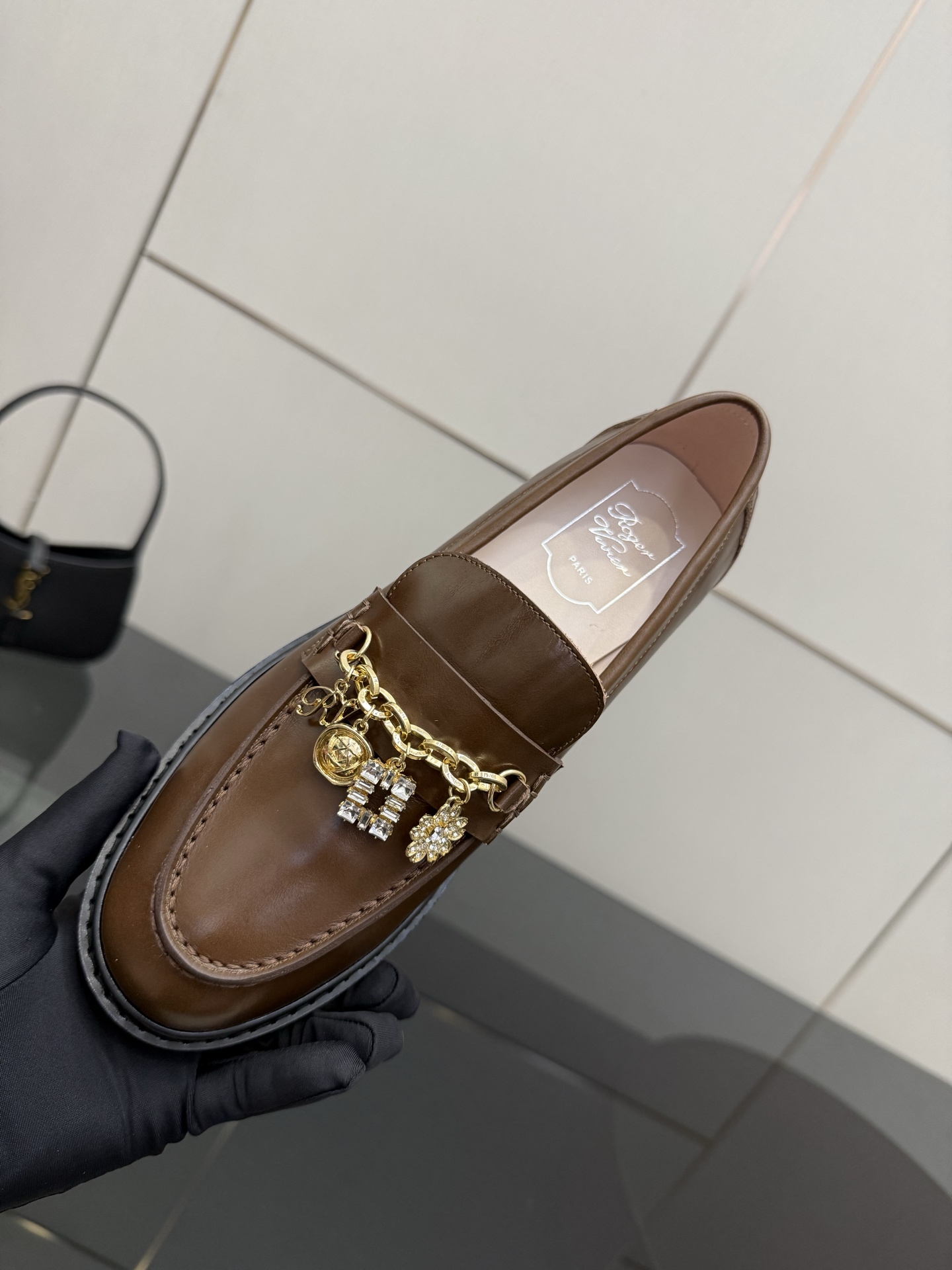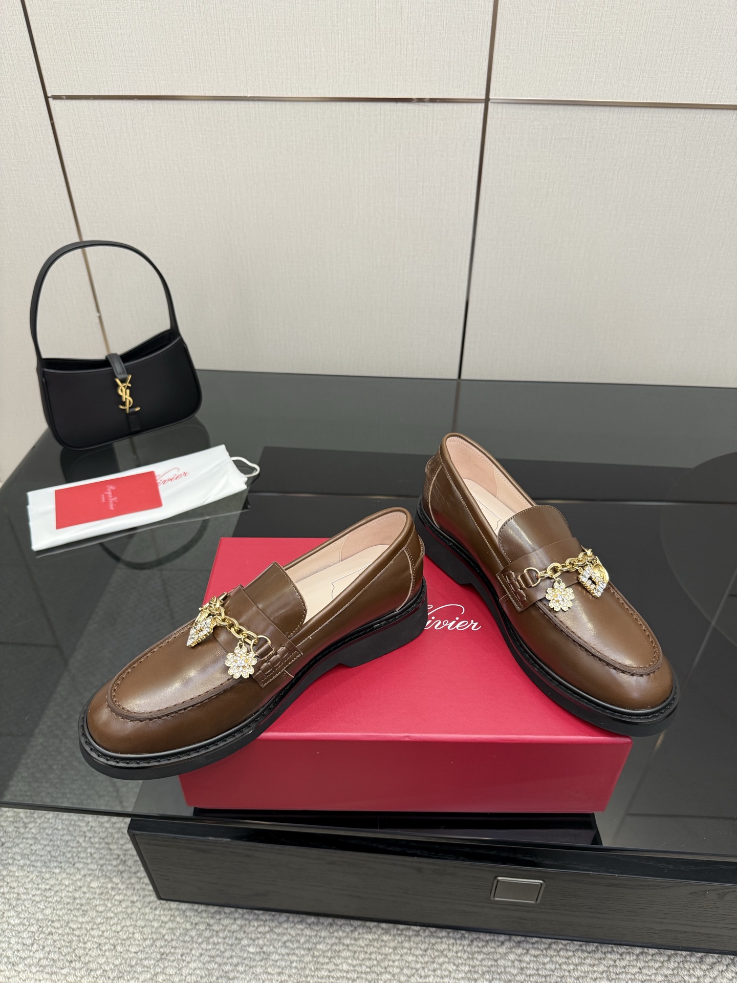 这款鞋子是AAAAA 1:1 质量 (非常棒). 使用了和原版一模一样的材料. 商标部分也保持了和罗杰维维耶/Roger Vivier一样. 图片拍摄是实物鞋子拍摄, 您所收到的实物保证和我们图片一模一样.
