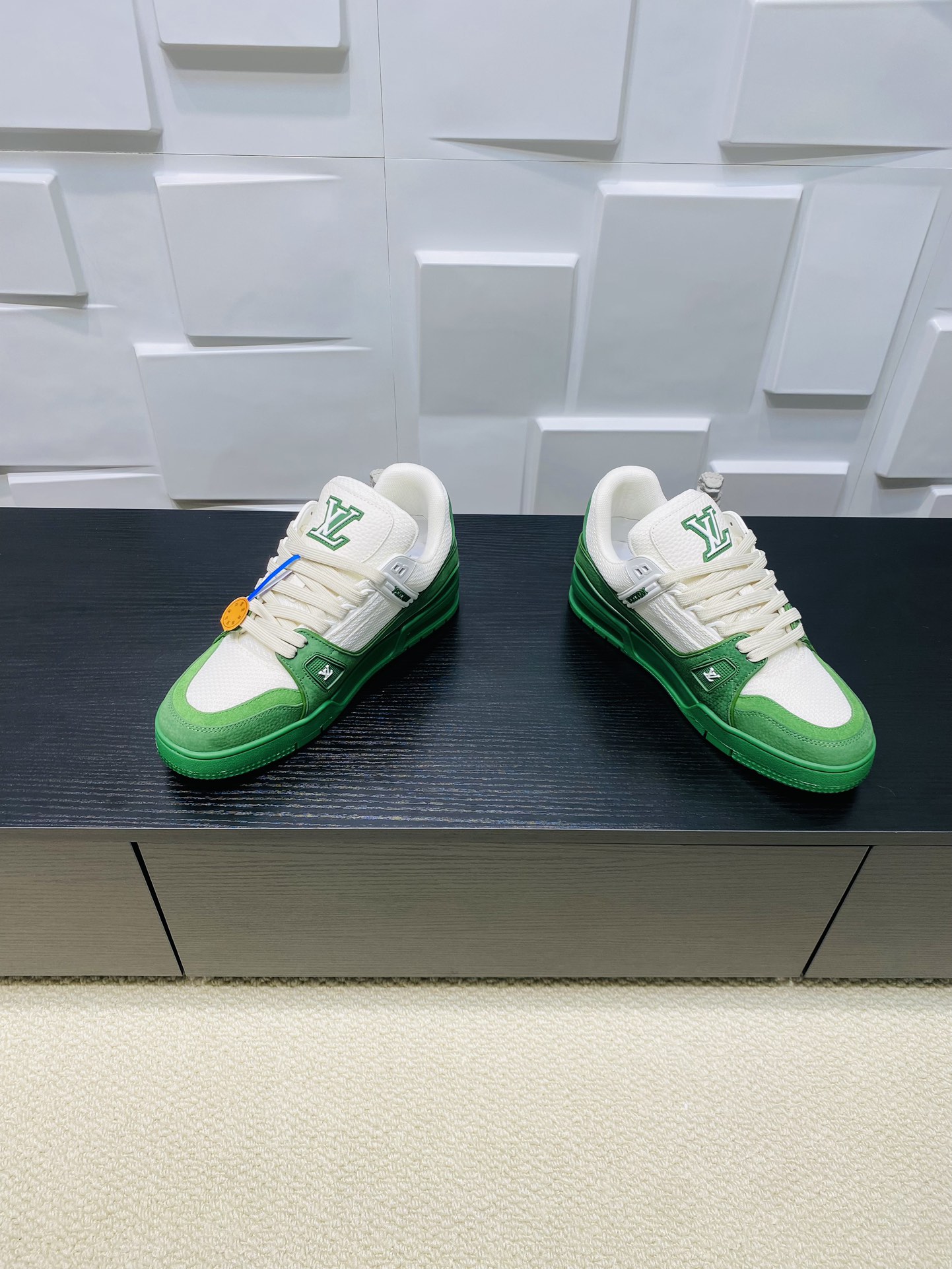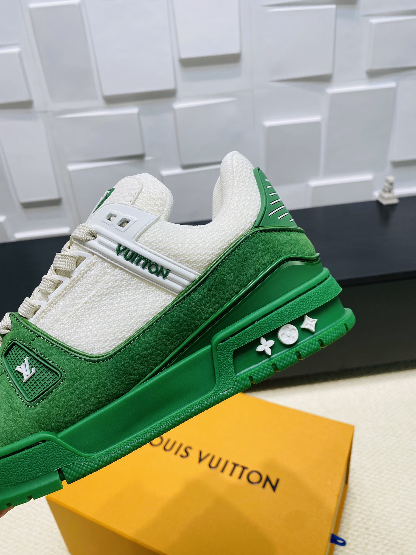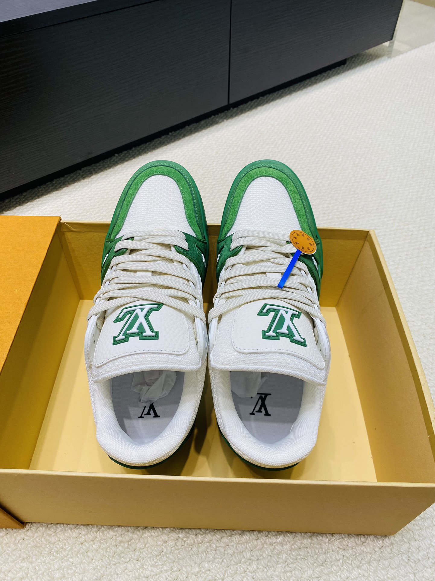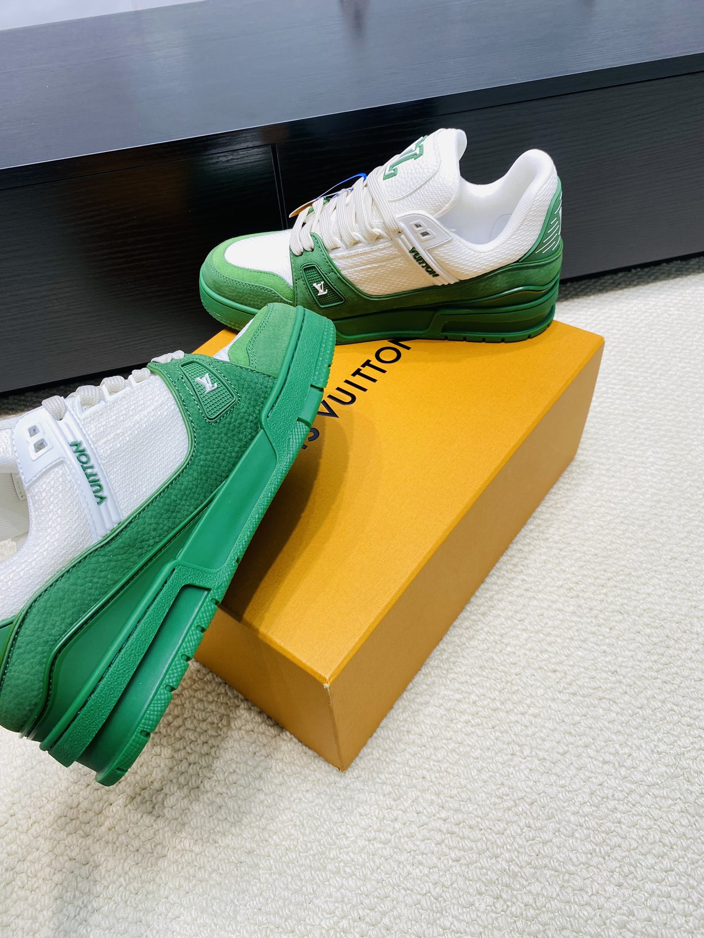 这款鞋子是AAAAA 1:1 质量 (非常棒). 使用了和原版一模一样的材料. 商标部分也保持了和路易威登/Louis Vuitton一样. 图片拍摄是实物鞋子拍摄, 您所收到的实物保证和我们图片一模一样.